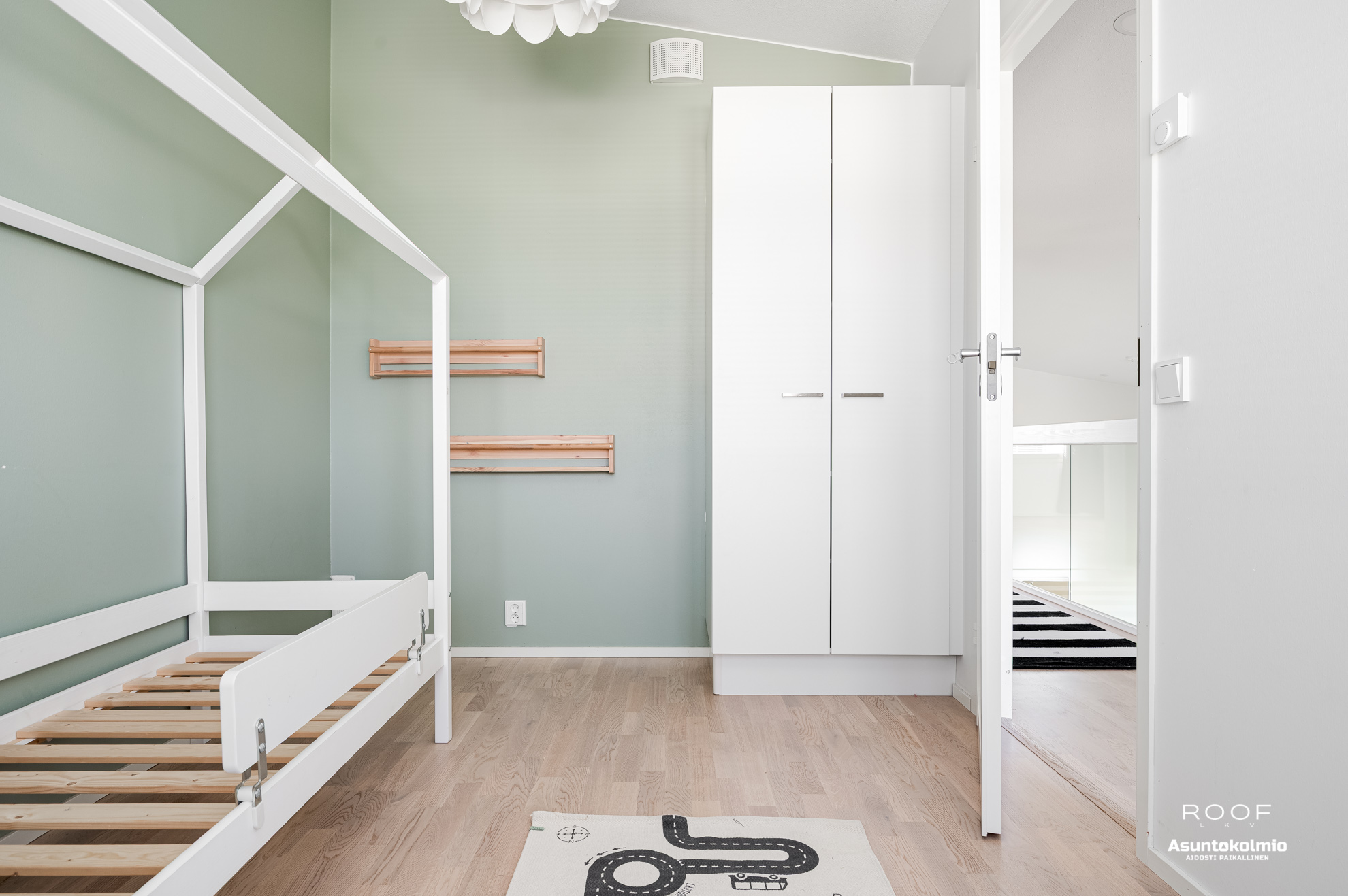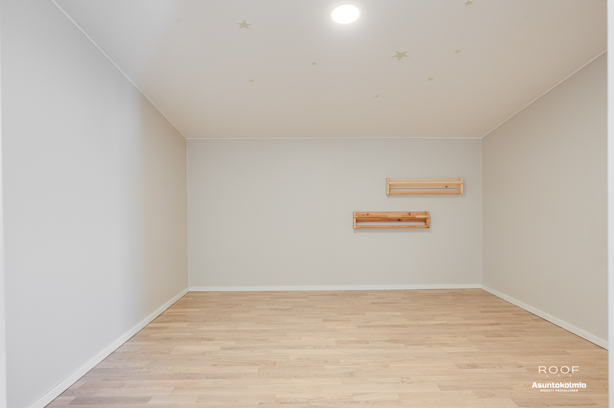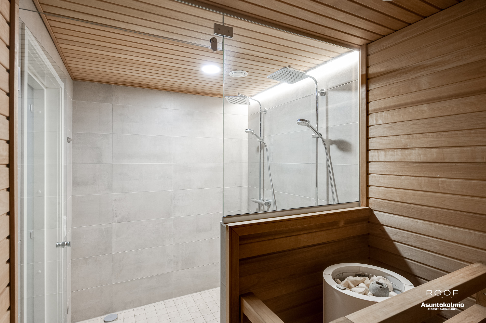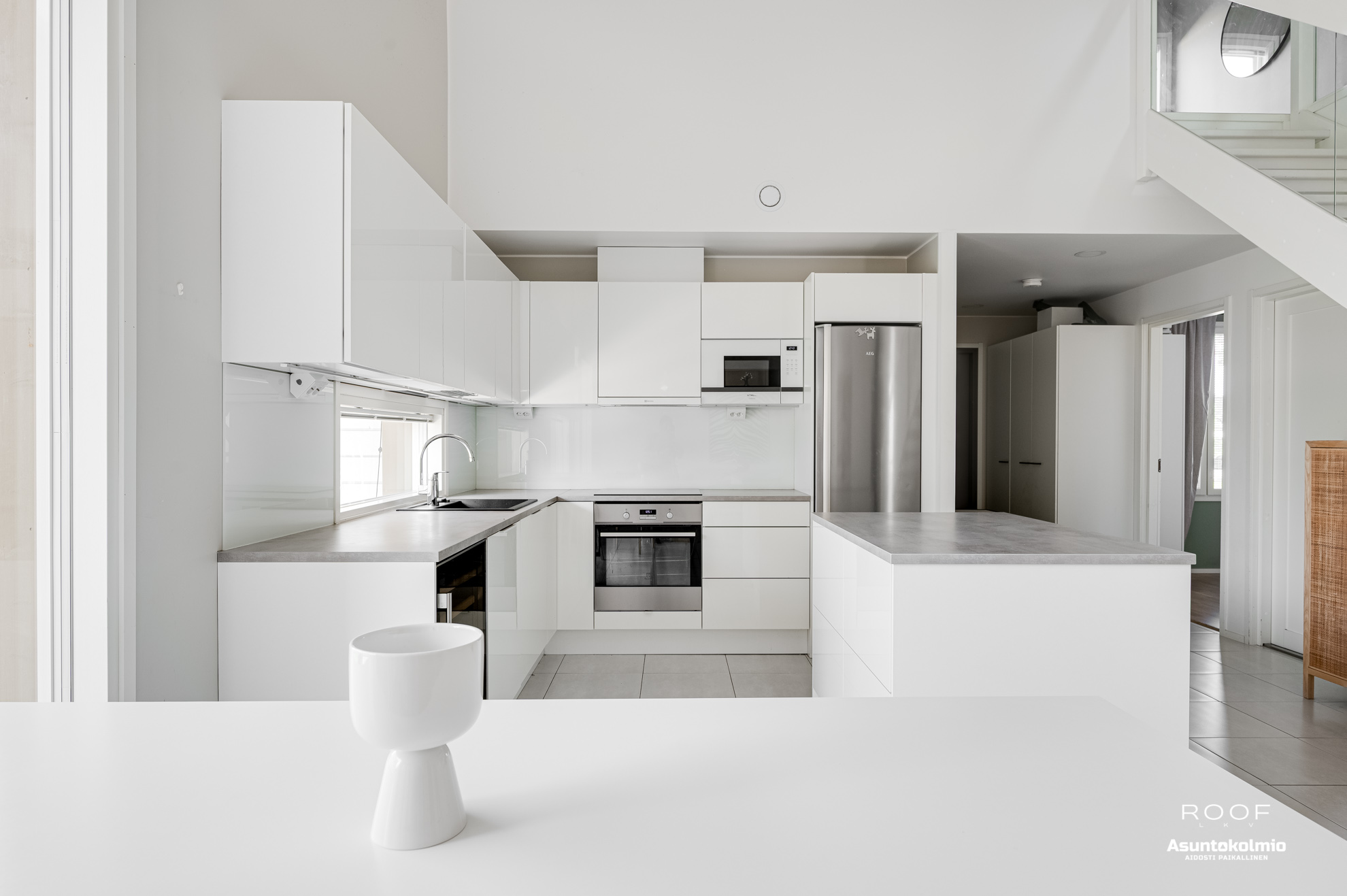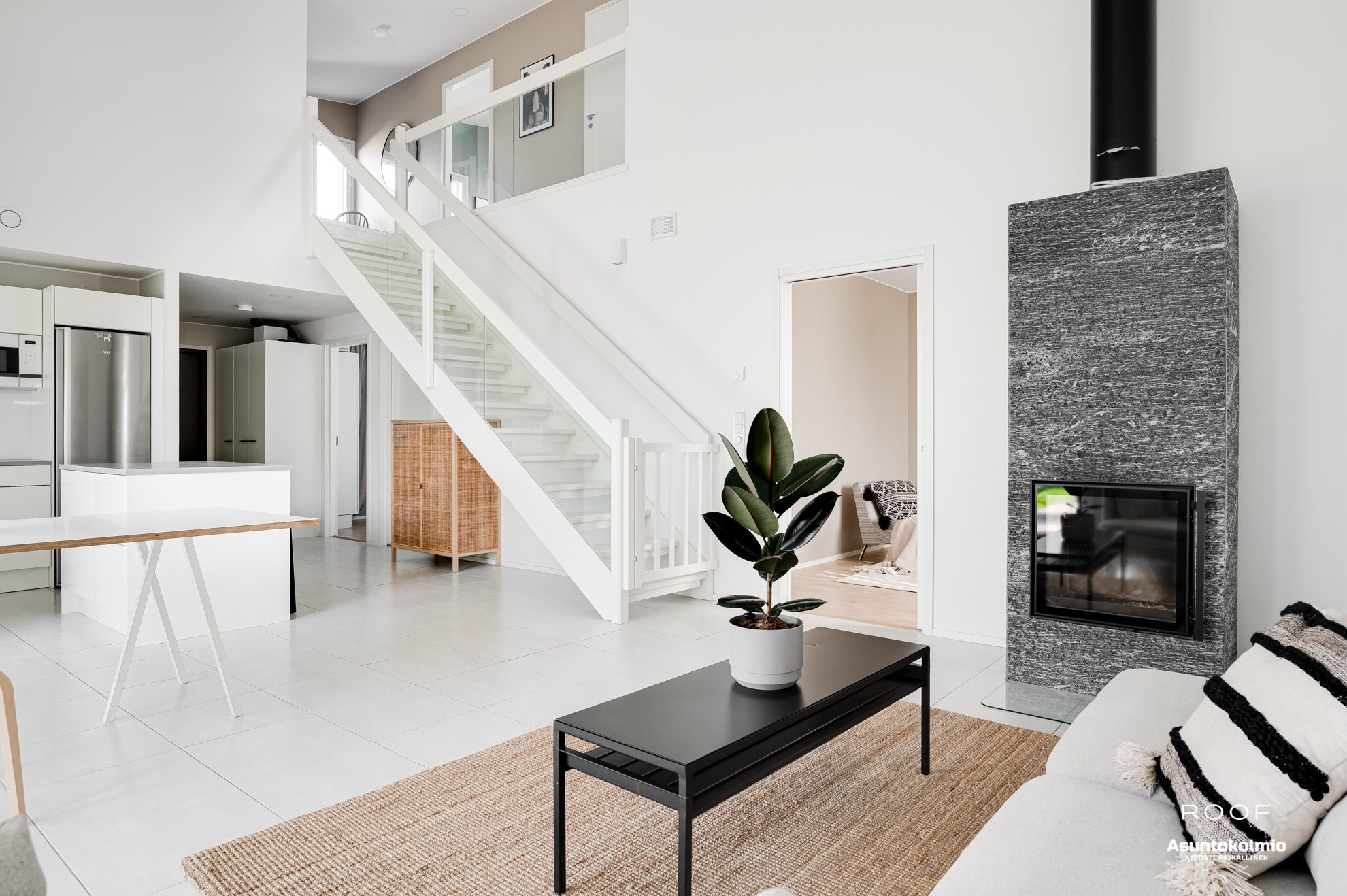 Tästä kodista ei puutu oikein mitään. Löytyy neljä riittävän suurta makuuhuonetta, todella suuri vaatehuone, jota voi tarvittaessa hyödyntää myös makuuhuoneena, suuri eteistila, Puustellin toimiva keittiö, josta ei lasku- tai kaappitila lopu kesken, erillinen kodinhoitohuone, kaksi kylpyhuonetta ym. Asuntoon on tehty runsaasti muutostöitä jo rakennusvaiheessa, ja ne näkyvät niin materiaaleissa kuin kalusteissakin. Yläkerran aulan jatkoksi on toteutettu osittain matalampaa tilaa oleva todella suuri vaatehuone, jonka ansiosta huoneiston neliöt ovat vieläpä hieman virallista suuremmat.