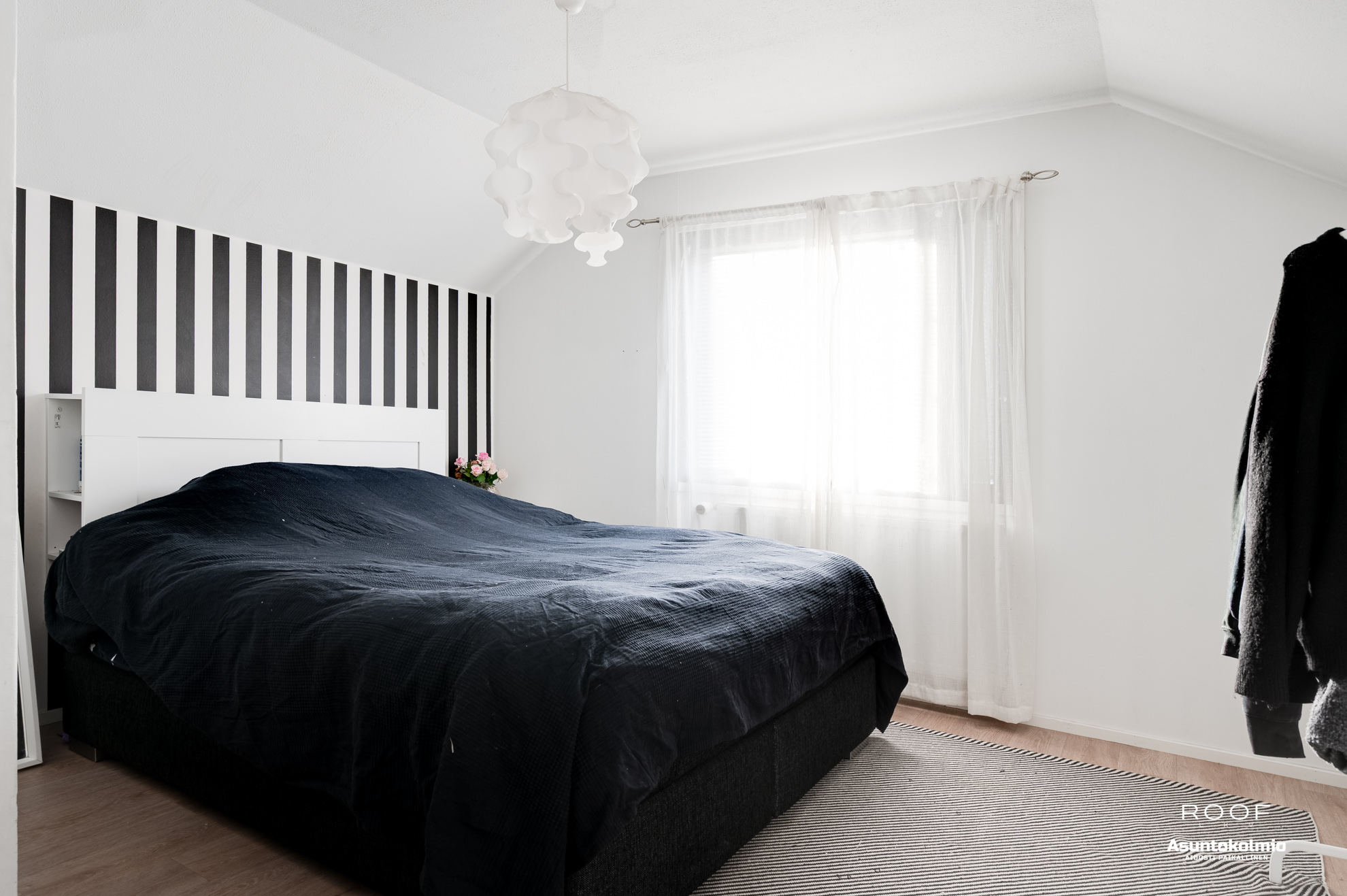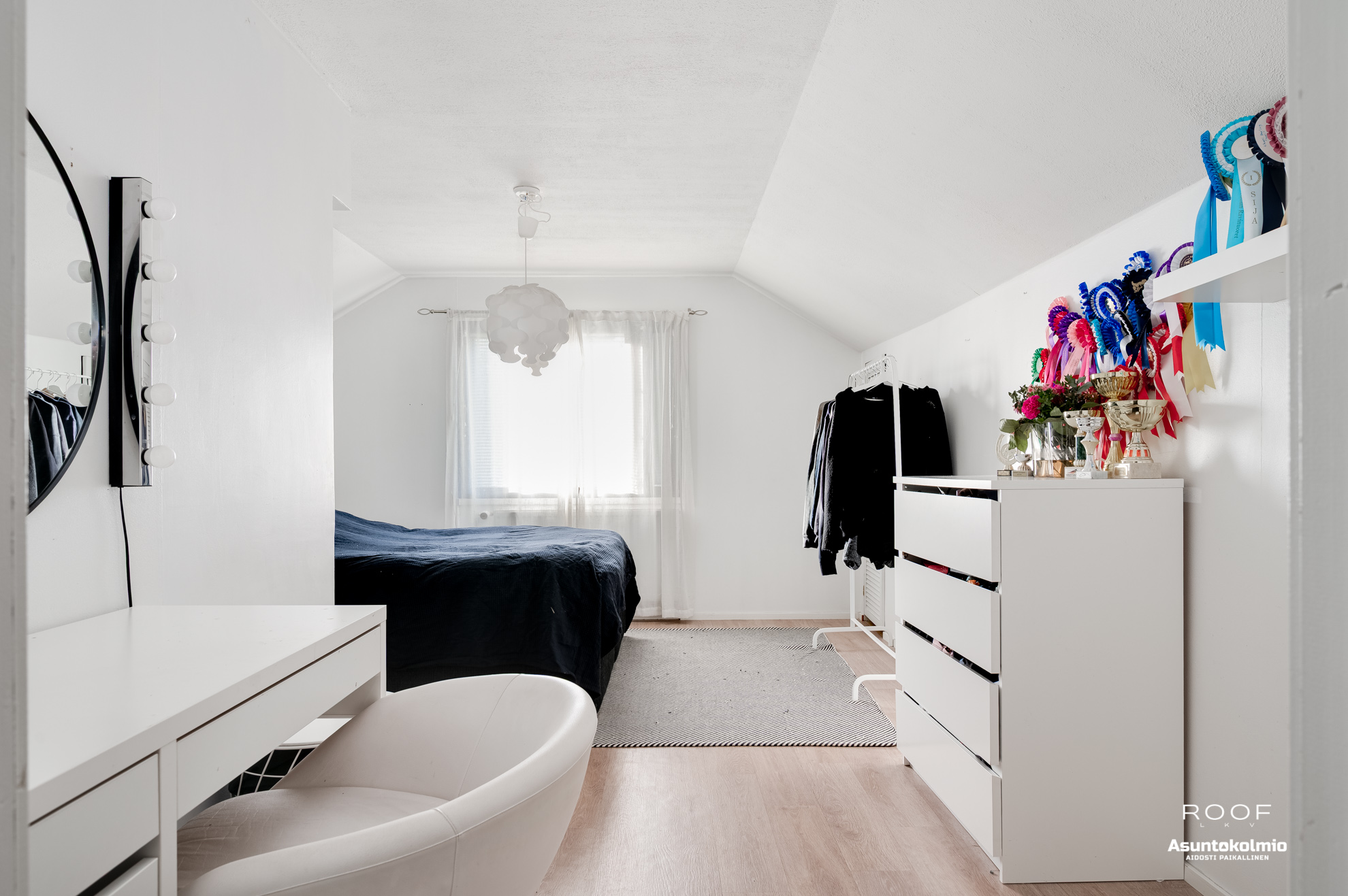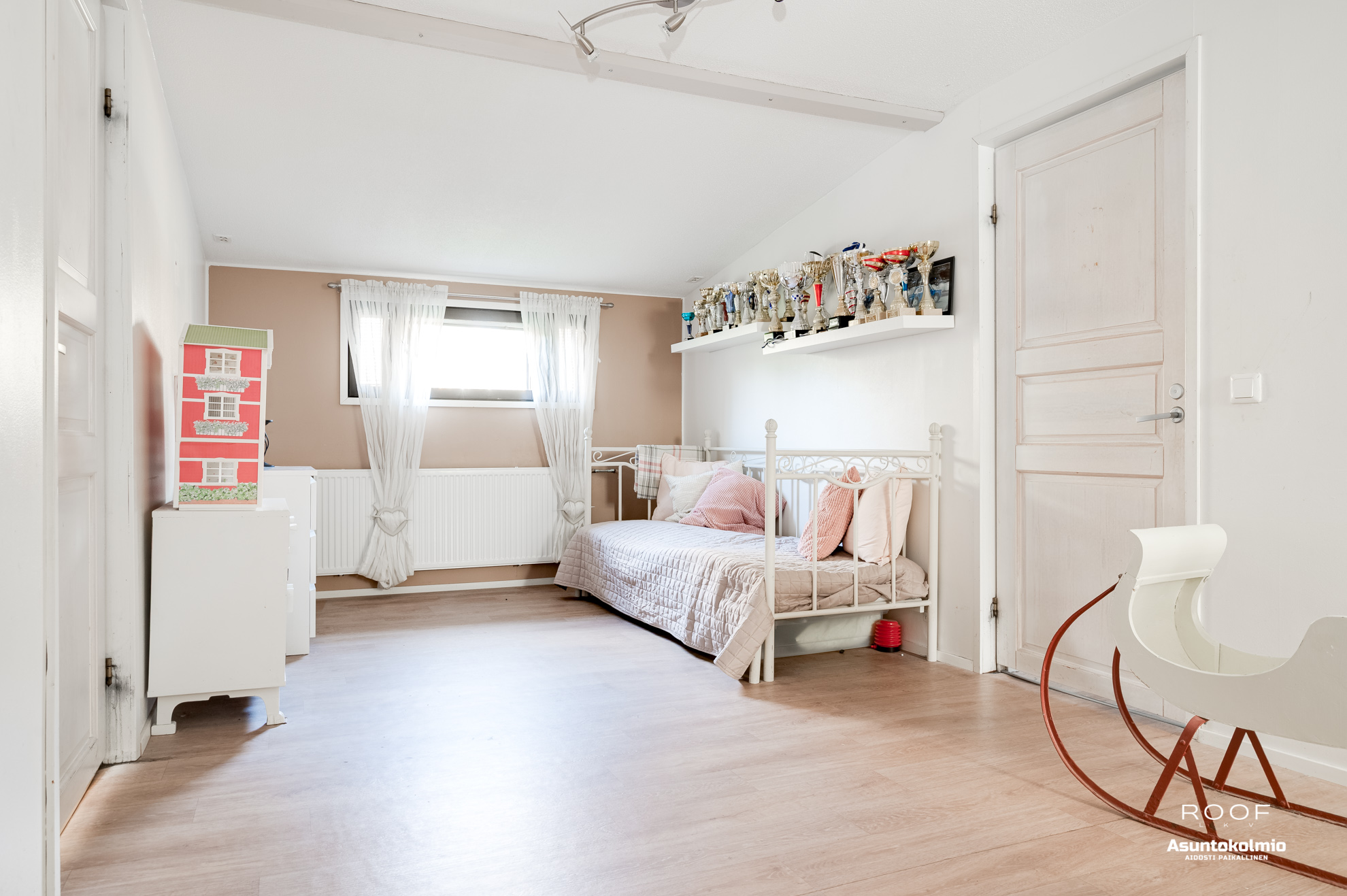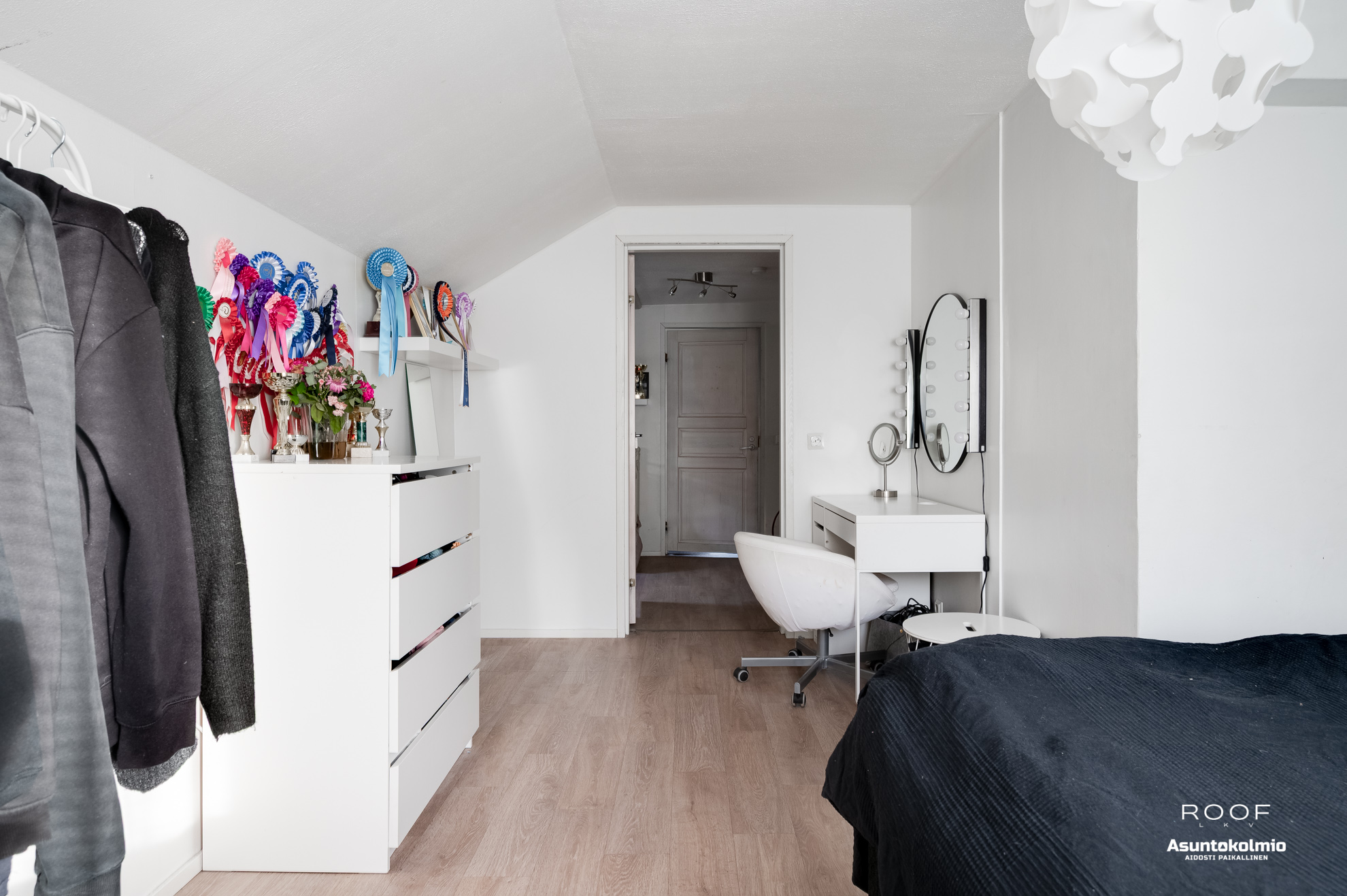 Yläkerrassa on 2 hyvänkokoista makuuhuonetta, käyttöullakkoineen ja vaatehuoneineen, sekä tilava aula ja parveke. Kellarissa on tekninen tila ja varastotilaa, johon halutessaan saa vaikka oman kotikuntosalin. Säilytystilaa kodissa on poikkeuksellisen runsaasti.