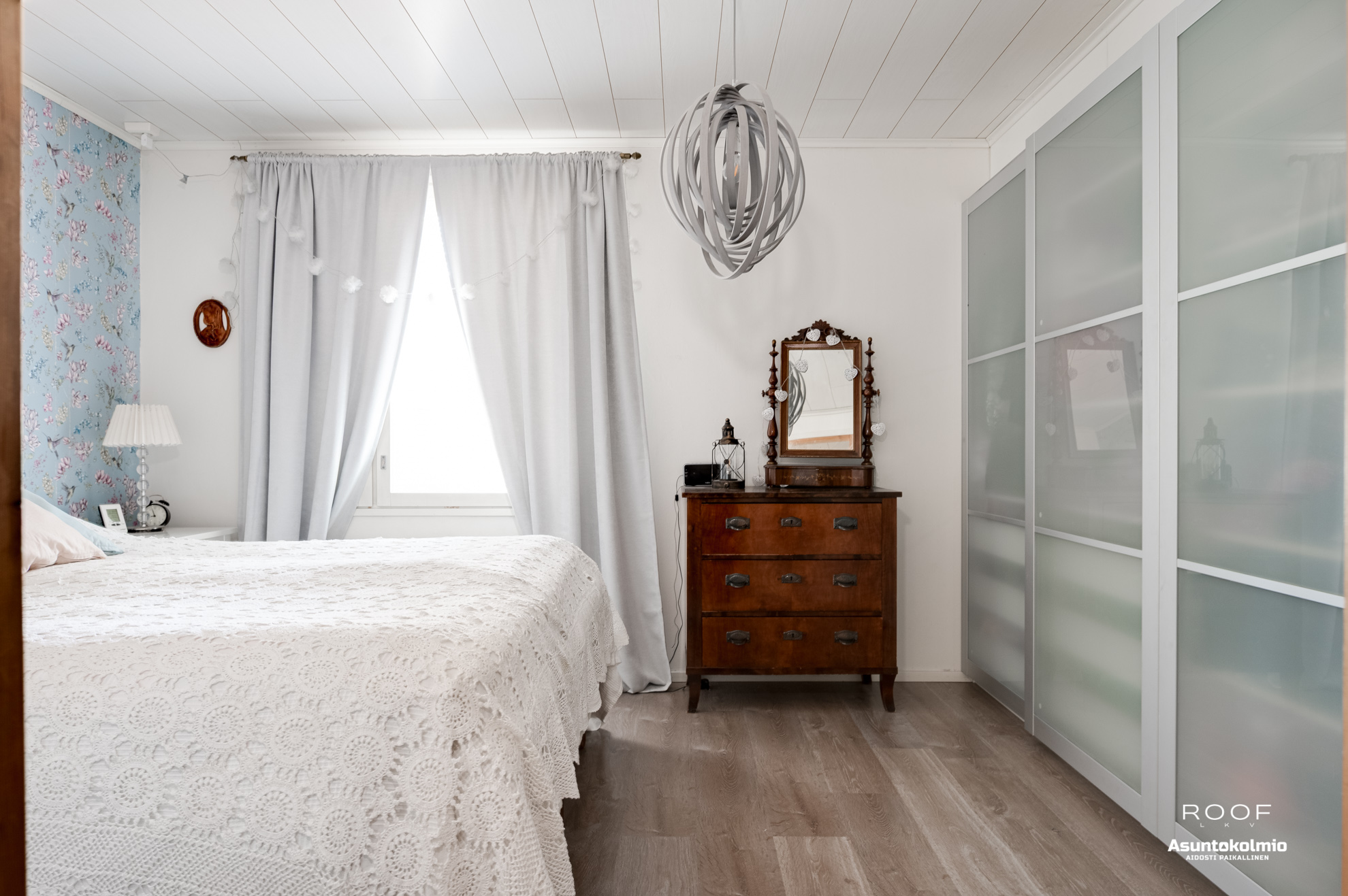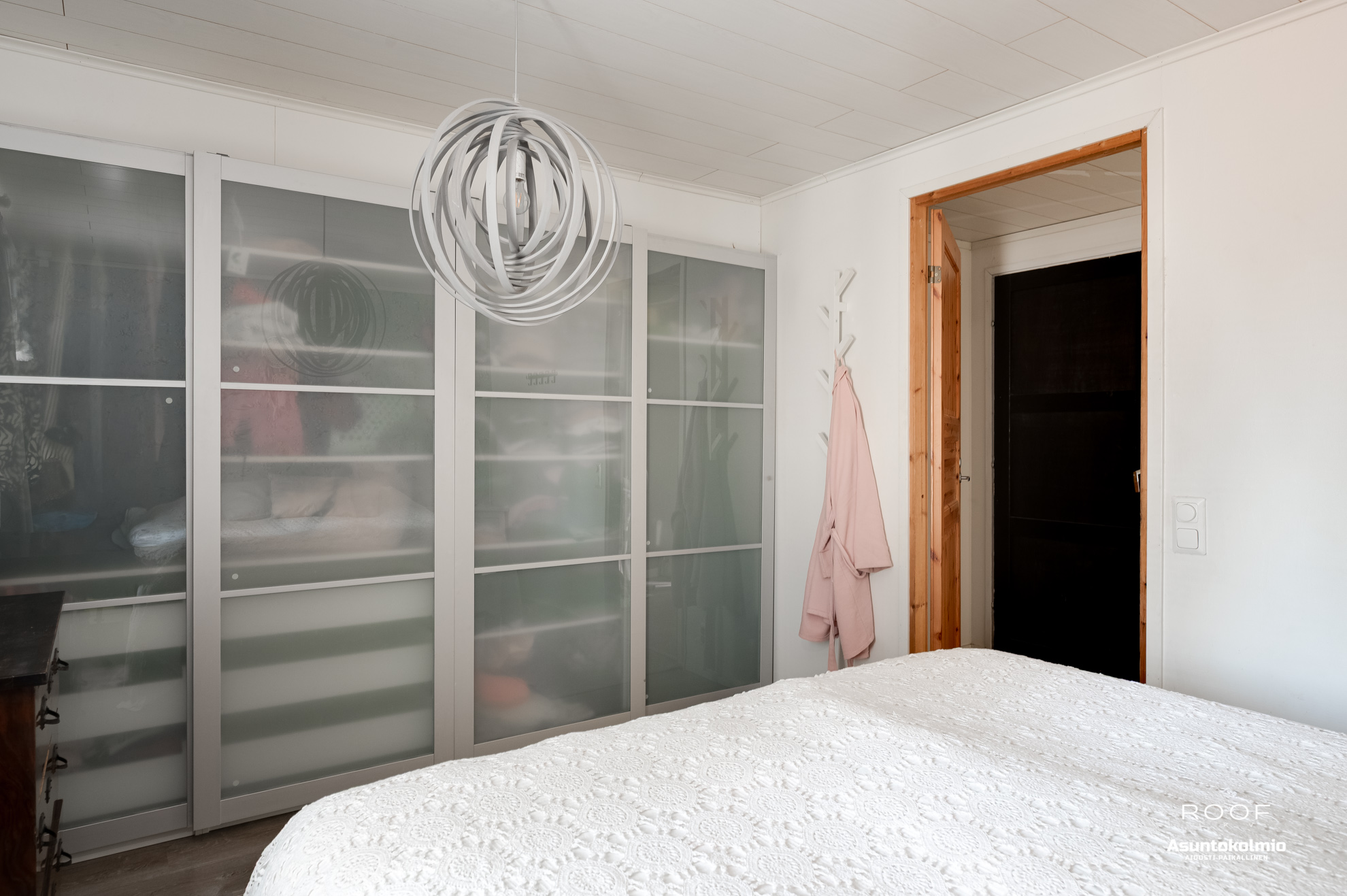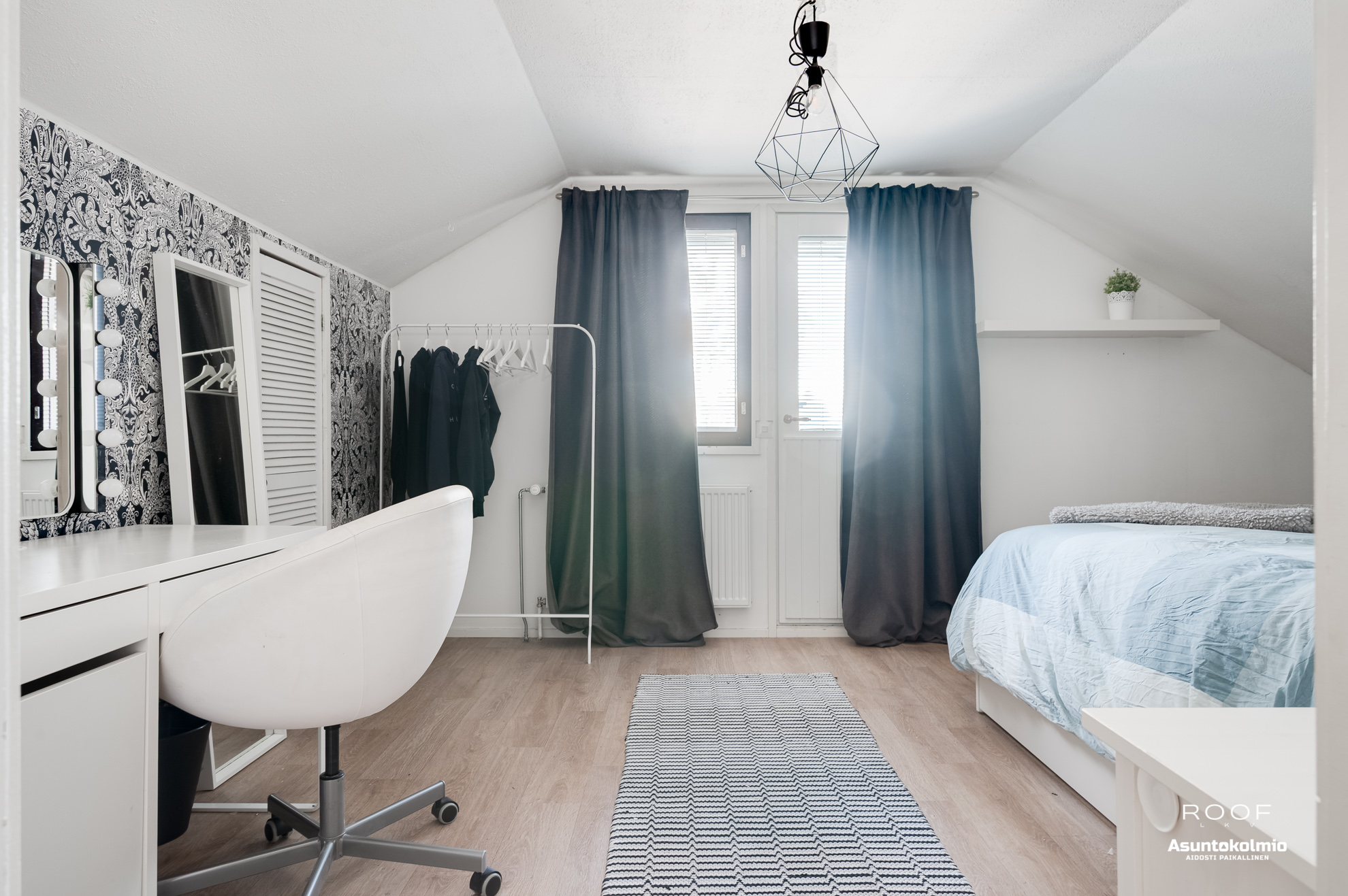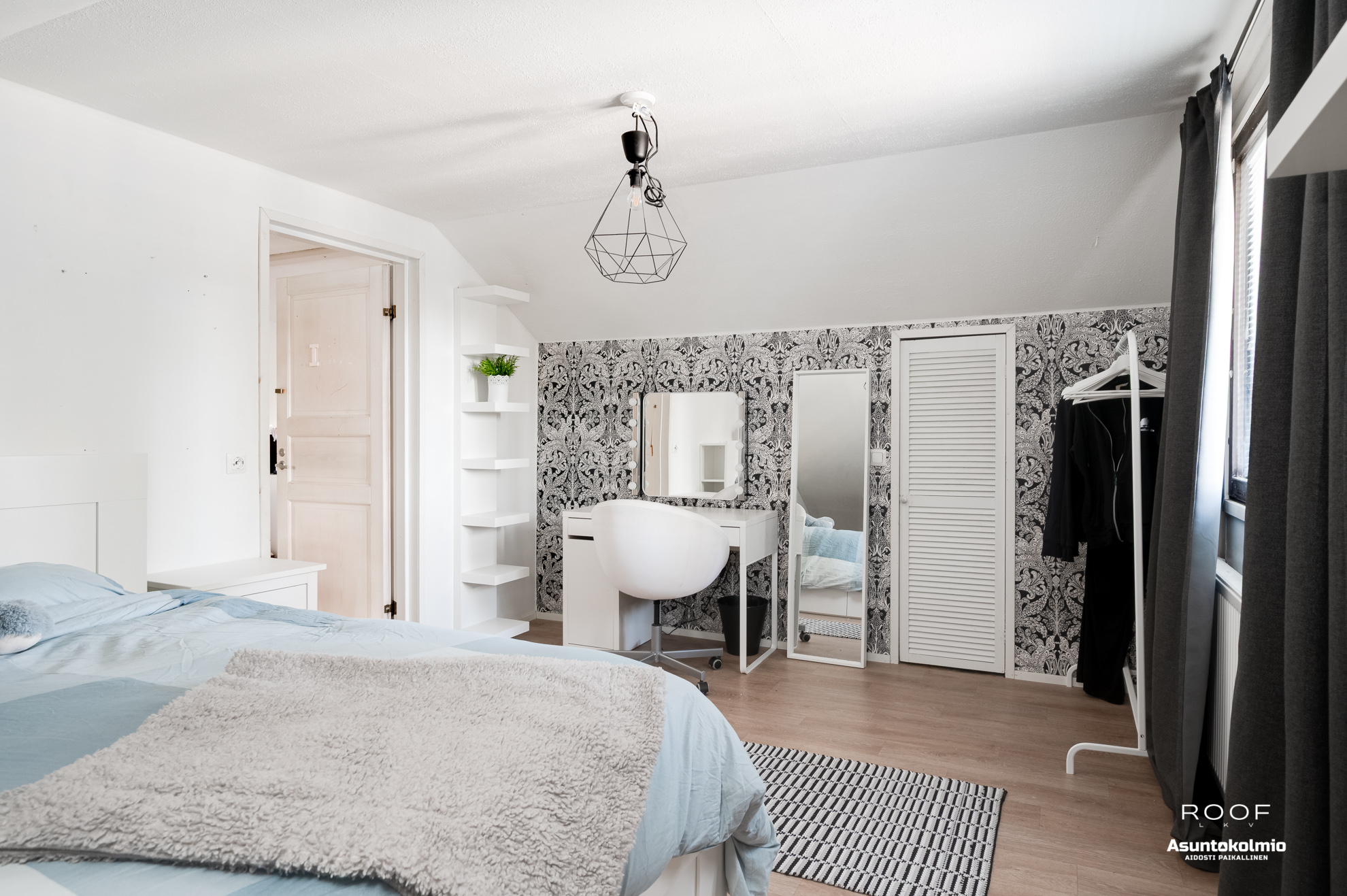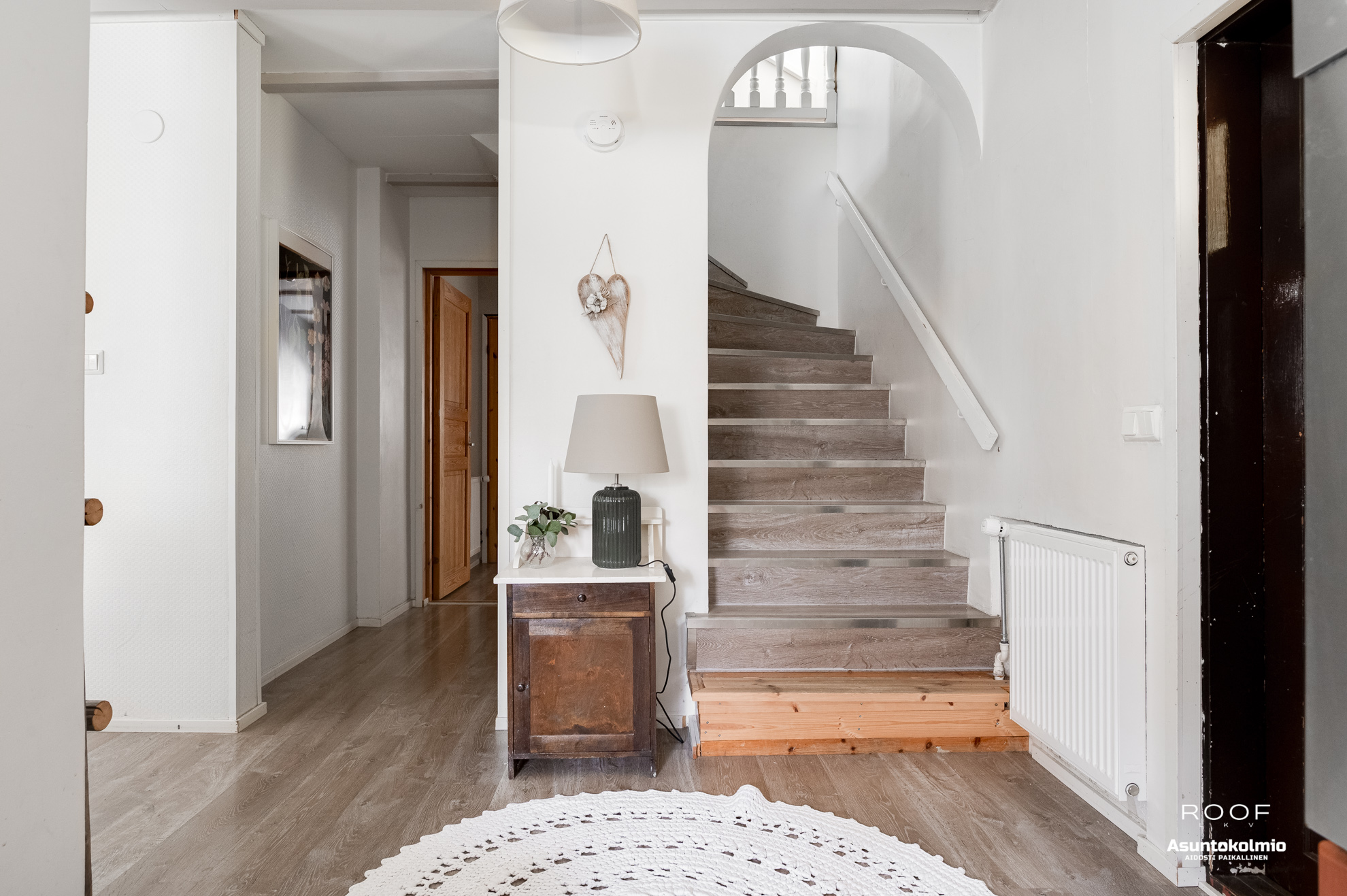 Yläkerrassa on 2 hyvänkokoista makuuhuonetta, käyttöullakkoineen ja vaatehuoneineen, sekä tilava aula ja parveke. Kellarissa on tekninen tila ja varastotilaa, johon halutessaan saa vaikka oman kotikuntosalin. Säilytystilaa kodissa on poikkeuksellisen runsaasti.