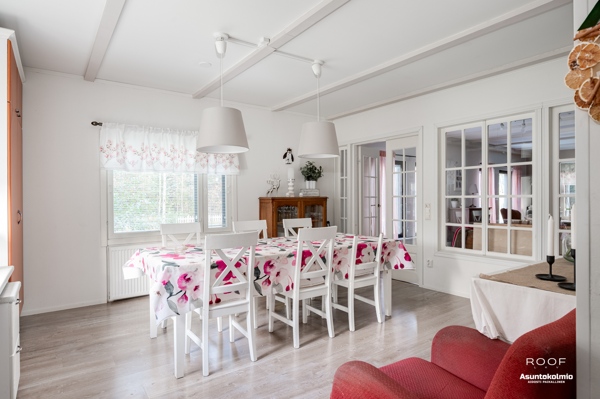 Aivan merenrannan ja Kiiminkijoen läheisyydessä sijaitseva omakotitalo on perinteitä kunnioittavan ja luonnonläheisen perheen valinta. Asuinrakennus tarjoaa mukavasti tilaa isommallekin perheelle. Olohuone on poikkeuksellisen iso ja erilliseen ruokailutilaan mahtuu isompikin ruokapöytä. Keittiössä on perinteikäs puuliesi ja entinen sisääntulokuisti on muutettu kodinhoitotilaksi. Laajennusosassa on vanhempien makuuhuone, nykyaikainen kylpyhuone ja sauna sekä varastotilana oleva viherhuone. Molemmissa kerroksissa on erillinen wc.
