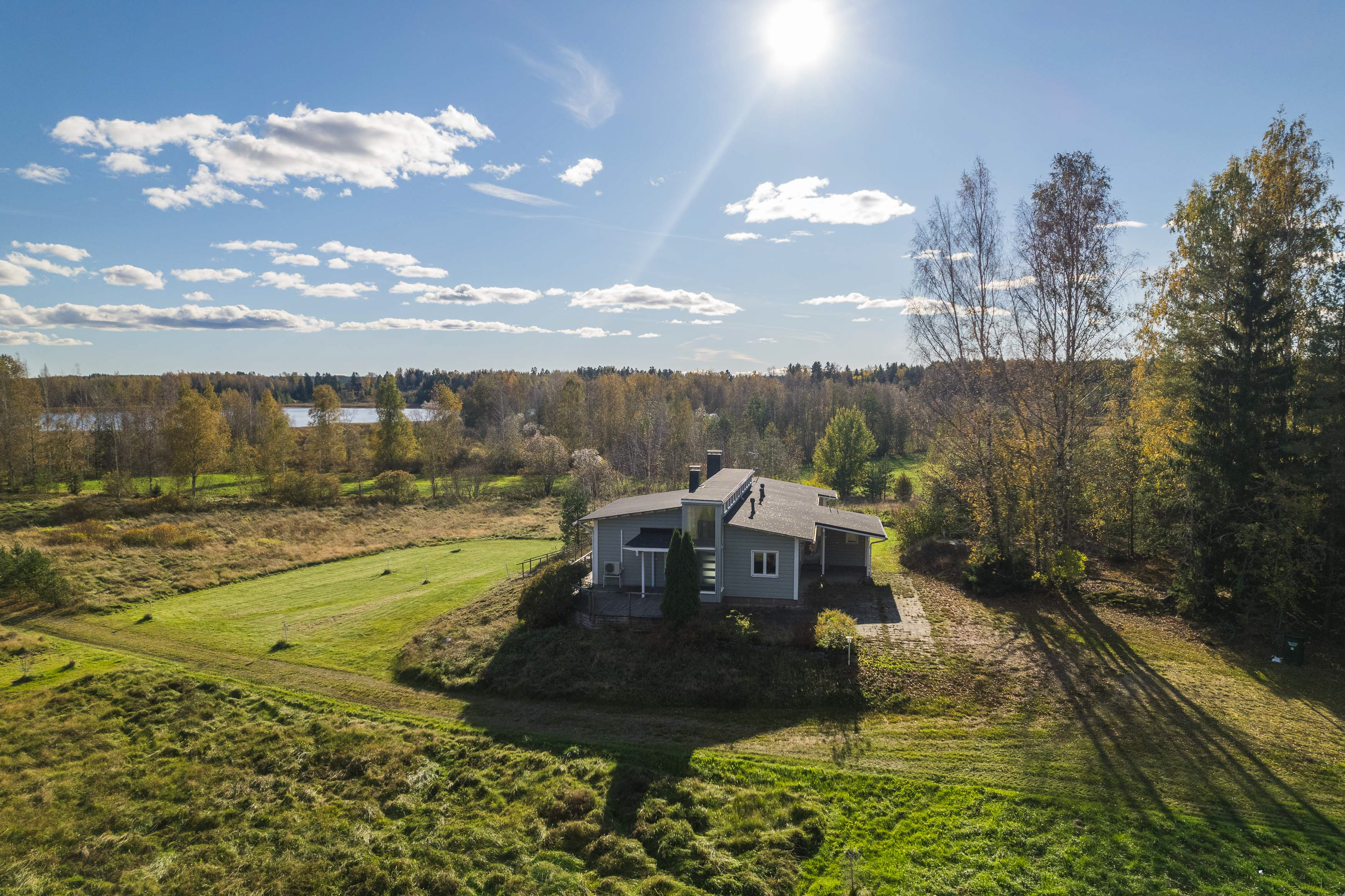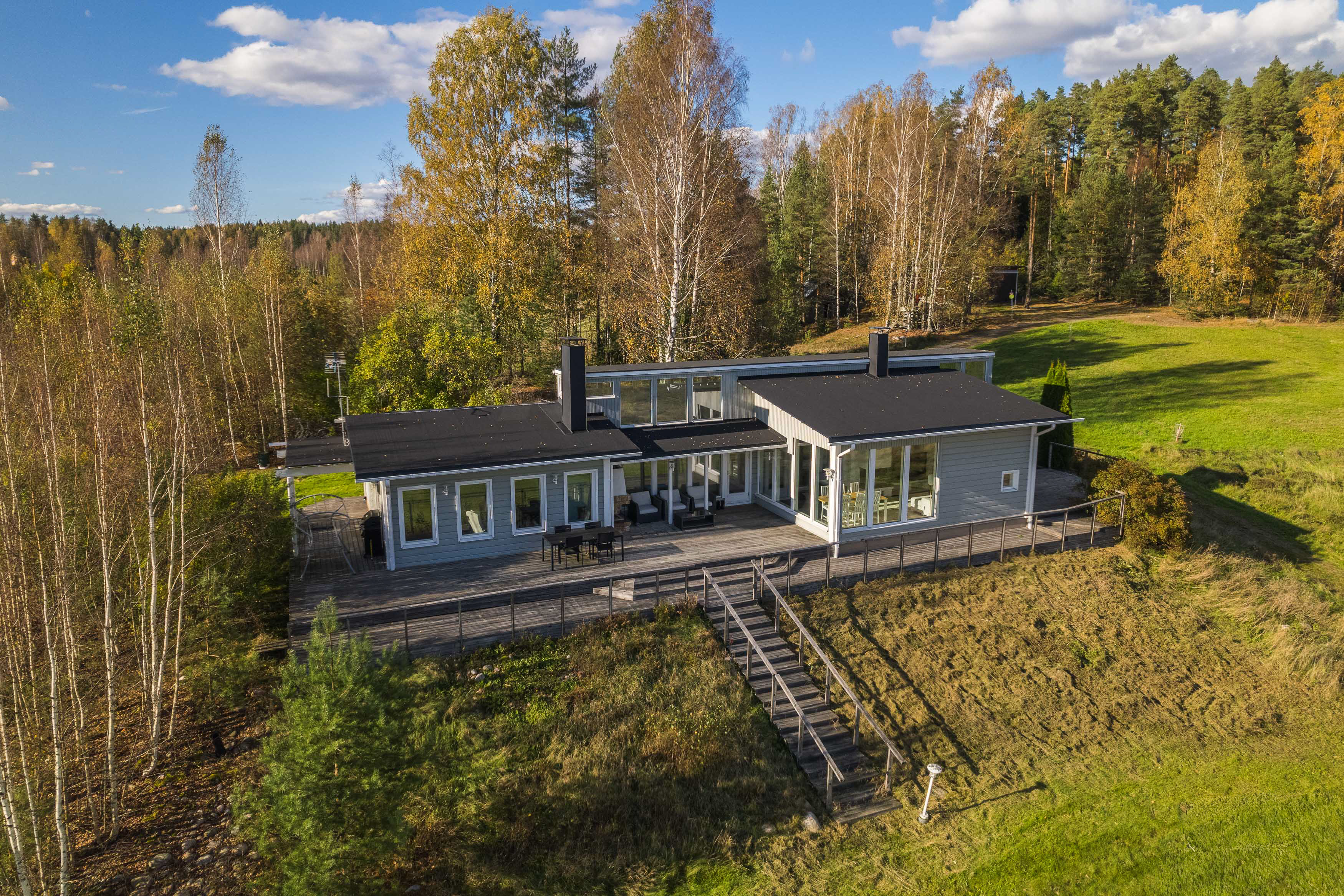 Talo on sijoitettu mäen päälle, joten lähes koko talon leveydeltä olevista ikkunoista avautuu upeat näkymät suoraan järvelle. Olohuoneessa on hulppea huonekorkeus, joka yhdistettynä kattoikkunoihin ja vaaleisiin sävyihin luo ylellisen kokonaisuuden kauniin suuren takan lisätessä tunnelmaa ja lämpöä.
