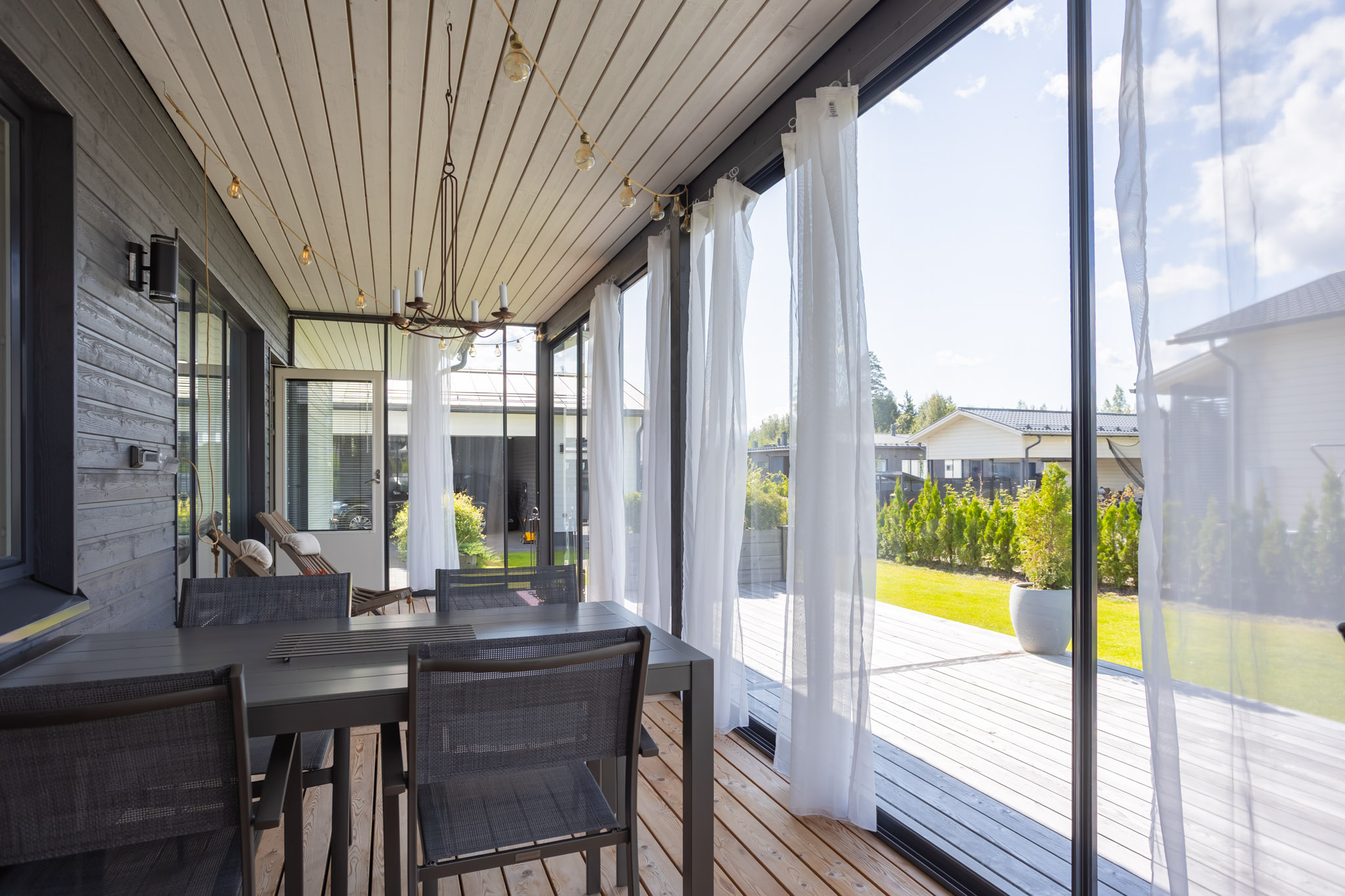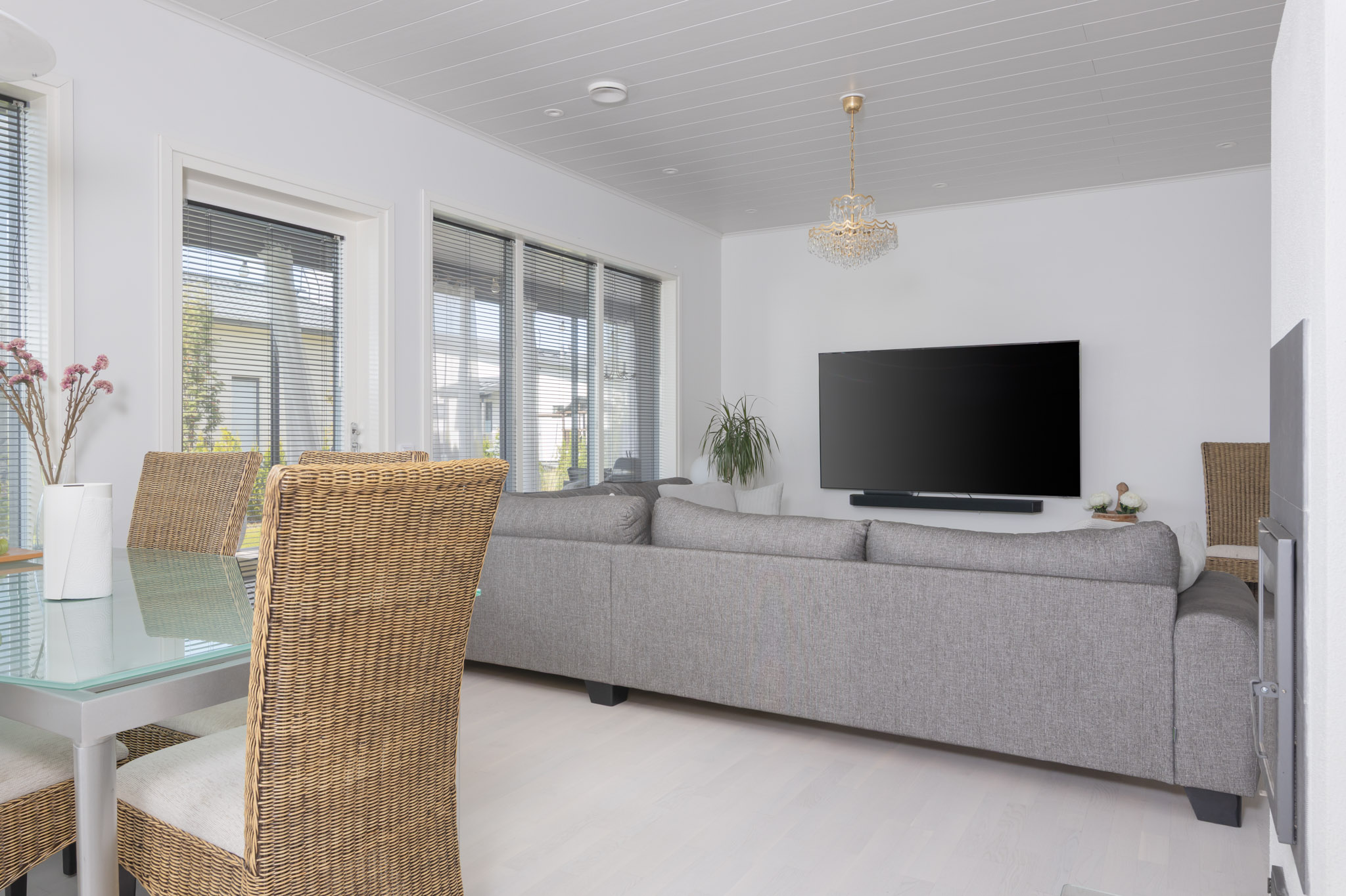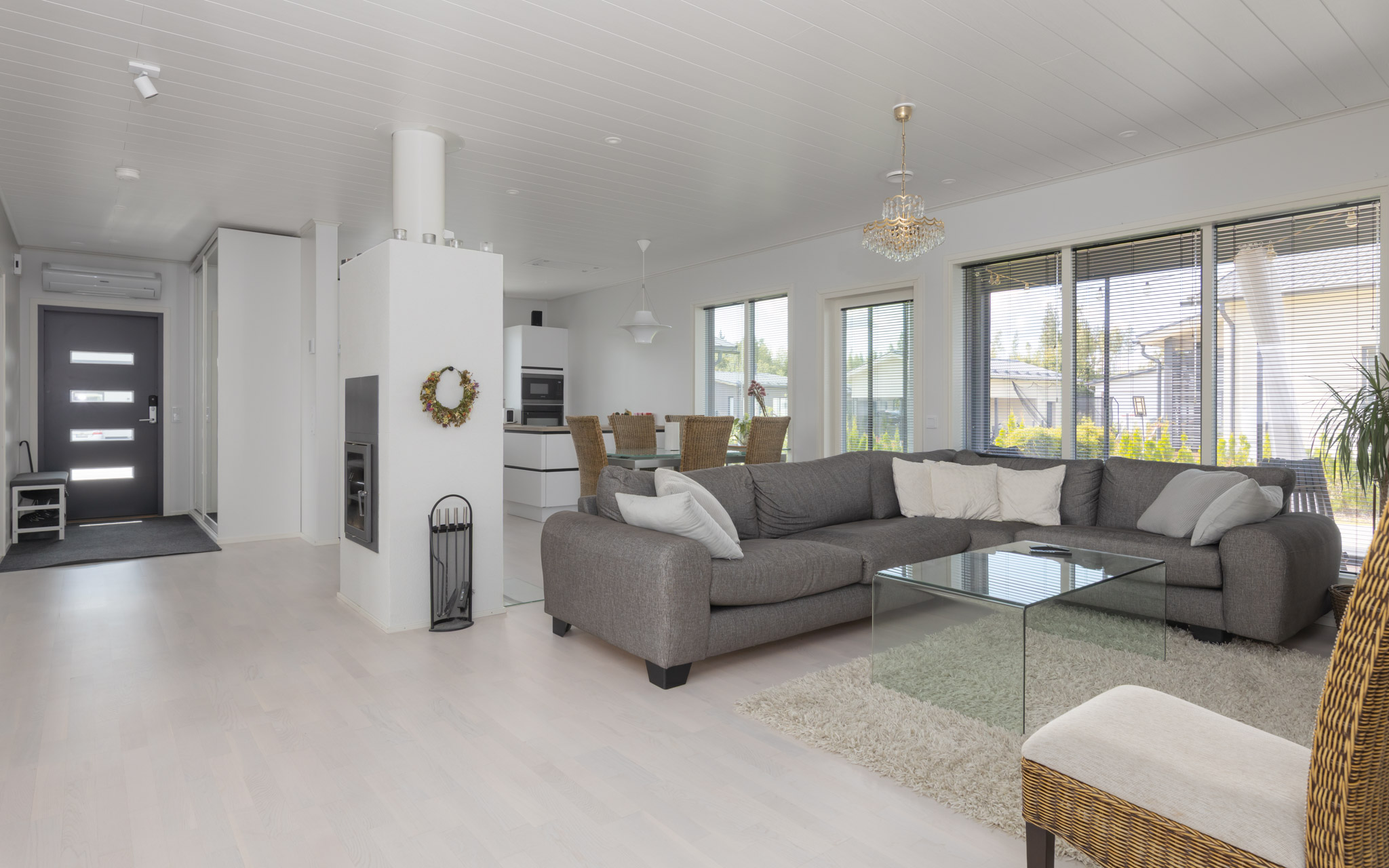 Oleskelutilat ovat valoisat ja avarat, ja olohuoneesta on suora yhteys suurelle katetulle lasitetulle terassille, joka toimii lisätilana keväästä syksyyn ja sääsuojauksen ansiosta myös viileämpinä päivinä. Varaava takka tuo lämpöä ja tunnelmaa sekä auttaa pienentämään lämmityskustannuksia.