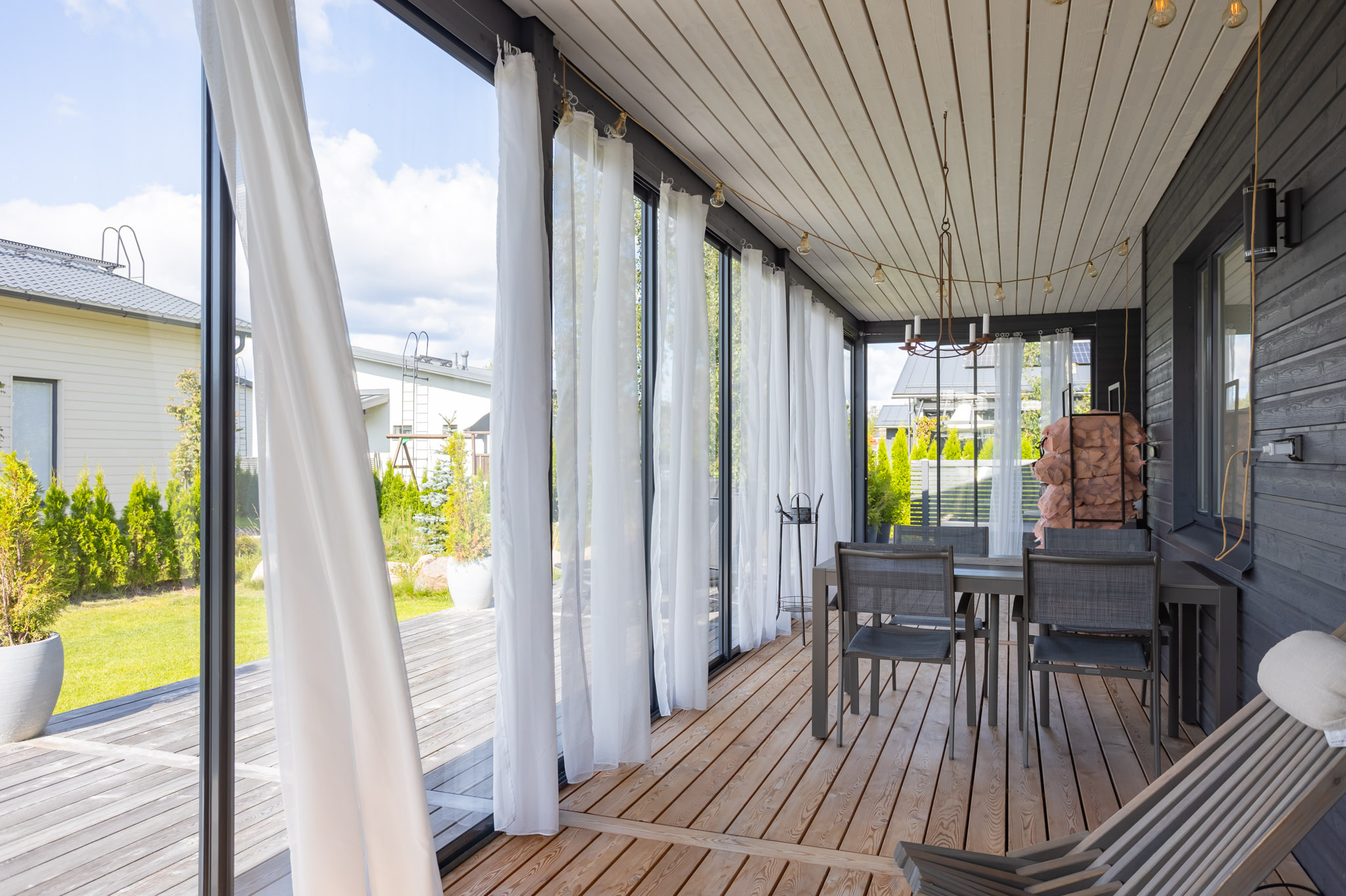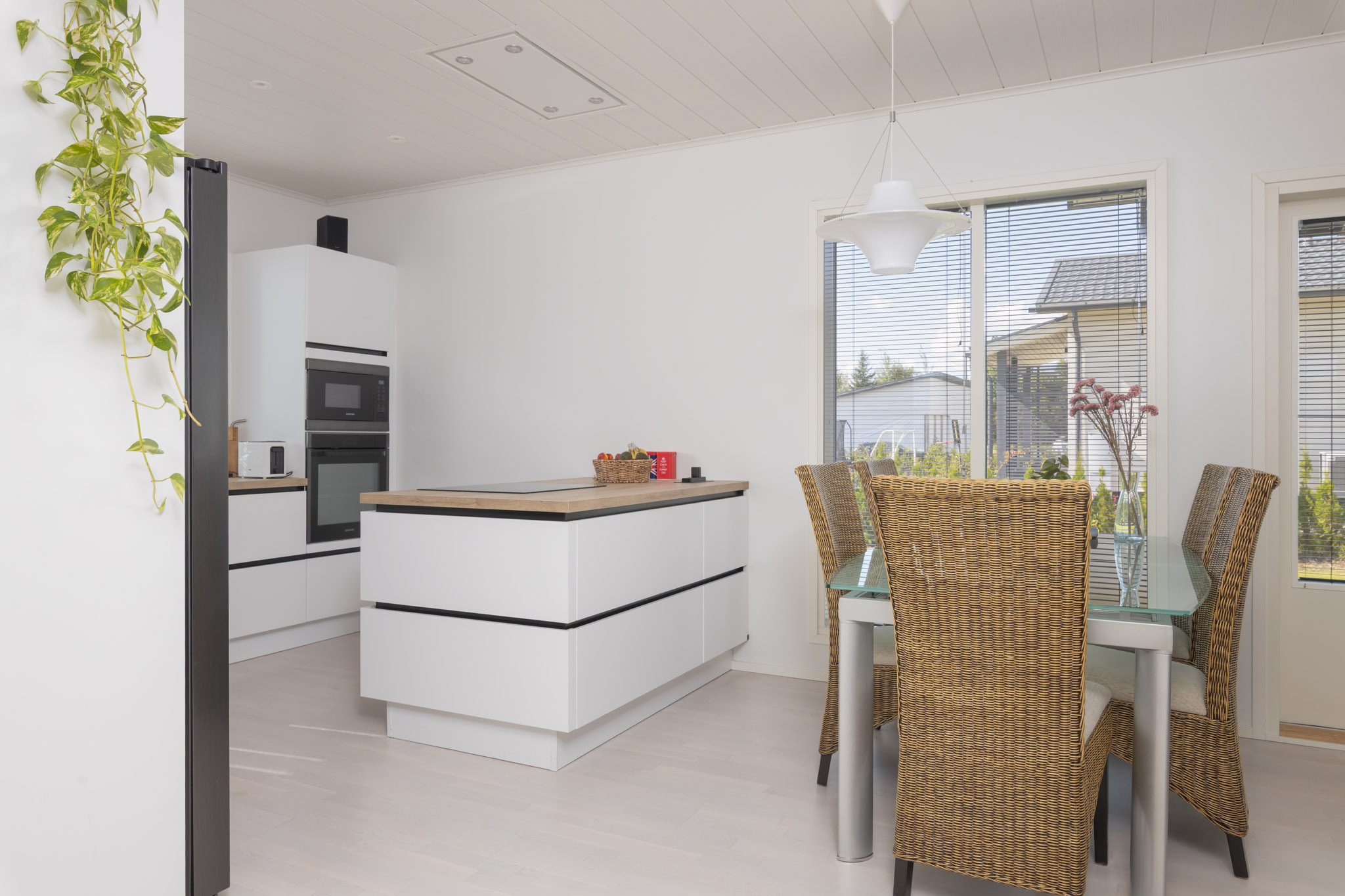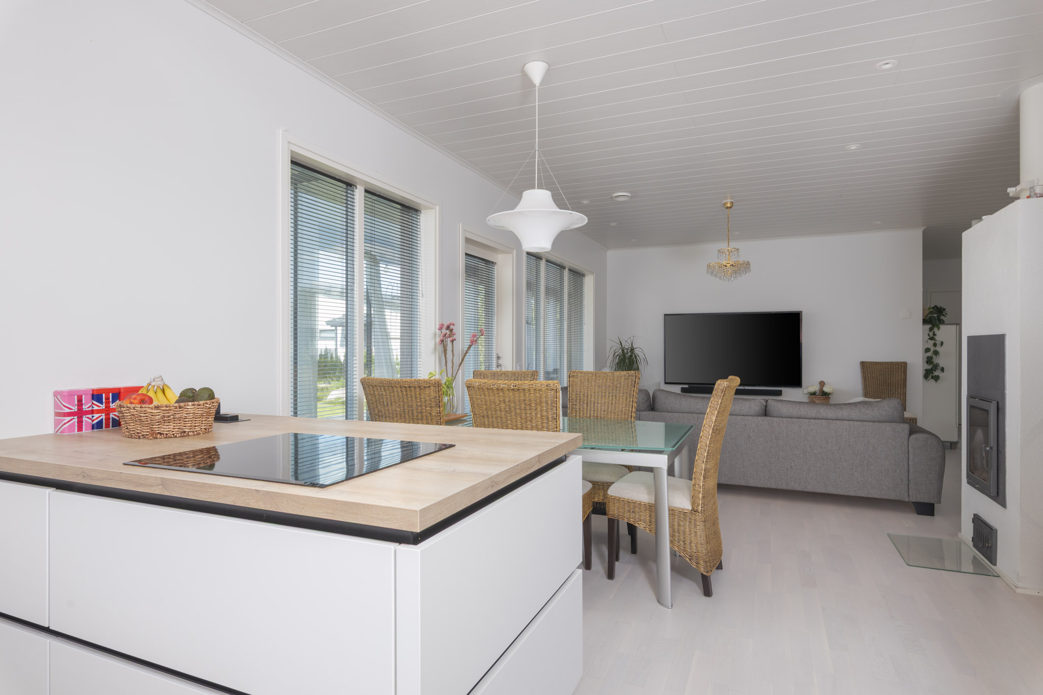 Oleskelutilat ovat valoisat ja avarat, ja olohuoneesta on suora yhteys suurelle katetulle lasitetulle terassille, joka toimii lisätilana keväästä syksyyn ja sääsuojauksen ansiosta myös viileämpinä päivinä. Varaava takka tuo lämpöä ja tunnelmaa sekä auttaa pienentämään lämmityskustannuksia.