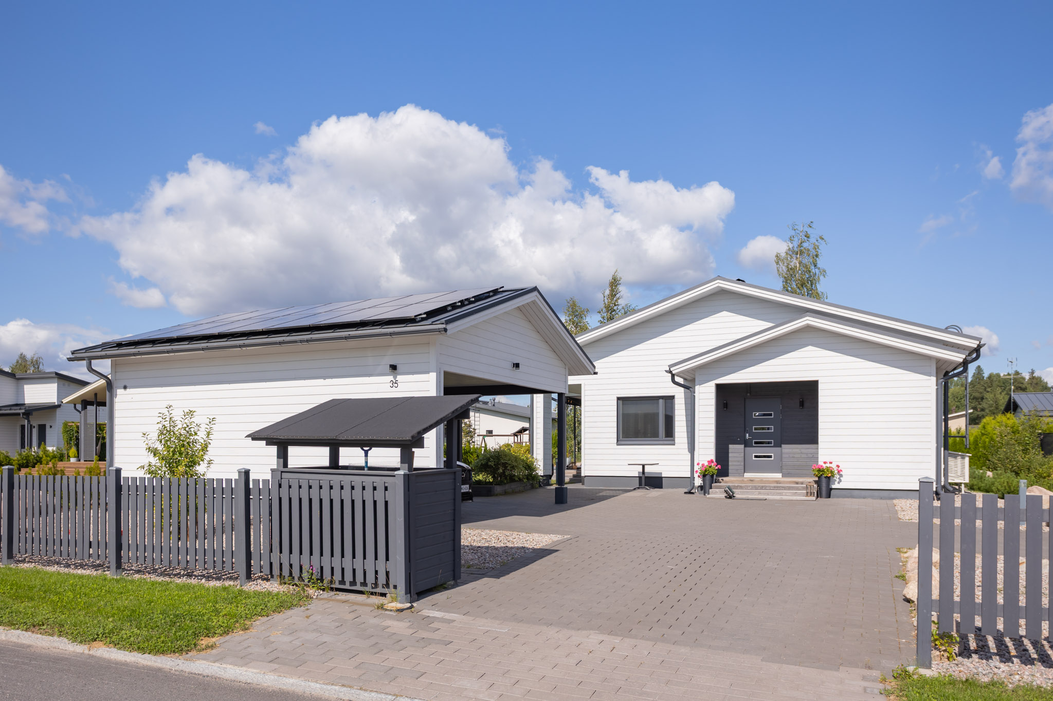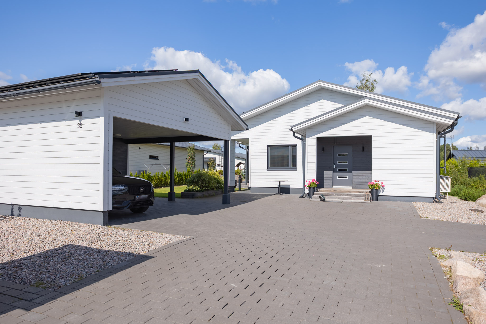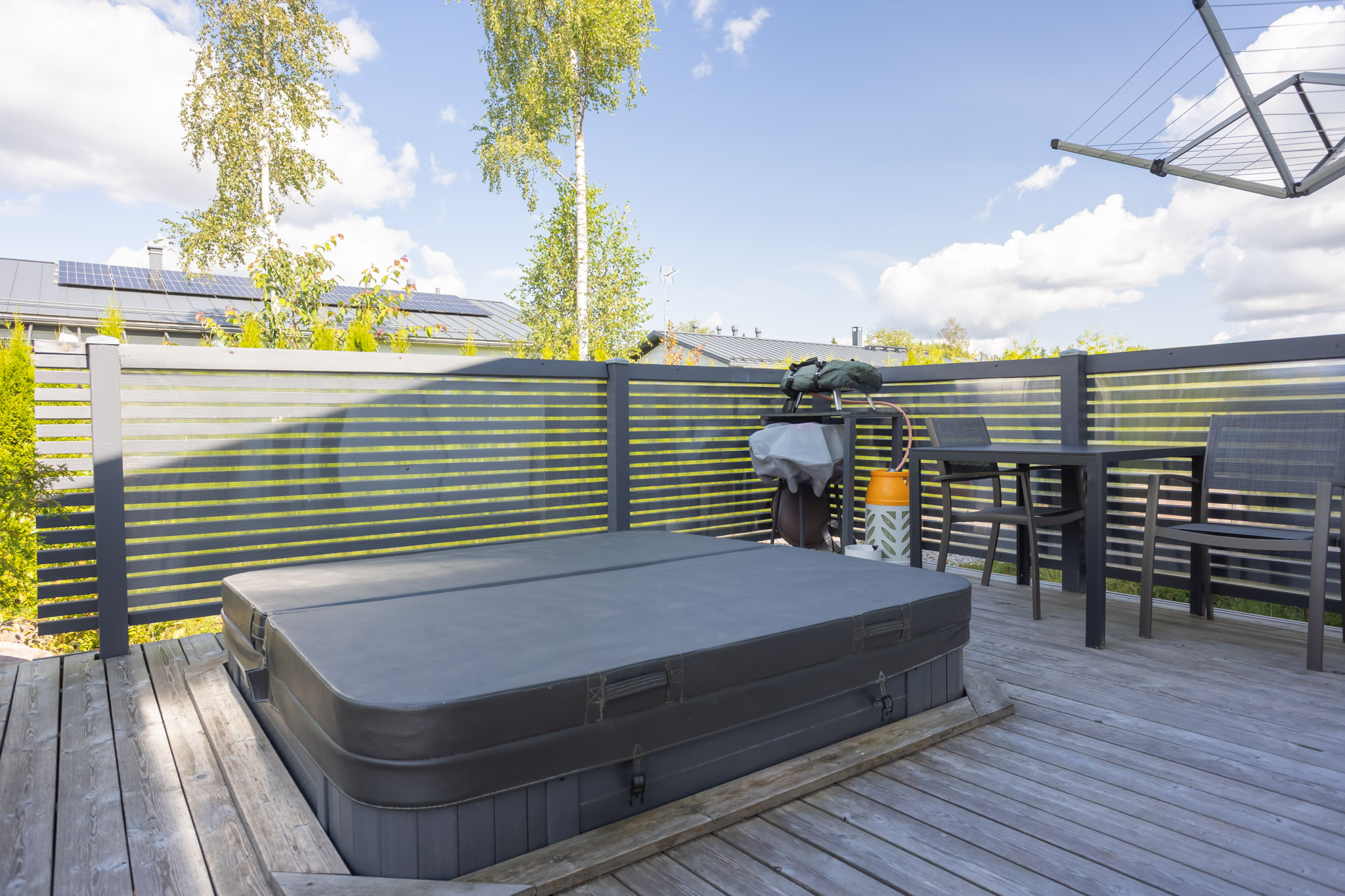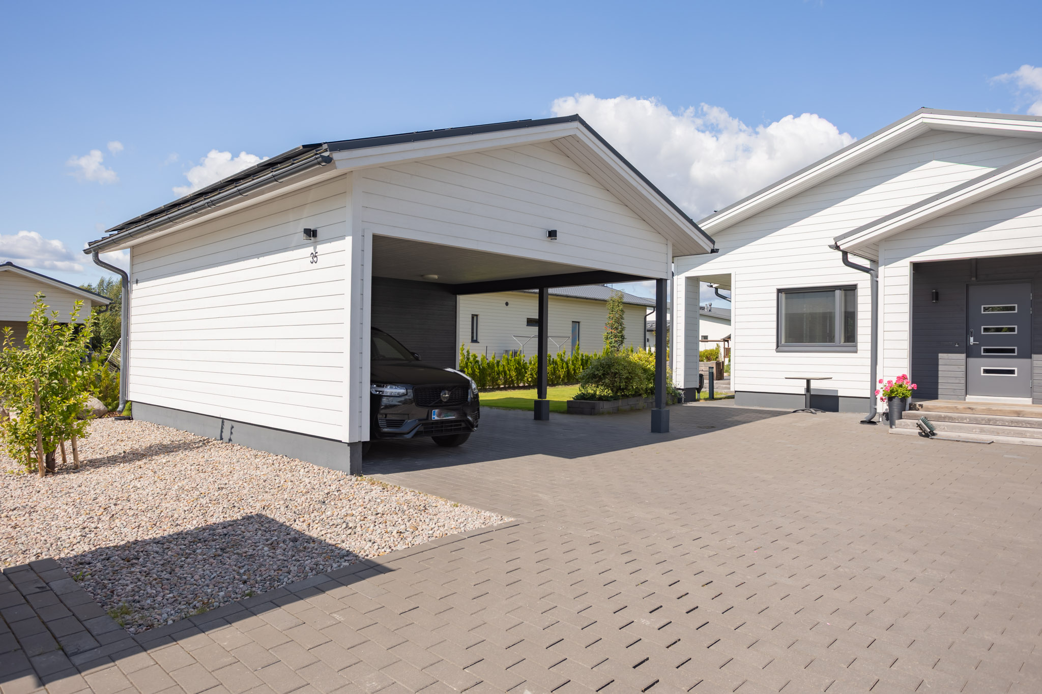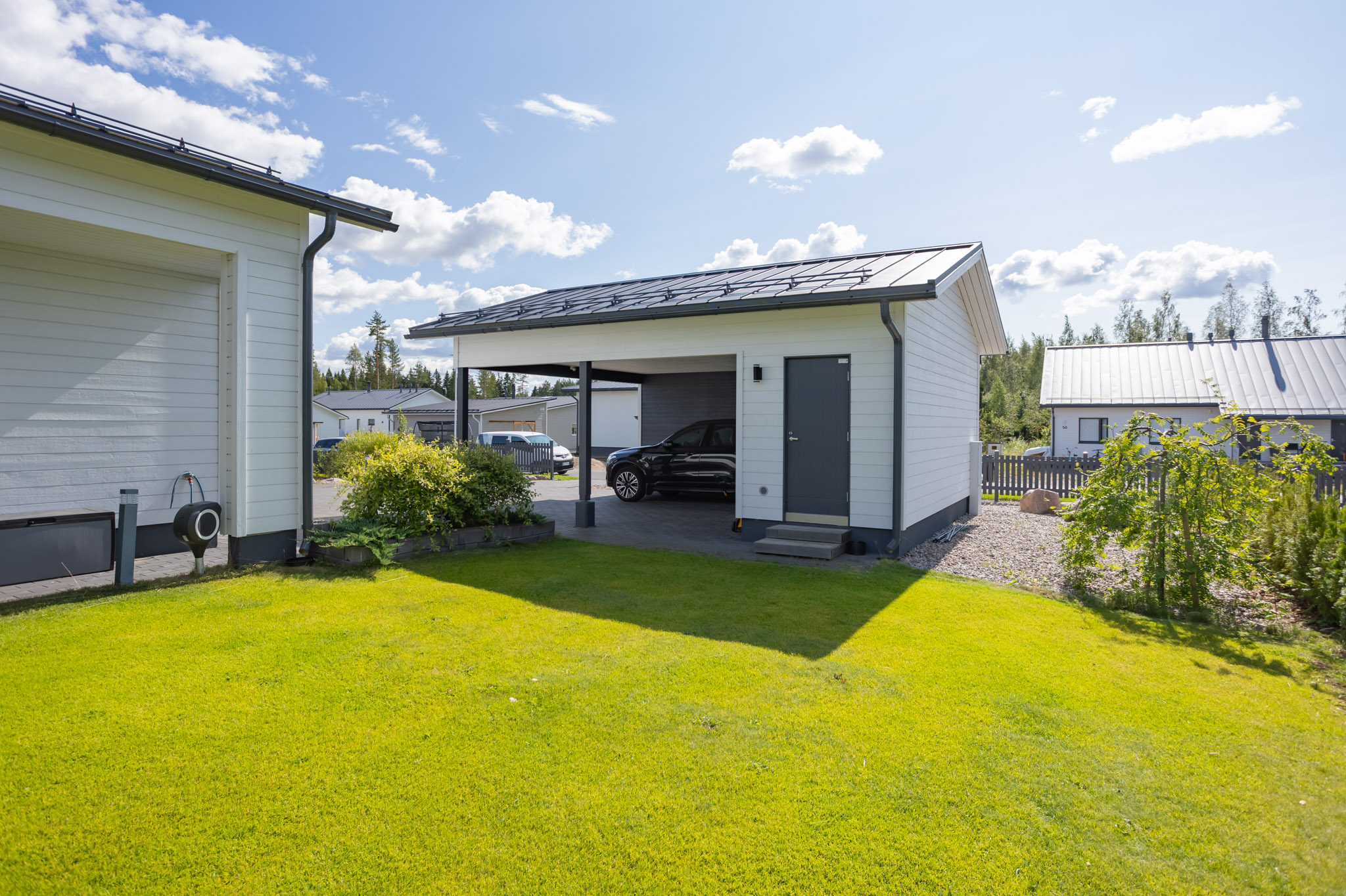 Pihapiiriin kuuluu autokatos, joka suojaa ajoneuvon säältä, sekä hyvin hoidetut piha-alueet, jotka rajaavat yksityisen ja rauhallisen pihan. Poreallas tarjoaa mahdollisuuden rentoutumiseen omassa rauhassa.