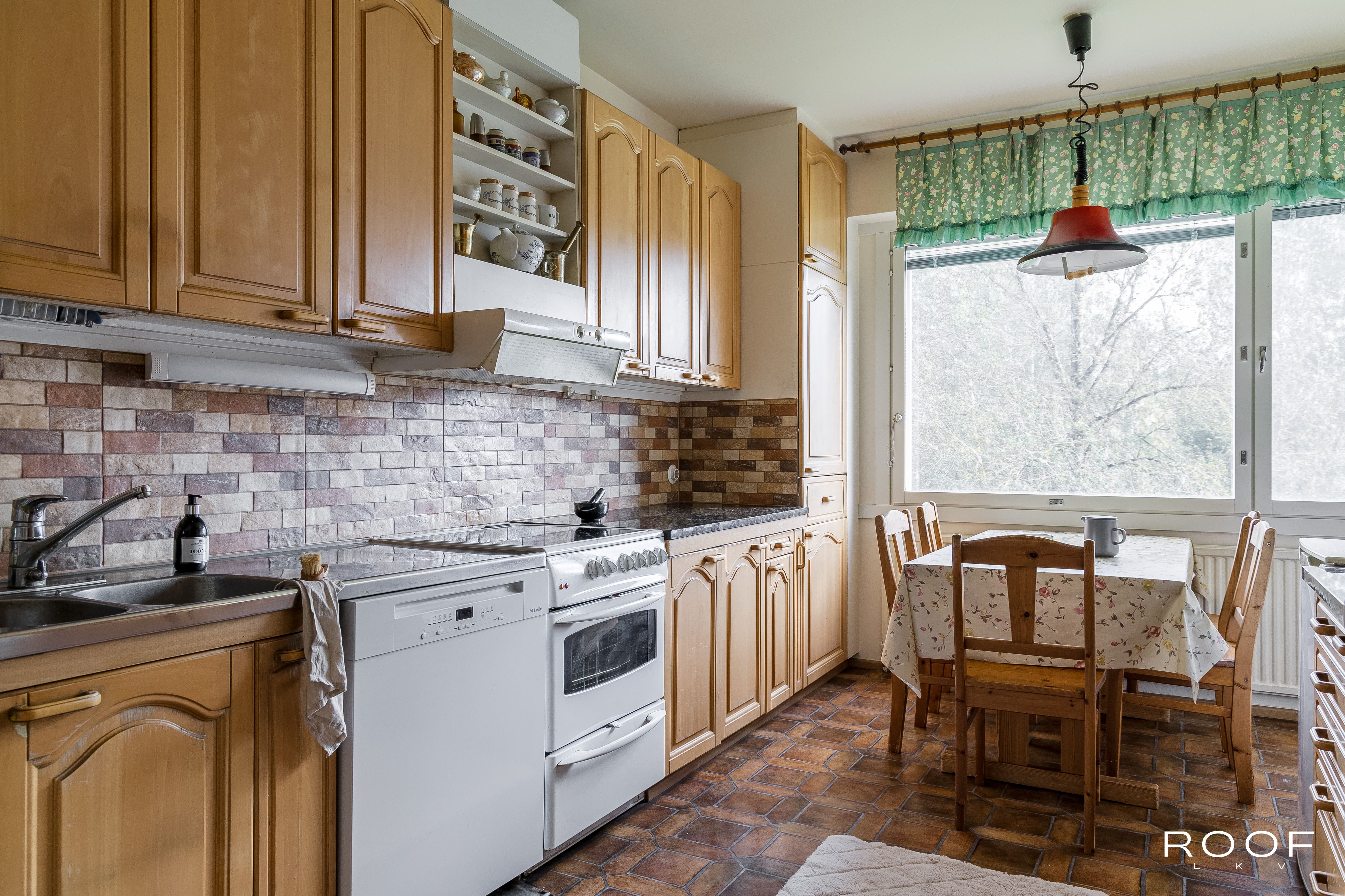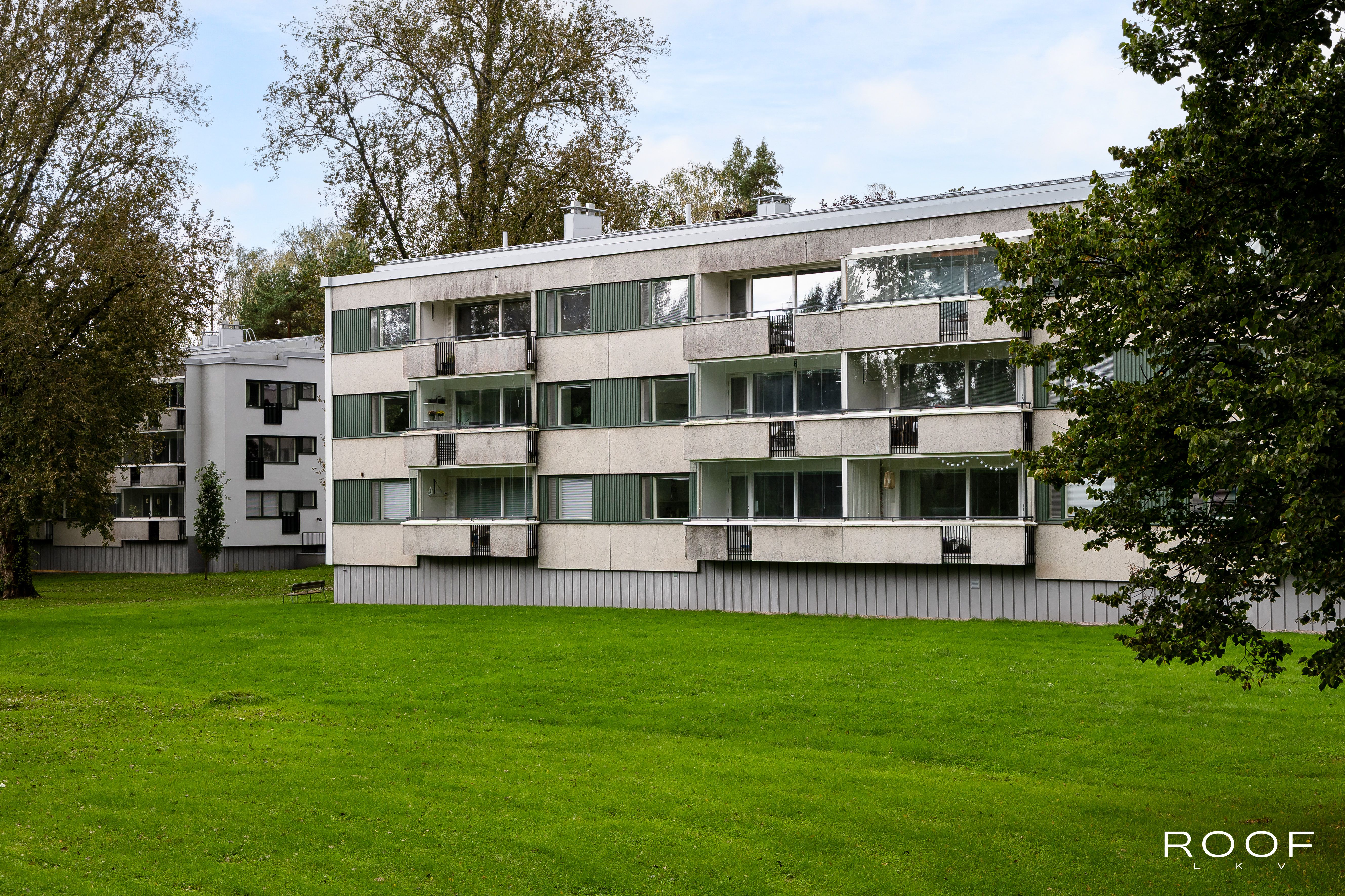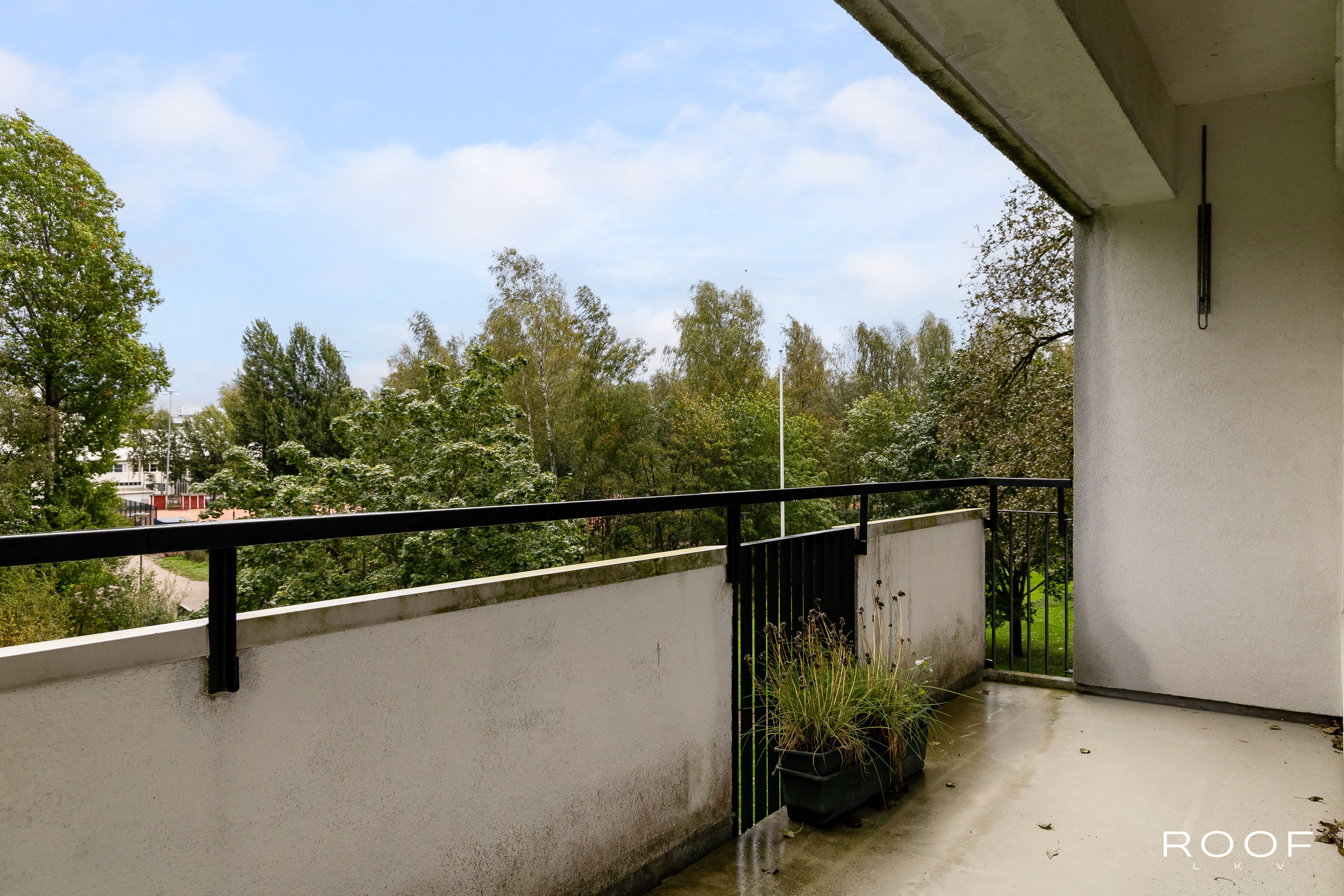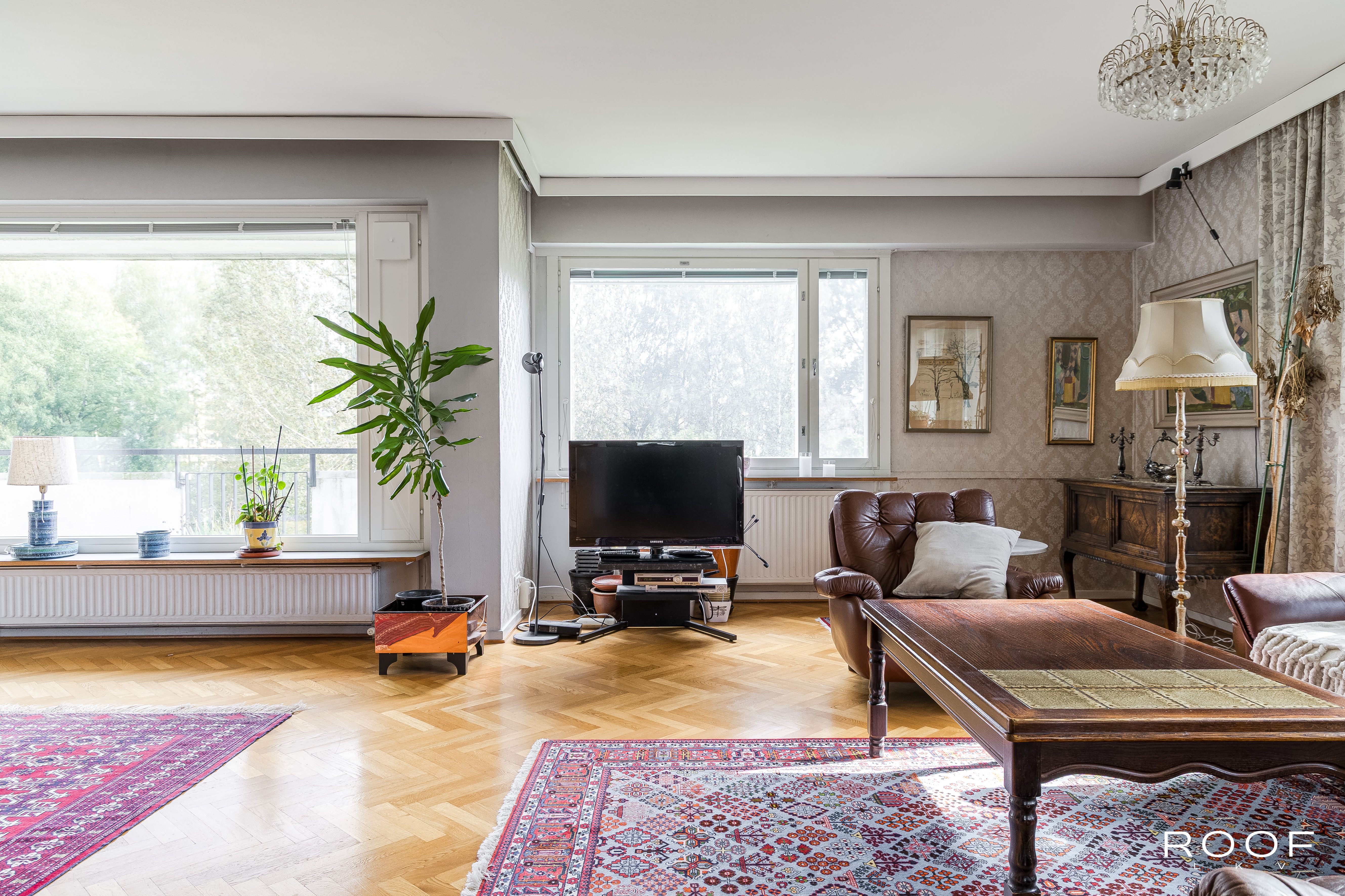 Huoneisto on tilava ja valoisa sekä sen erinomainen pohjaratkaisu tekee siitä todella ihastuttavan. Avaran olohuoneen ja ruokailutilan isot ikkunat täyttävät tilan luonnonvalolla ja näkymät ovat suoraan puistoalueeseen. Olohuoneesta on käynti suojaisalle parvekkeelle, joka toimii kesäisin ylimääräisenä oleskelutilana.