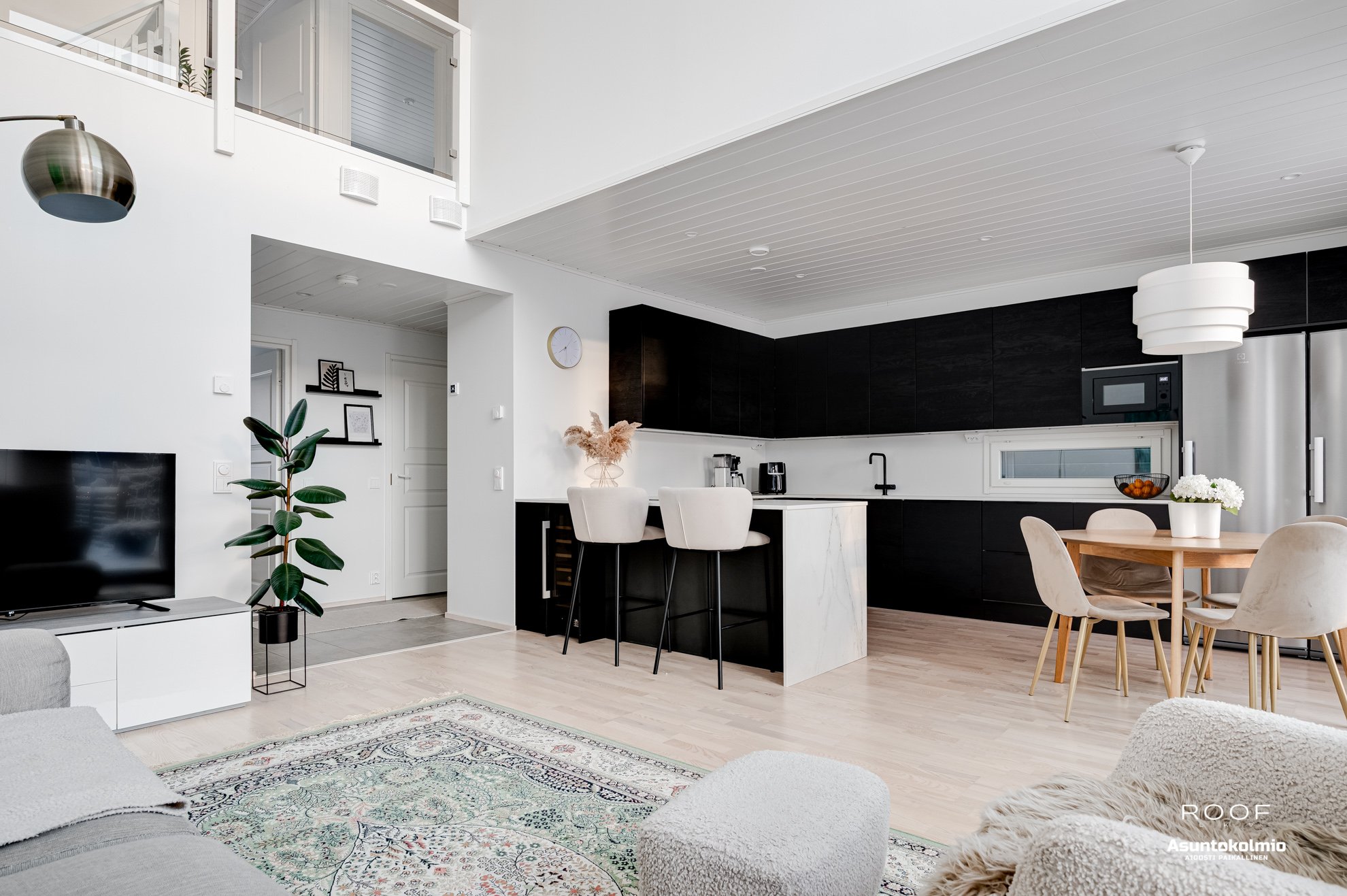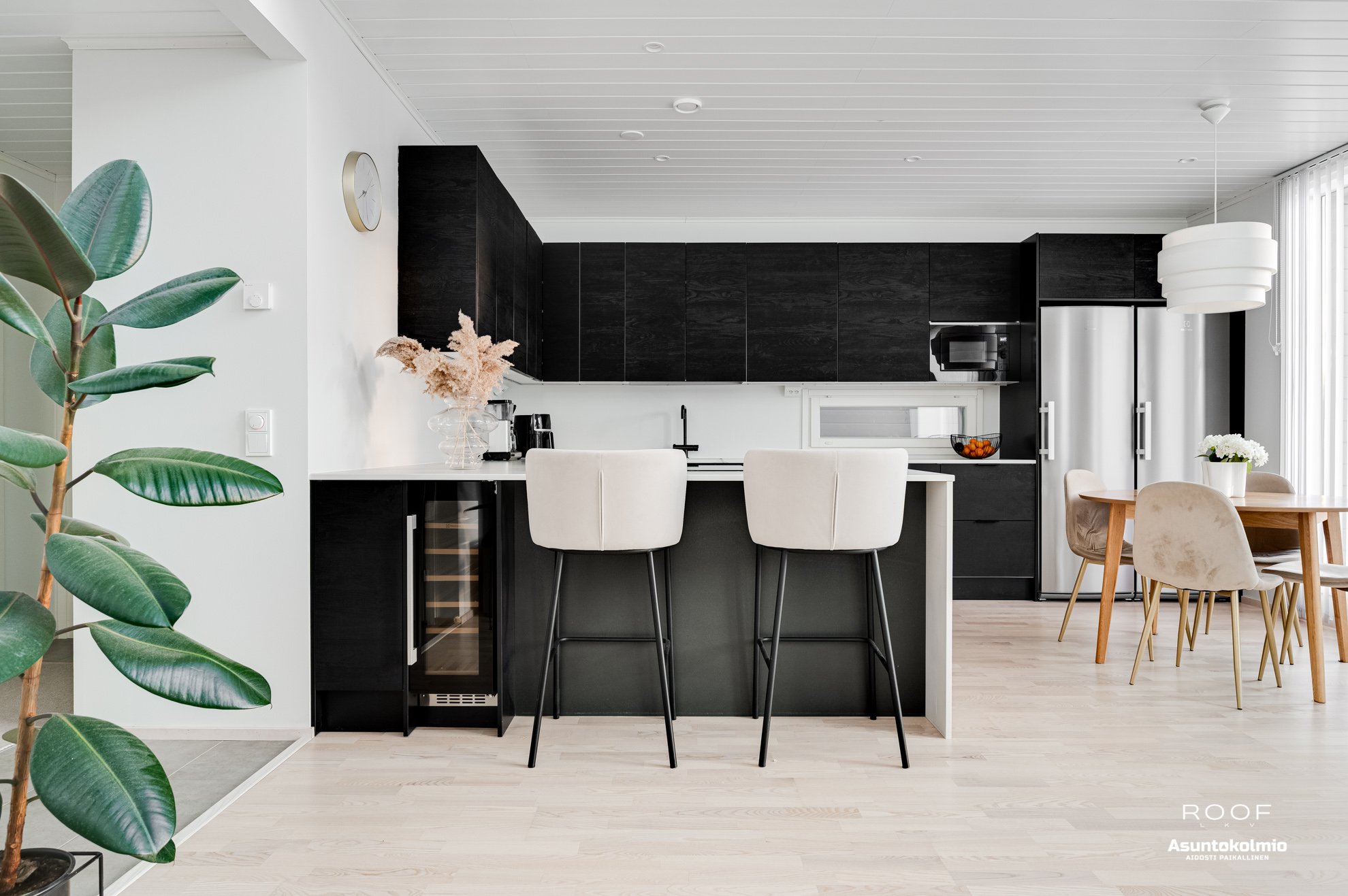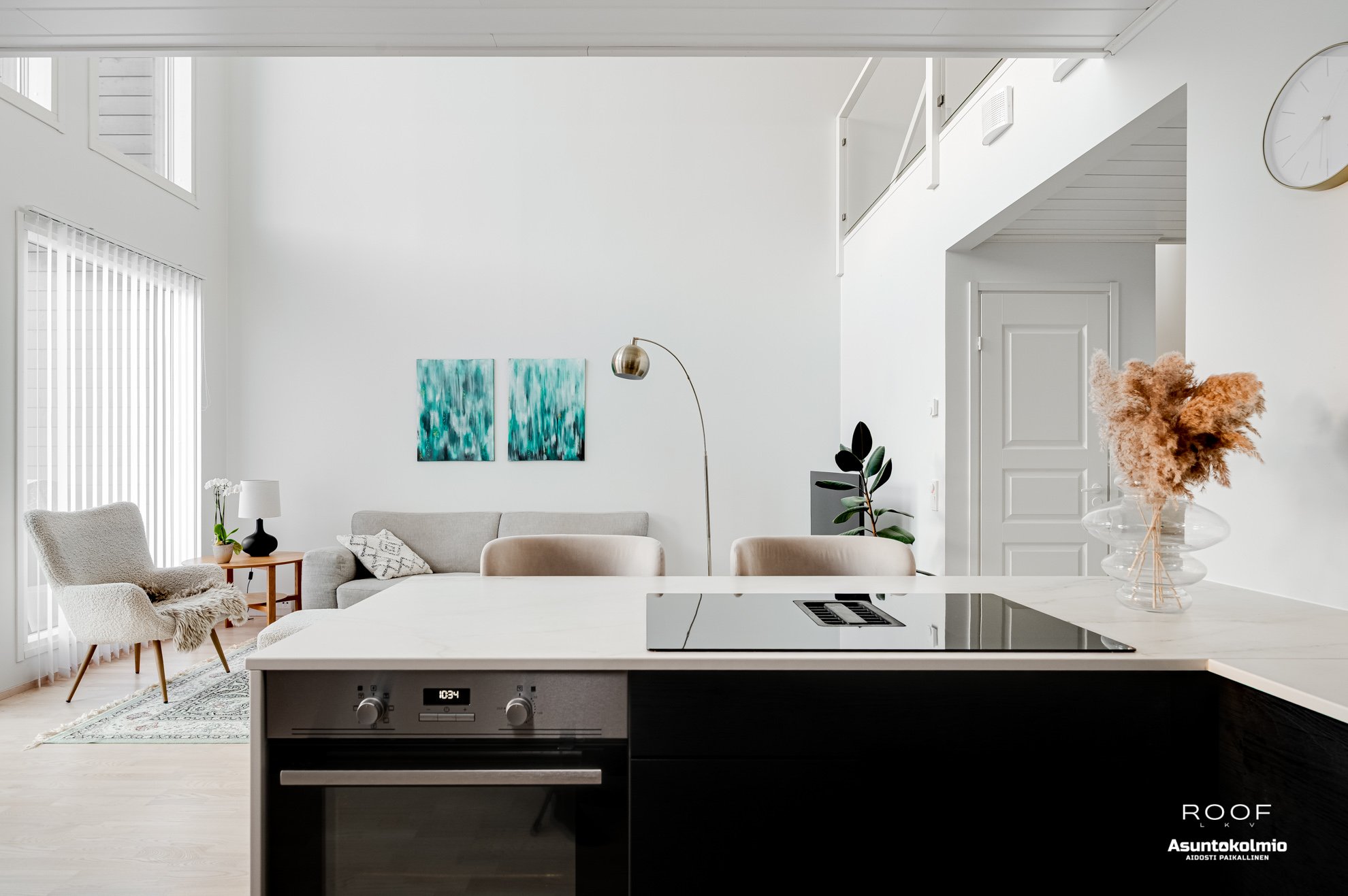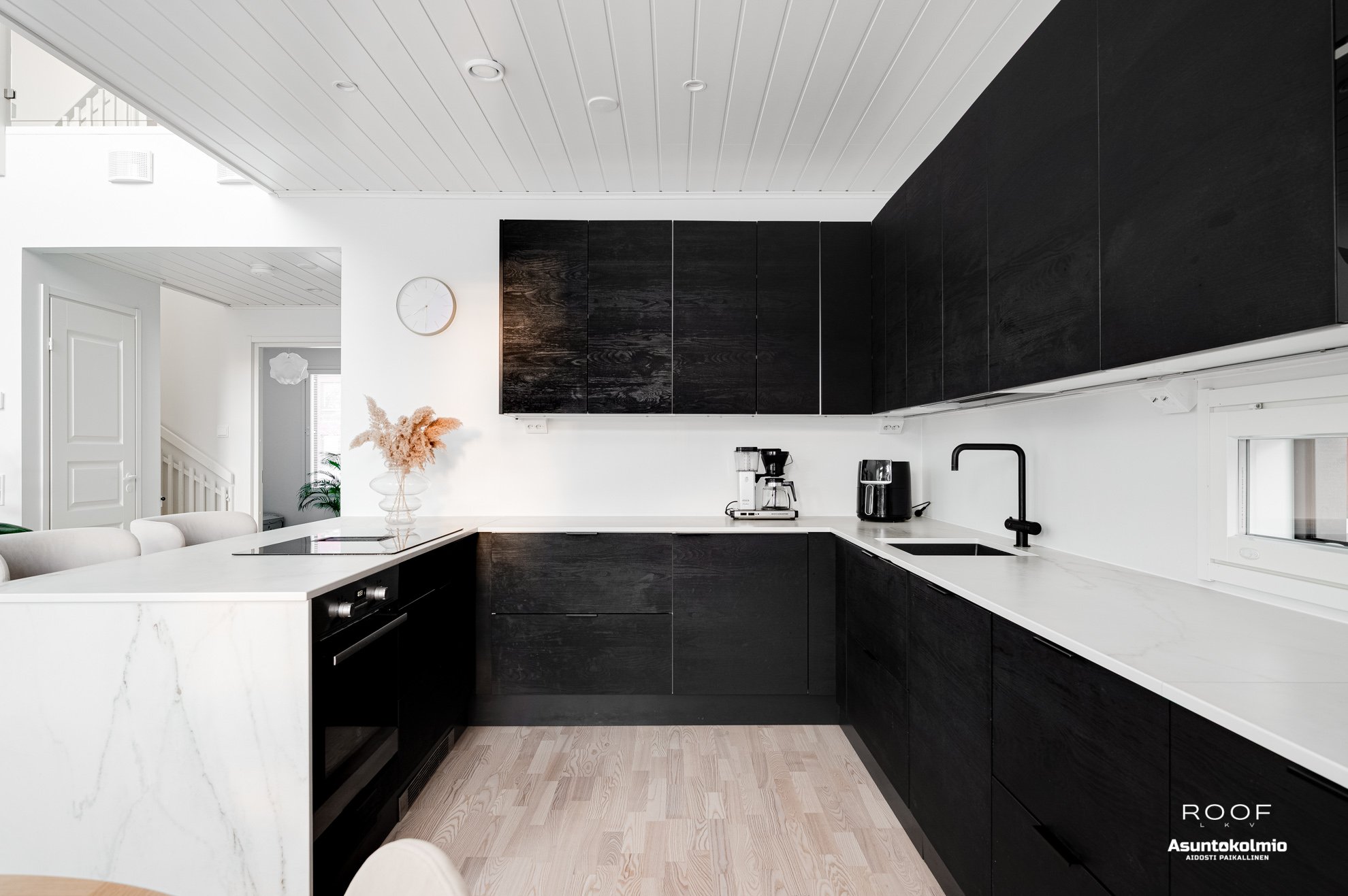 Tervetuloa Soittajankujalle! Tätä kotia on muokattu rakennusvaiheessa useilta osin, mutta selkeästi upein osa on kokonaan uudelleen suunniteltu sekä toteutettu keittiö. Suuresta keittiöstä ei varmasti lopu kaappi- tai laskutila kesken, ja esimerkiksi työtasoina on huippulaadukkaat Dekton- kivitasot. Kaikki makuuhuoneet ovat yli 11m2 ja päämakuuhuone on jopa yli 15m2.