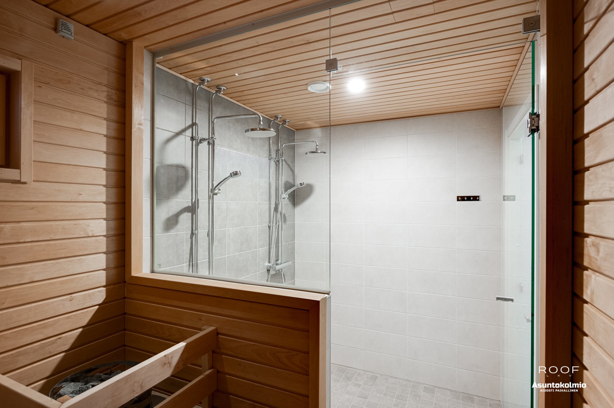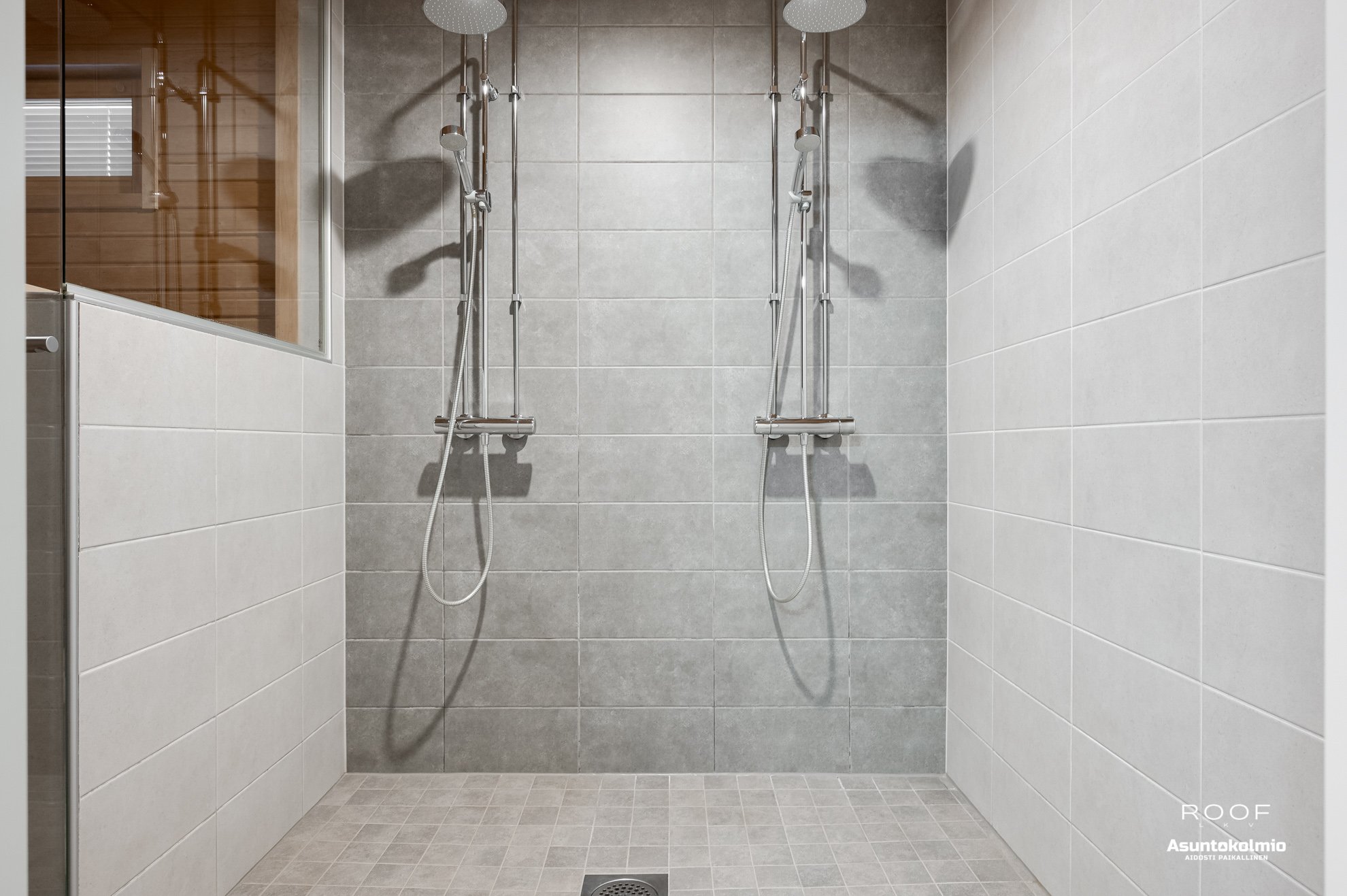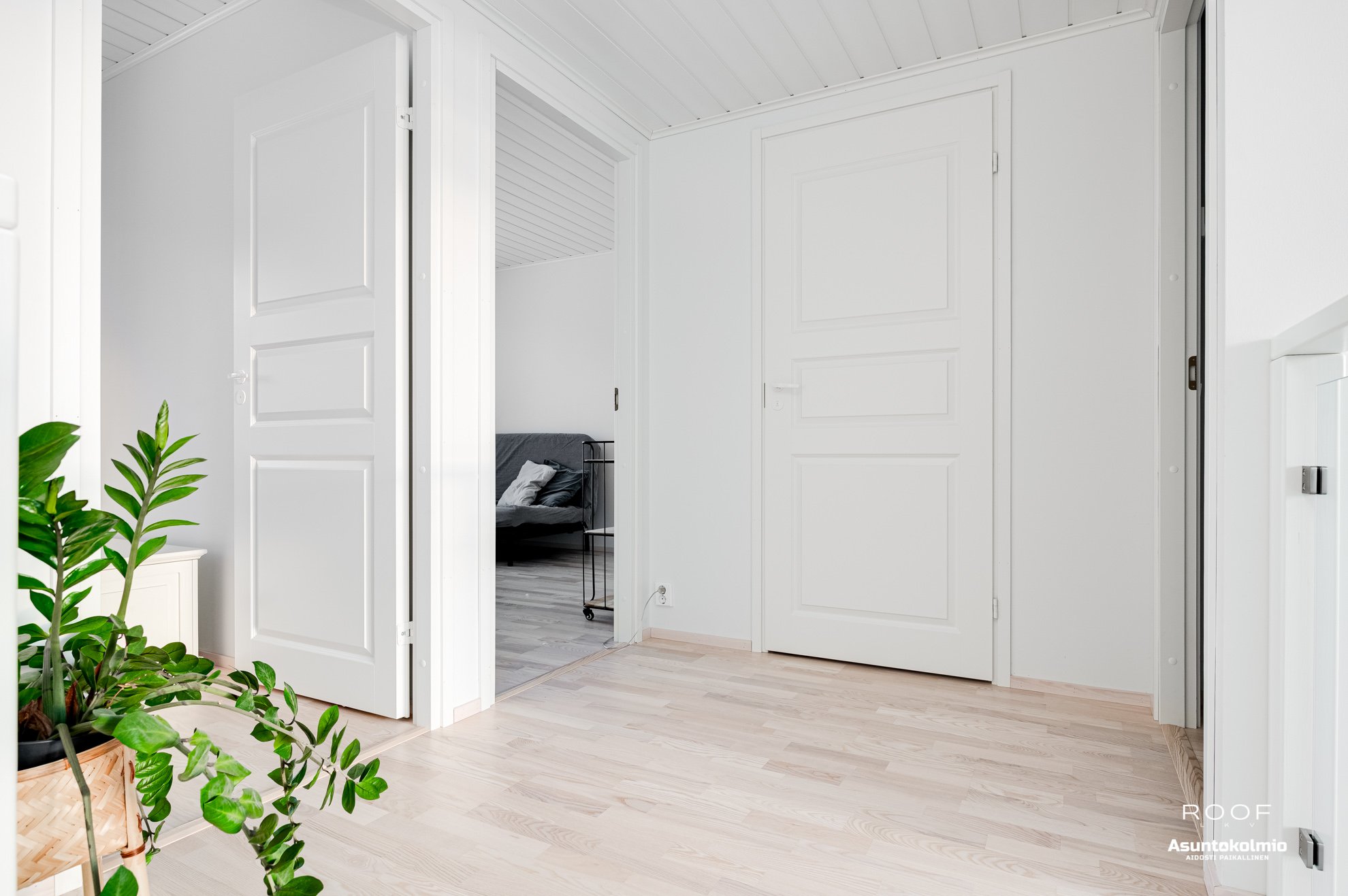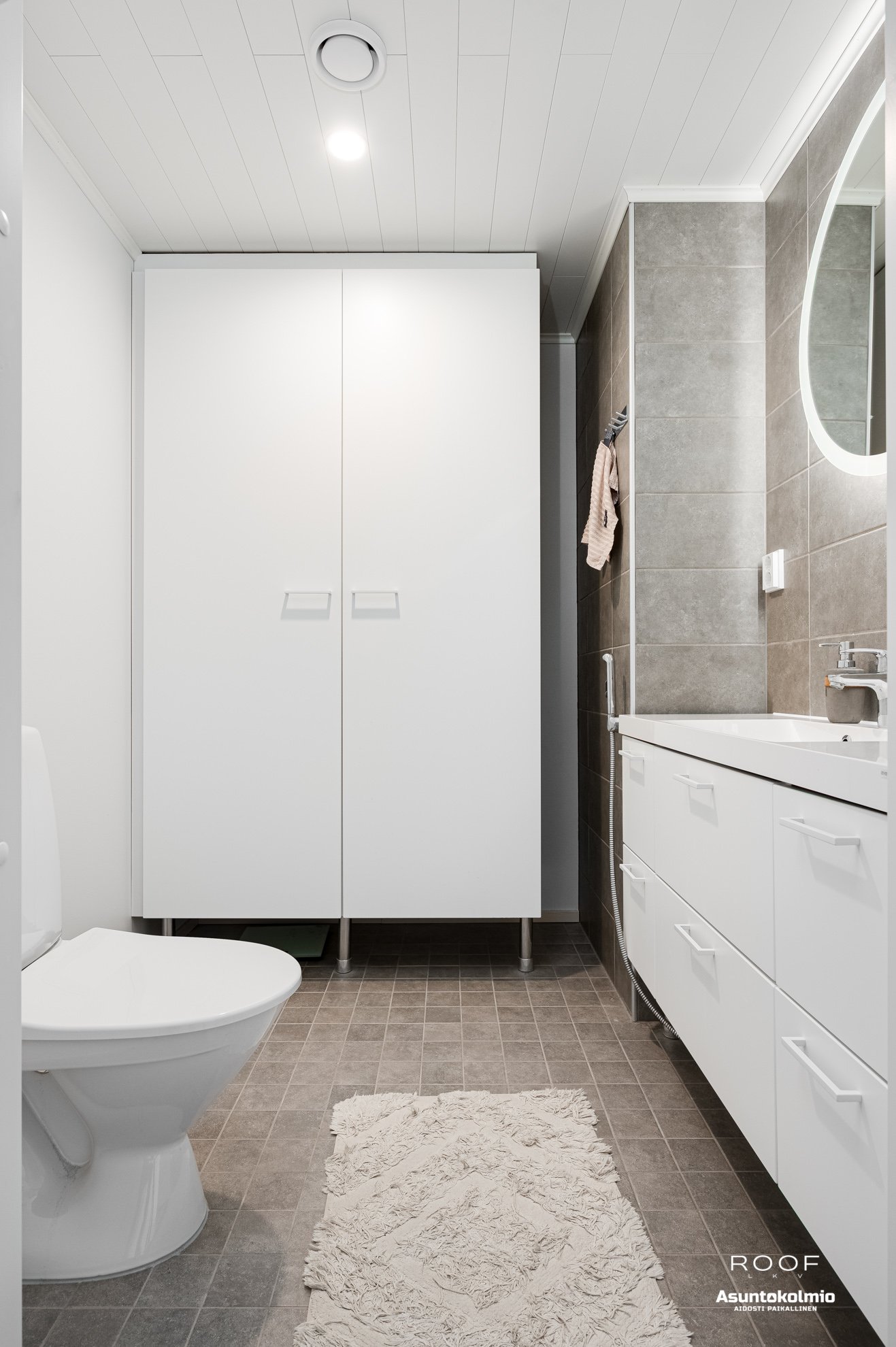 Kuivien tilojen lattiat ovat joko laattaa tai parkettia ja jokaisesta huone...