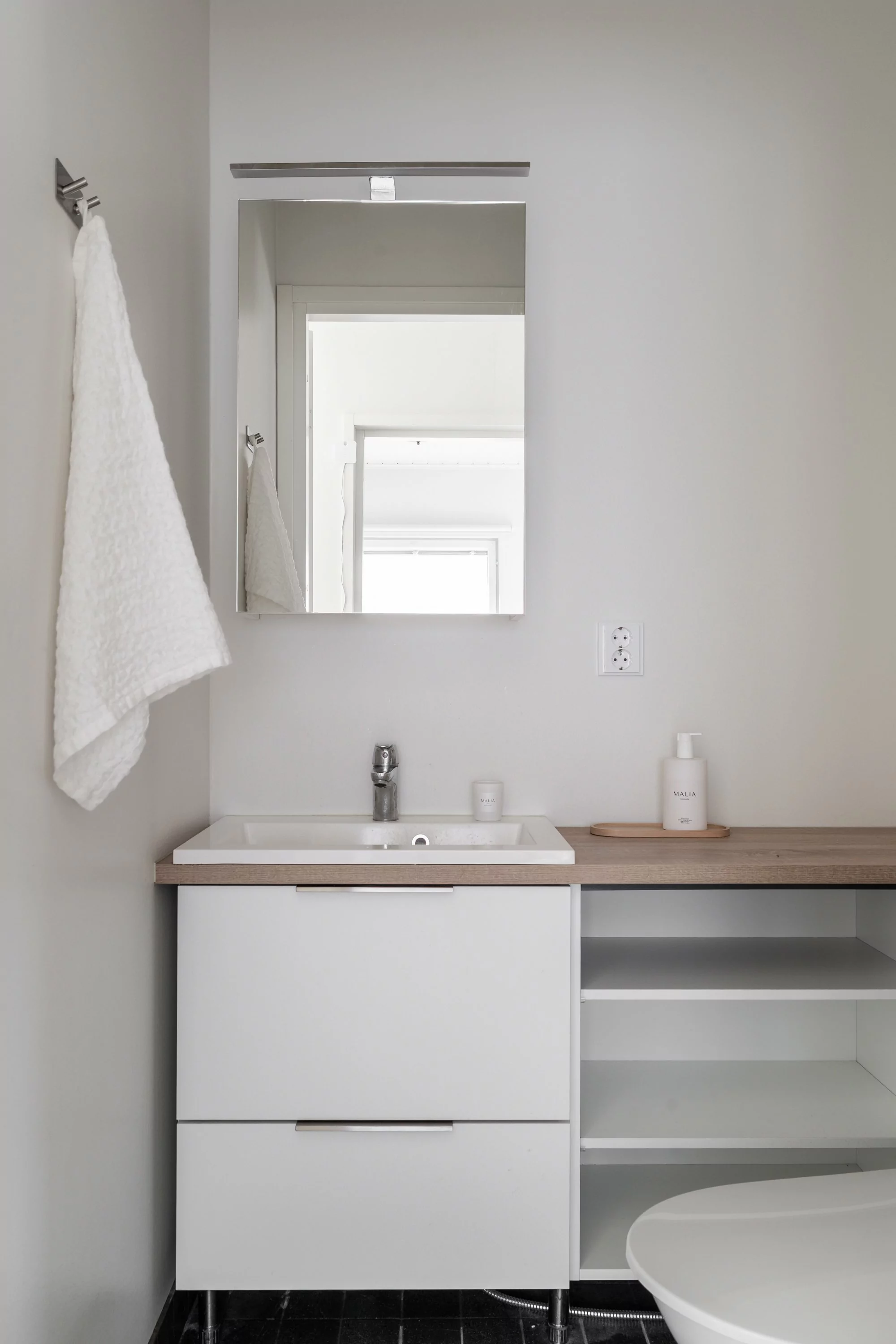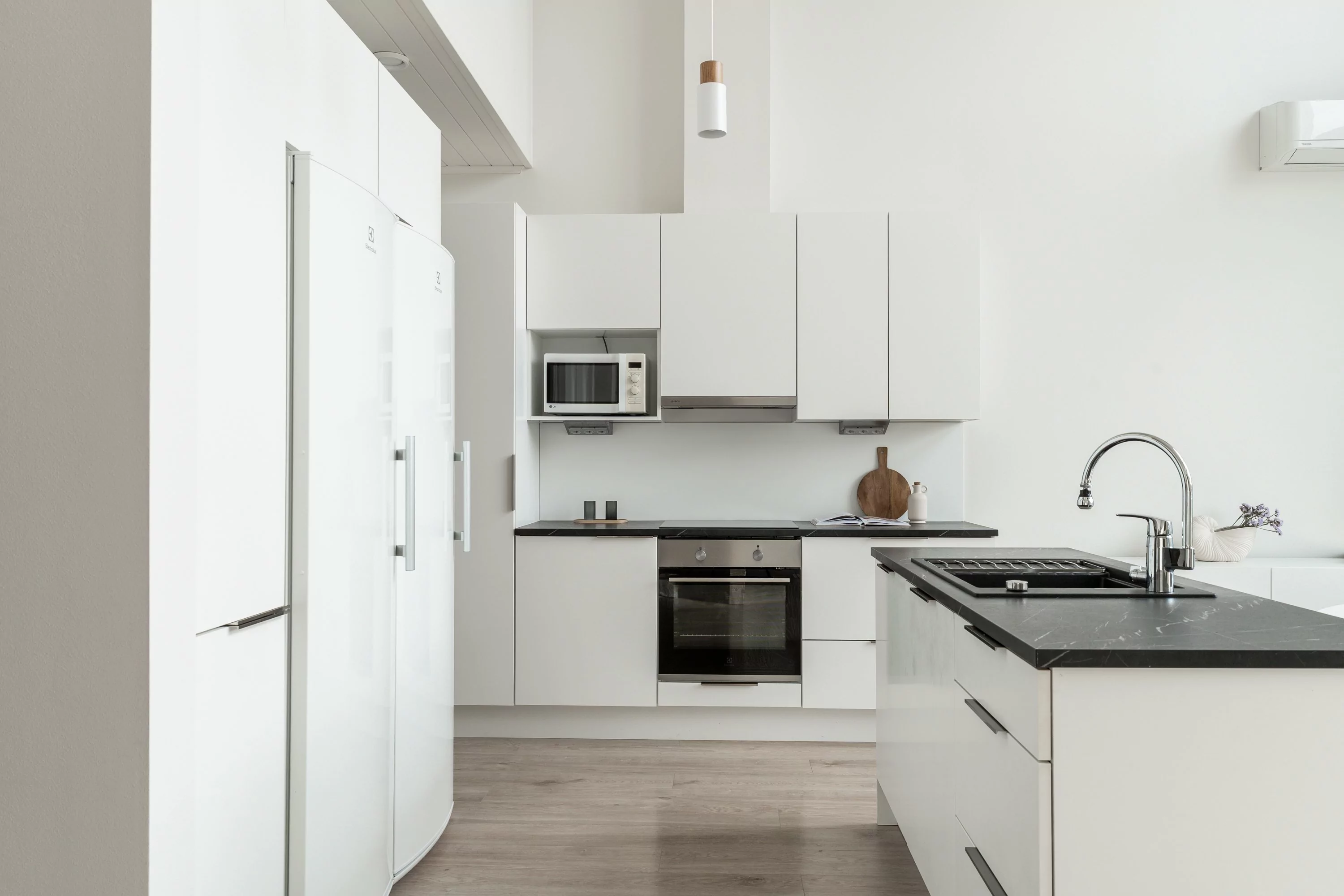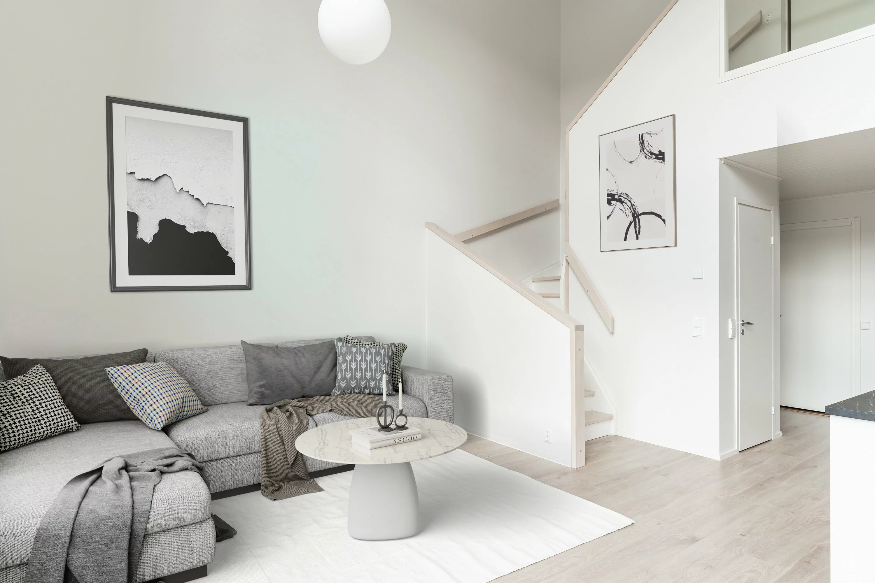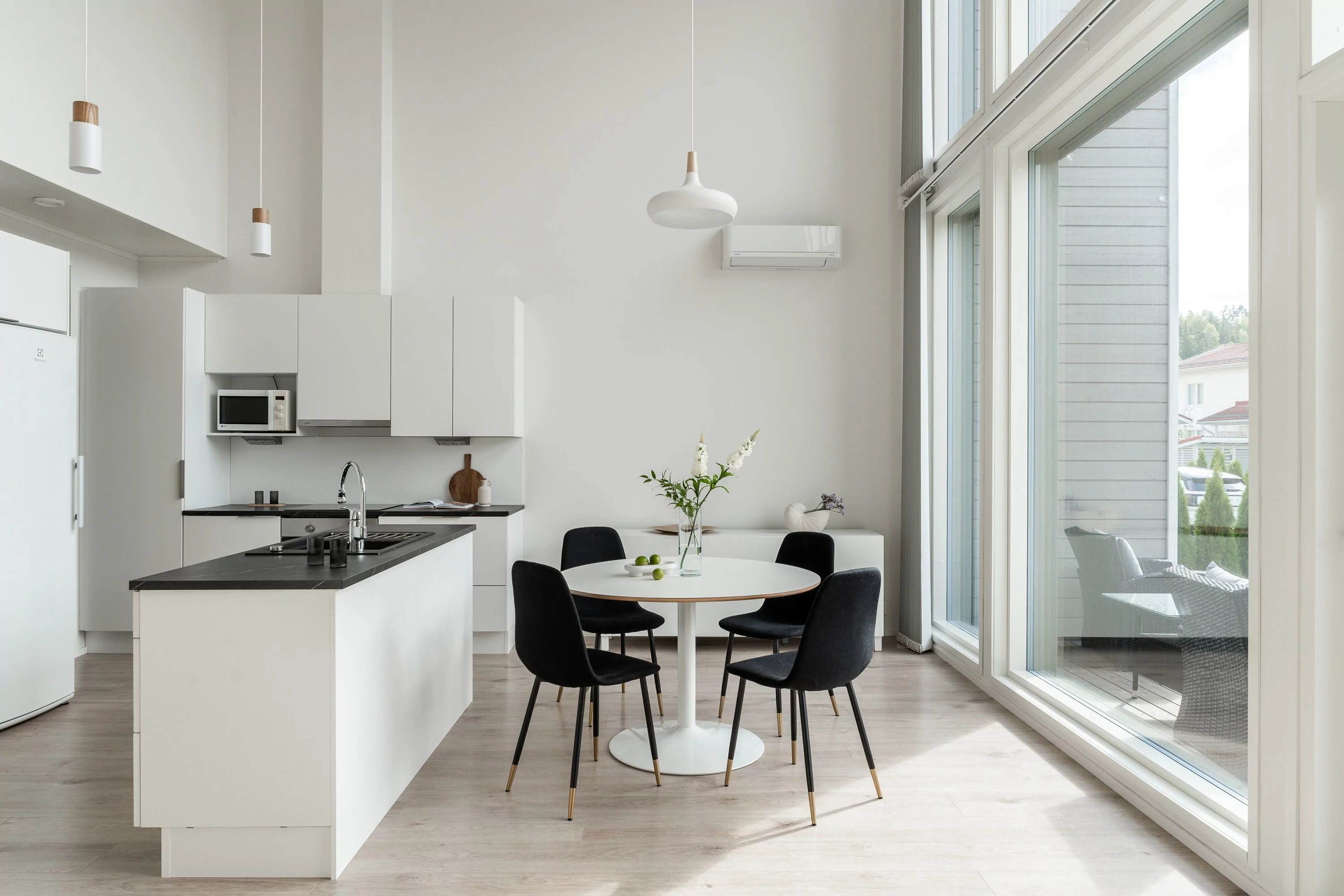 Kun astut sisään tähän kotiin, suuri ja korkea olohuone-keittiö lumoaa ensi näkemältä. Kodin alakerta on poikkeuksellinen yhdistelmä korkeaa tilaa ja lattiaan saakka ulottuvia ikkunoita, jotka tulvivat luonnonvaloa sisään ja sitovat pihan osaksi kotia. Laadukas Puustellin keittiö tarjoaa reilusti työtilaa ja toimivat ratkaisut kokkaajalle. Pohja on suunniteltu arjen sujuvuus edellä.