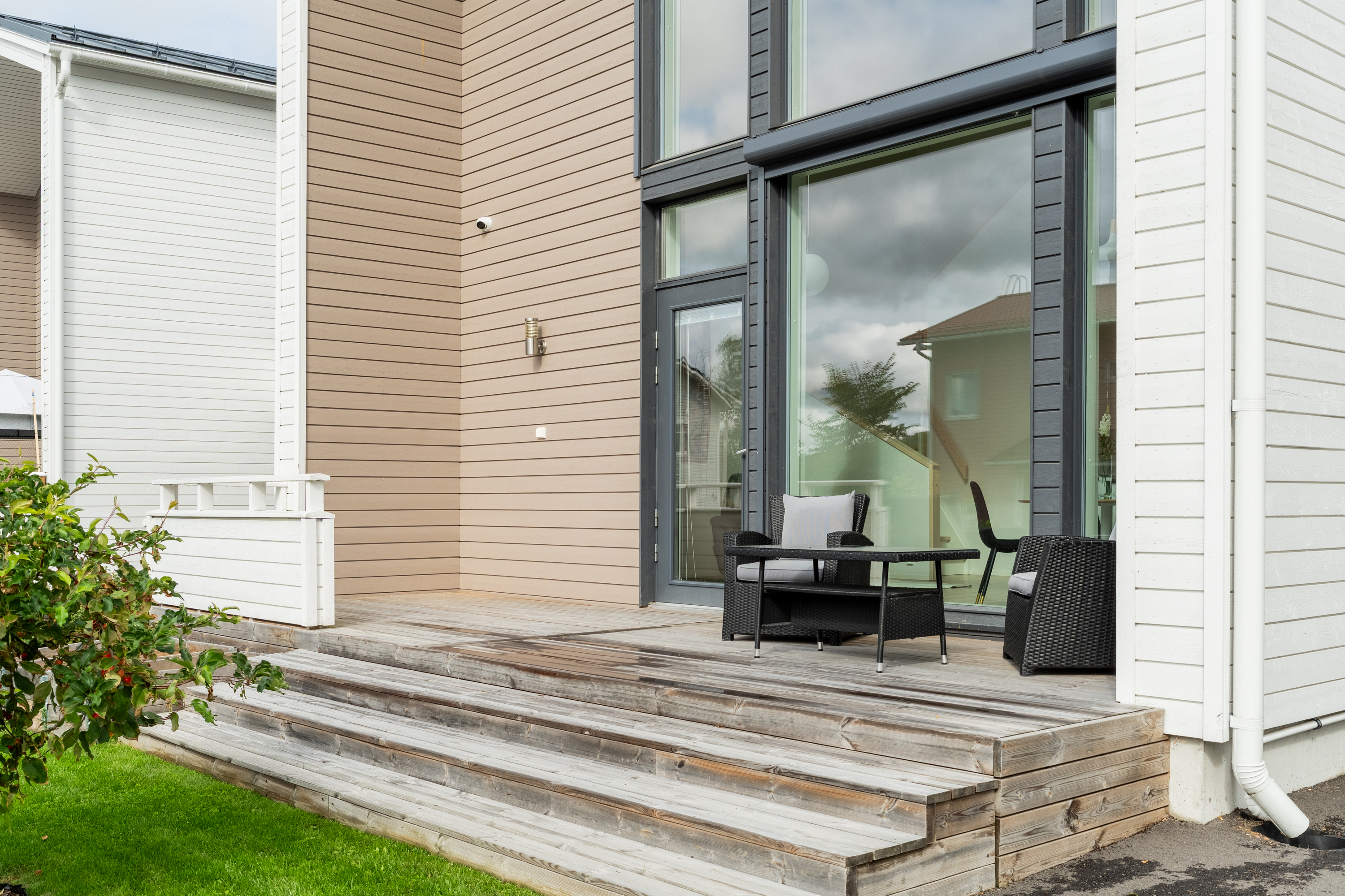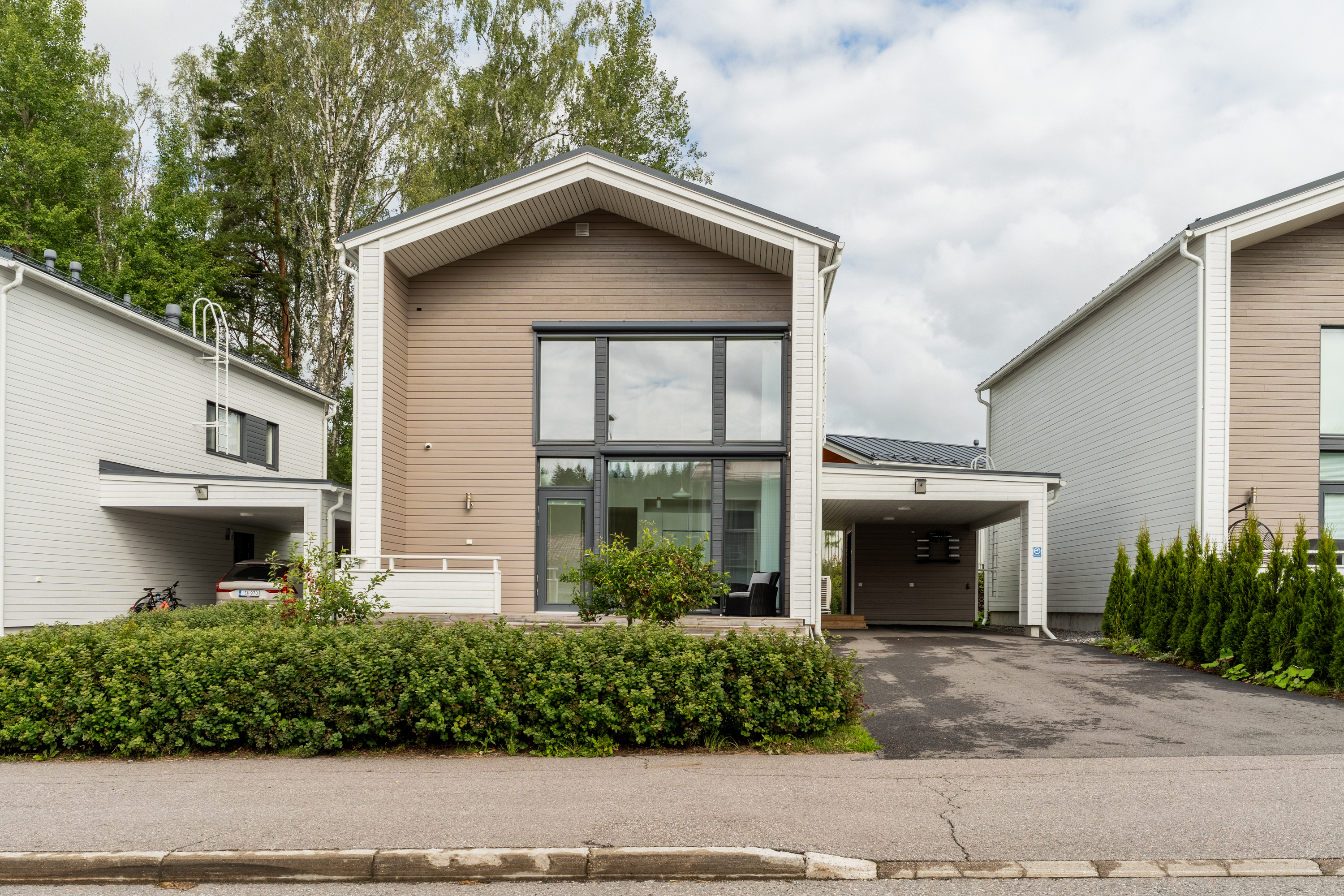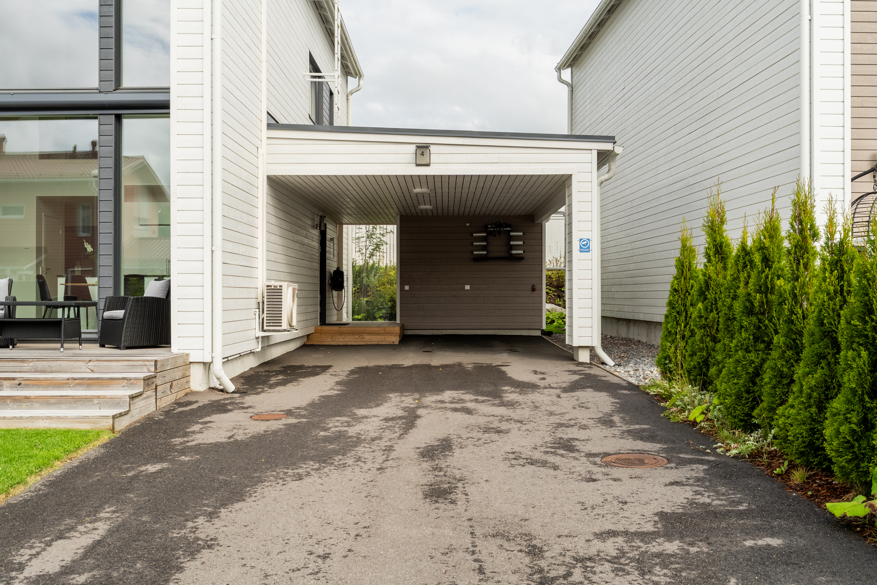 Autokatos ja varasto ovat kätevästi sisäänkäynnin yhteydessä, joten tavaroiden roudaaminen on mukavaa säällä kuin säällä. Sekä etu- että takapiha antavat mahdollisuuksia perheen yhteiseen oleskeluun, tilaa kyllä riittää. Jäähdyttävä ilmalämpöpumppu pitää sisäilman miellyttävänä kesähelteillä ja olohuoneen isojen ikkunoiden moottoroidut verhot antavat yksityisyyttä sekä suojaa. Yhtiö sijaitsee valinnaisella vuokratontilla, joten voit valita mielesi mukaan joko tontinvuokravastikkeen tai tontin lunastuksen.