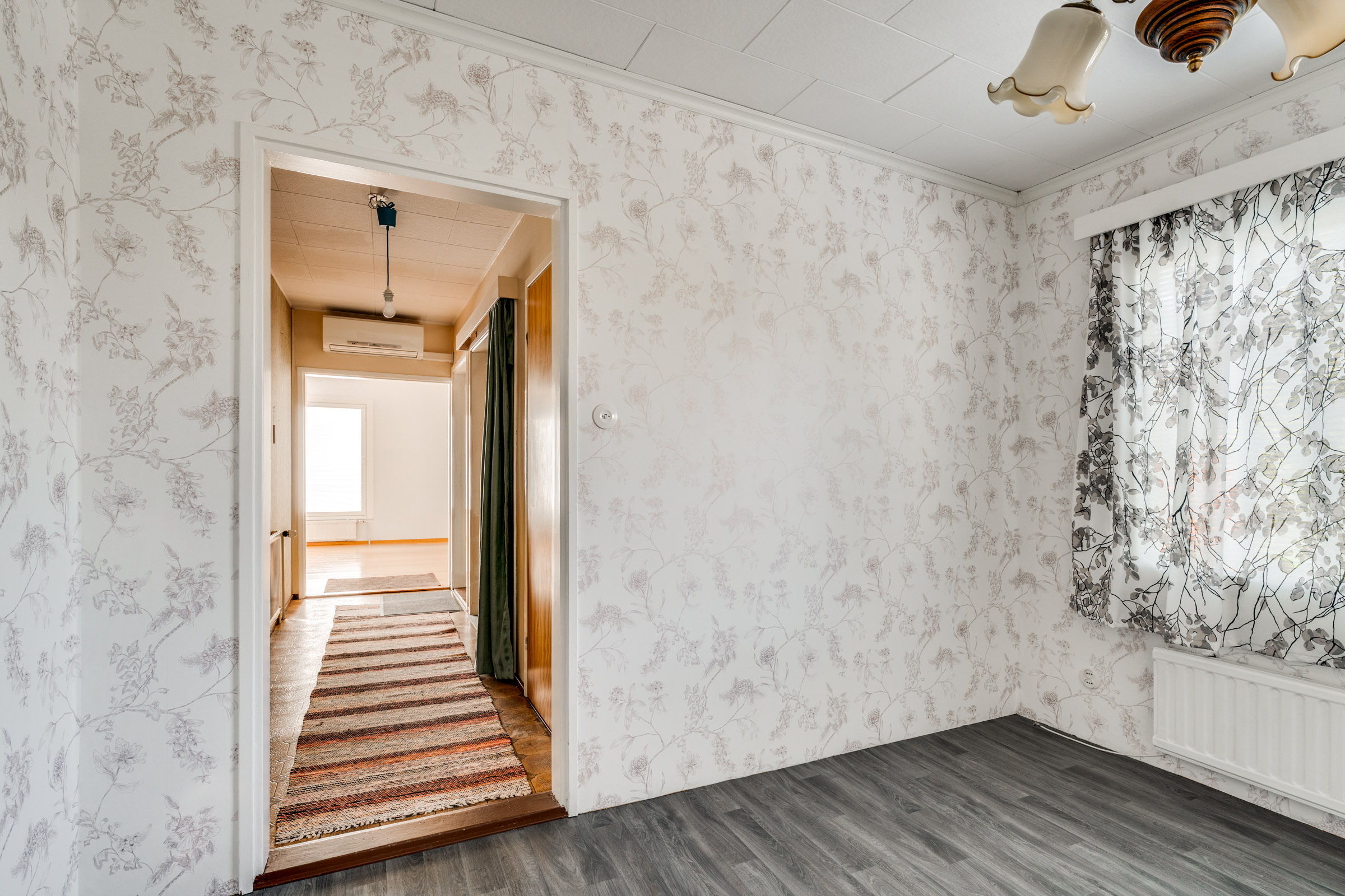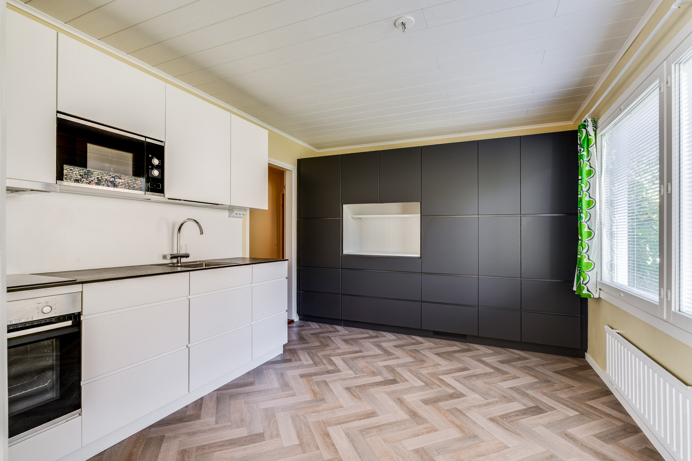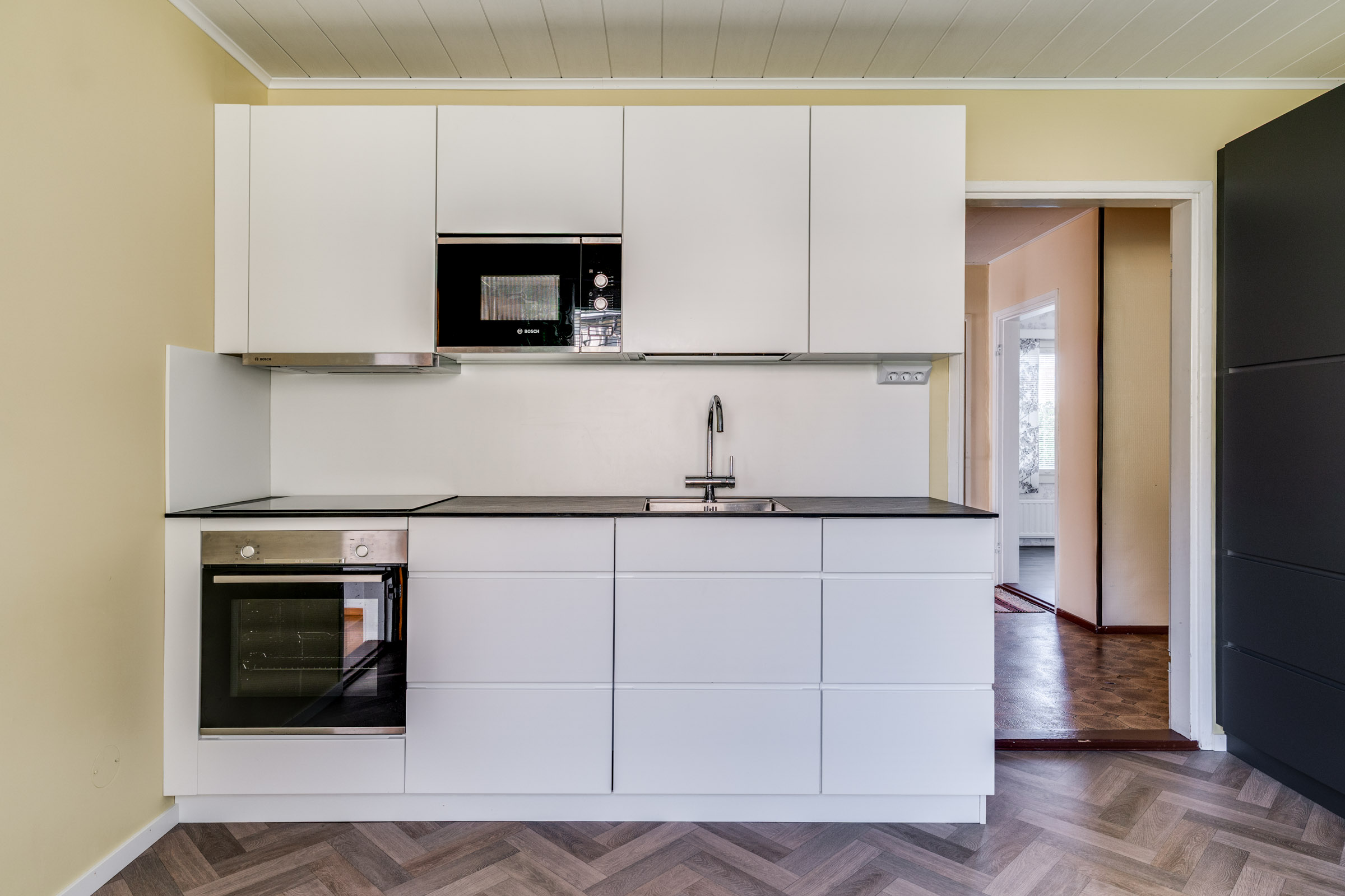 Talon pohjaratkaisu on käytännöllinen, ja se kattaa kaksi kerrosta, joissa on yhteensä neljä makuuhuonetta. Alakerrassa on kaksi makuuhuonetta, kun taas yläkerrassa sijaitsee kaksi lisää, tarjoten tilaa niin perheenjäsenille kuin vieraillekin. Keittiö on remontoitu vuonna 2021 ja varustettu nykyaikaisilla integroiduilla kodinkoneilla, mikä tekee ruoanlaitosta nautinnollista.