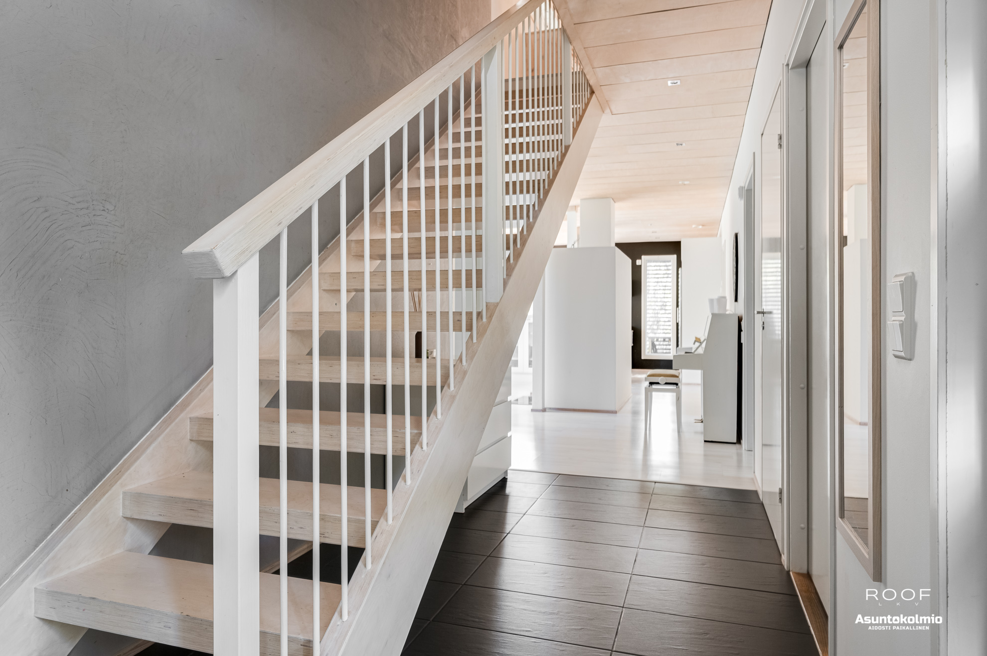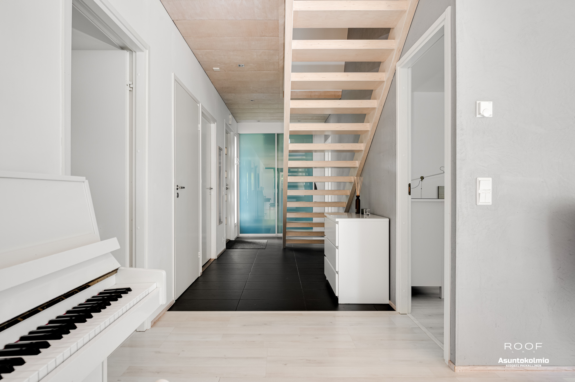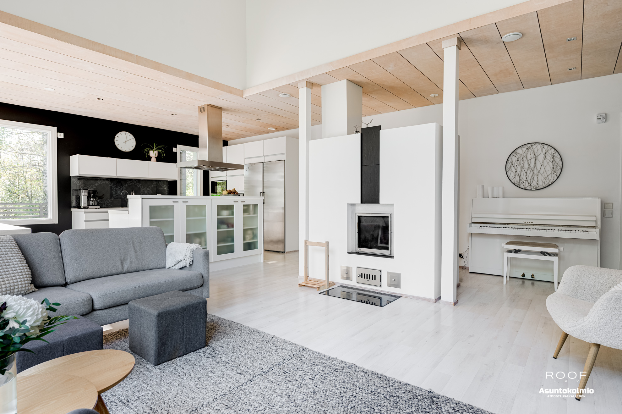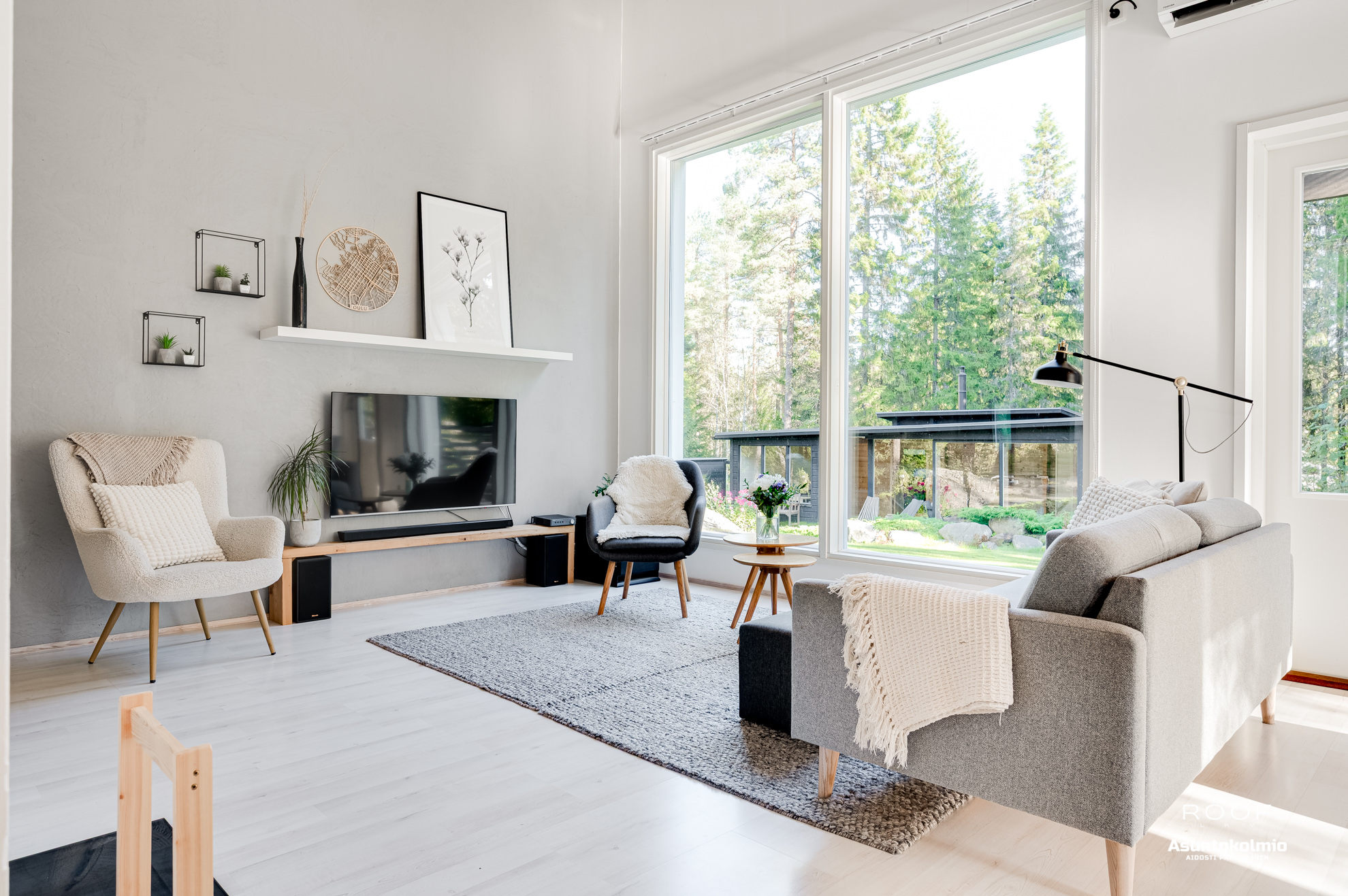 Tämä ihastuttava 5 makuuhuoneen koti on rakennettu vuonna 2009 ja on vielä tänäkin päivänä nykyaikaisen moderni ja silti kodikas ja käytännöllinen kokonaisuus. Kodin tiloissa on otettu huomioon etenkin lapsiperheen tarpeet ja arki onkin sujuvaa. Heti sisään tullessa on omalla sisäänkäynnillä oleva tilava arkieteinen, joka huomioi ulkoilevan/harrastavan perheen tarpeet. Kodin alakerrassa on 3 makuuhuonetta vanhemmille ja perheen pienimmille ja 2015 rakennetussa yläkerrassa on 2 makuuhuonetta ja aulatila perheen teineille tai etätyöläisille. Yhtenäisen olohuone-keittiön katseenvangitsijana on korkeampi huonekorkeus, isot kiinteät ikkunat metsän suuntaan ja vaneriset sisäkatot. Keittiössä on tilaa isommallekin ruokapöydälle ja sieltä on kulku isolle terassille. Lämmitys tapahtuu kauttaaltaan vesikiertoisin lattialämmityksin, lämmityksen apuna on ollut varaava takka ja ilmalämpöpumppu. Isolla perheellä lämmitys- ja käyttösähkökustannukset ovat olleet keskimäärin vain noin 200 €/kk.
