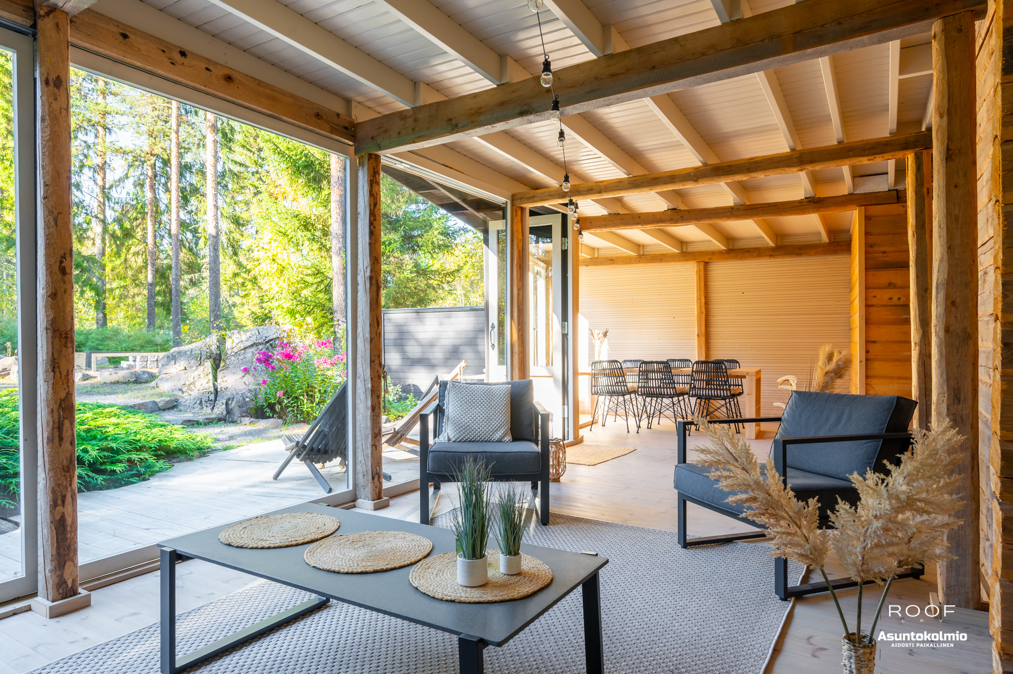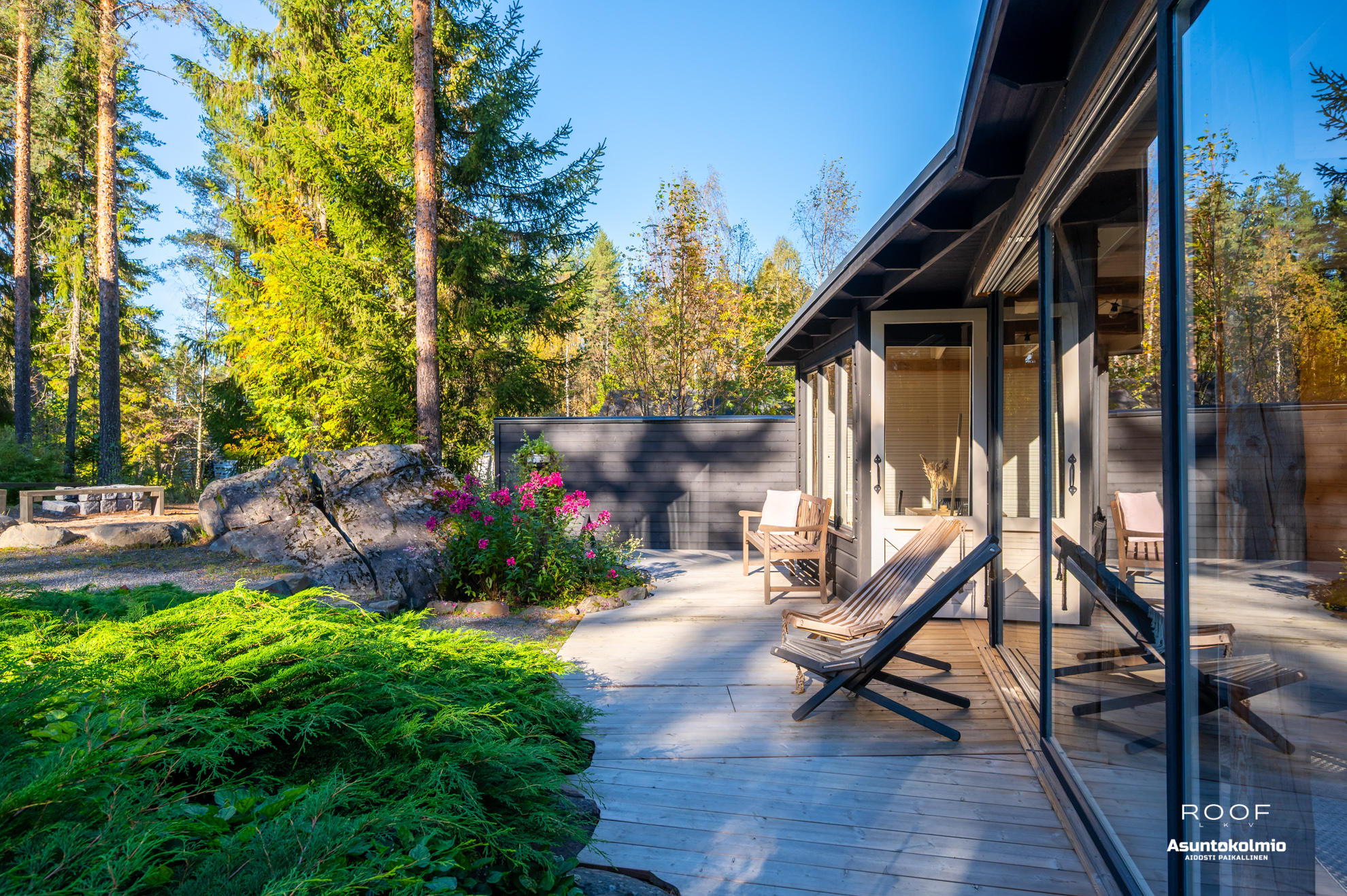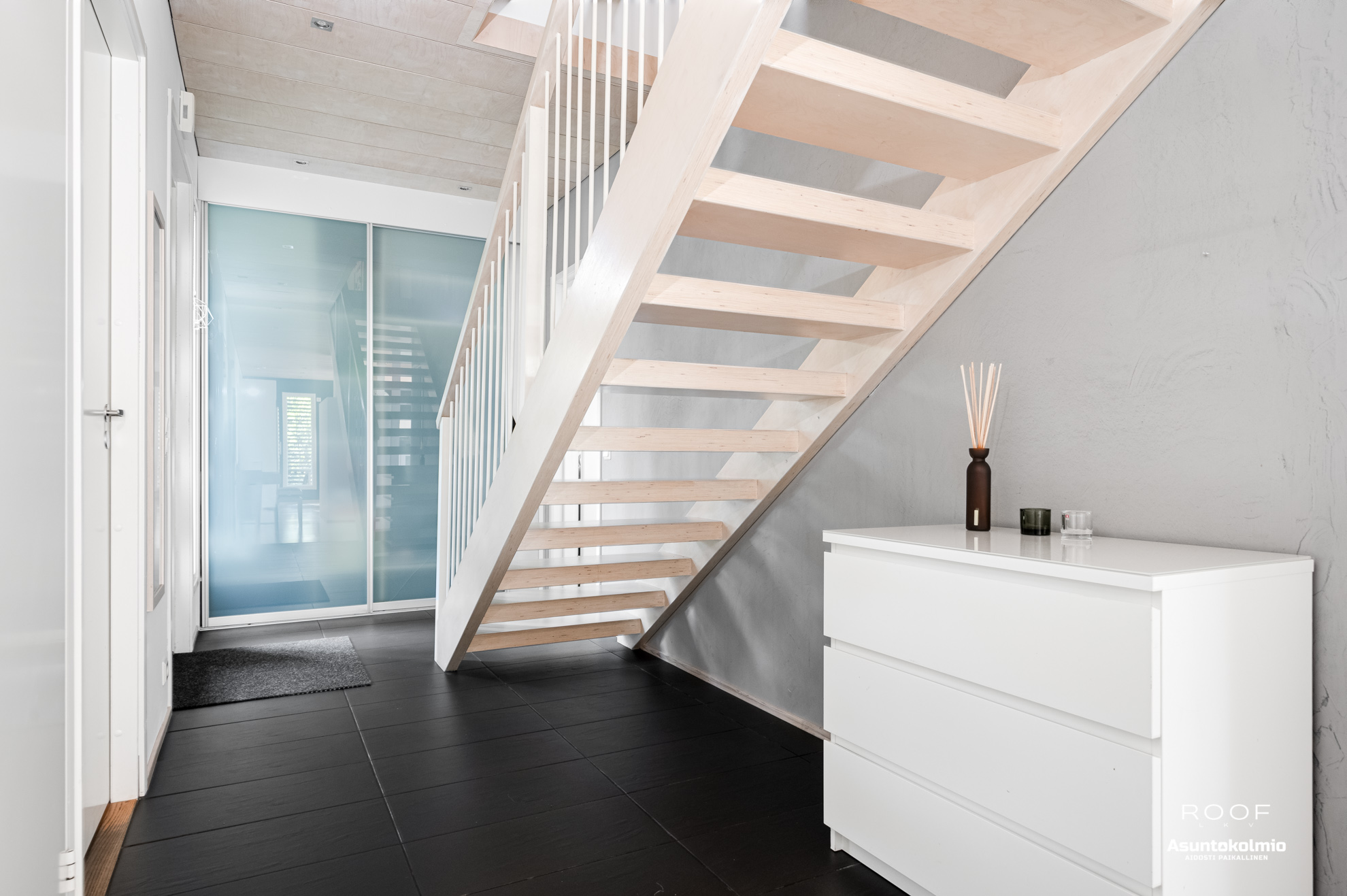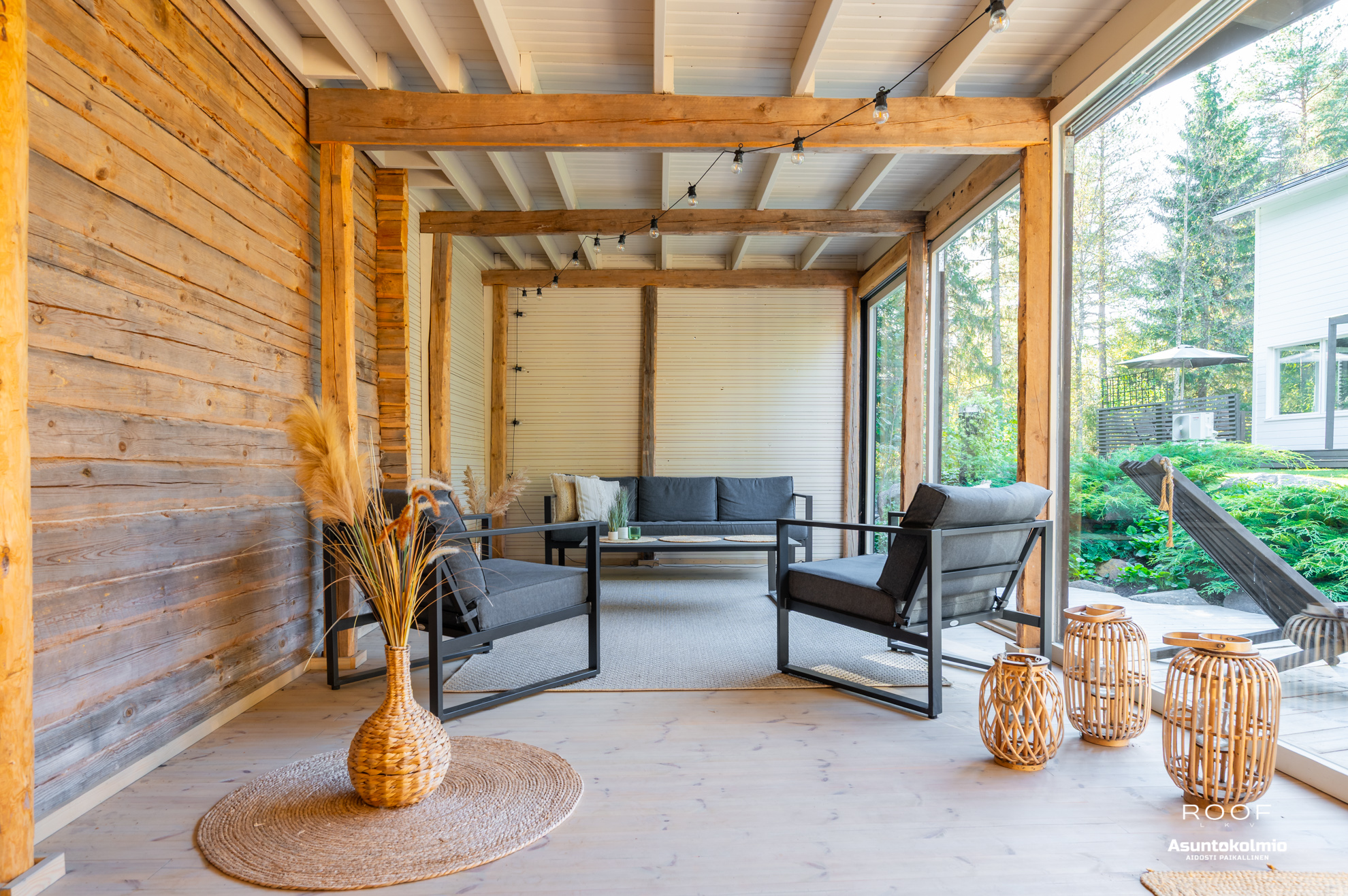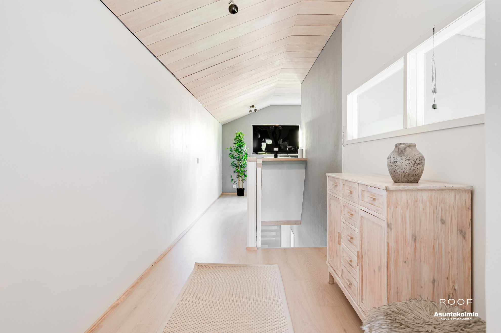 Tämä ihastuttava 5 makuuhuoneen koti on rakennettu vuonna 2009 ja on vielä tänäkin päivänä nykyaikaisen moderni ja silti kodikas ja käytännöllinen kokonaisuus. Kodin tiloissa on otettu huomioon etenkin lapsiperheen tarpeet ja arki onkin sujuvaa. Heti sisään tullessa on omalla sisäänkäynnillä oleva tilava arkieteinen, joka huomioi ulkoilevan/harrastavan perheen tarpeet. Kodin alakerrassa on 3 makuuhuonetta vanhemmille ja perheen pienimmille ja 2015 rakennetussa yläkerrassa on 2 makuuhuonetta ja aulatila perheen teineille tai etätyöläisille. Yhtenäisen olohuone-keittiön katseenvangitsijana on korkeampi huonekorkeus, isot kiinteät ikkunat metsän suuntaan ja vaneriset sisäkatot. Keittiössä on tilaa isommallekin ruokapöydälle ja sieltä on kulku isolle terassille. Lämmitys tapahtuu kauttaaltaan vesikiertoisin lattialämmityksin, lämmityksen apuna on ollut varaava takka ja ilmalämpöpumppu. Isolla perheellä lämmitys- ja käyttösähkökustannukset ovat olleet keskimäärin vain noin 200 €/kk.