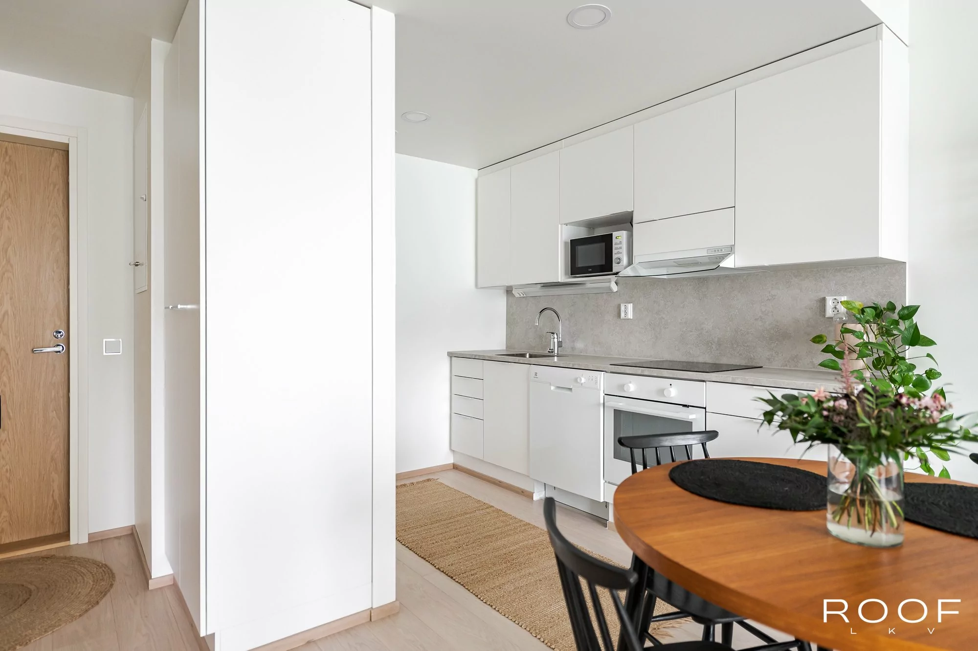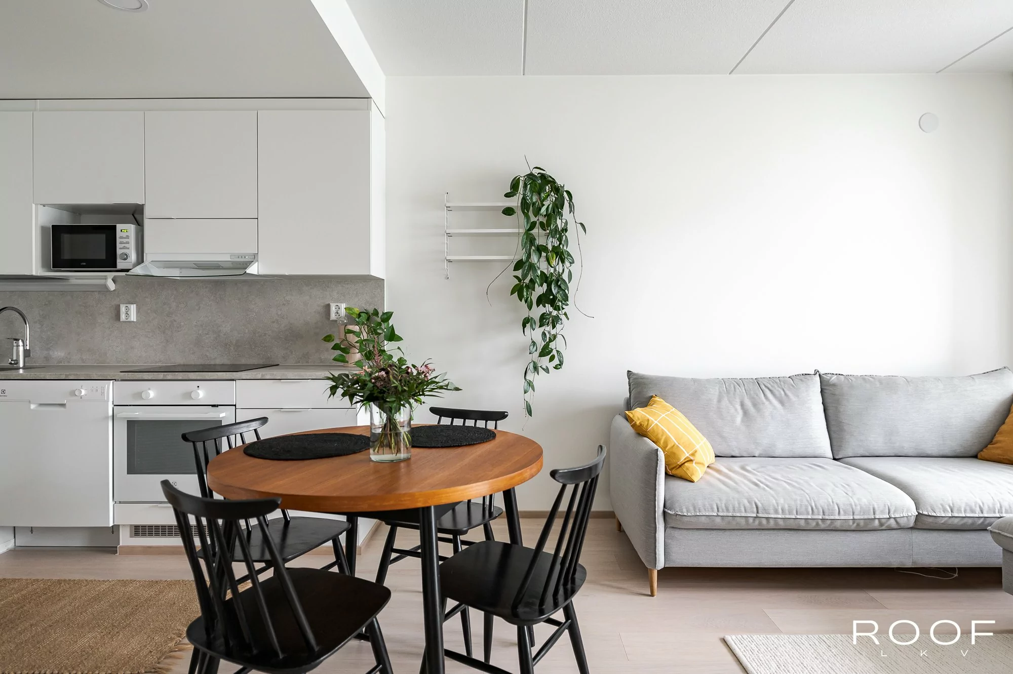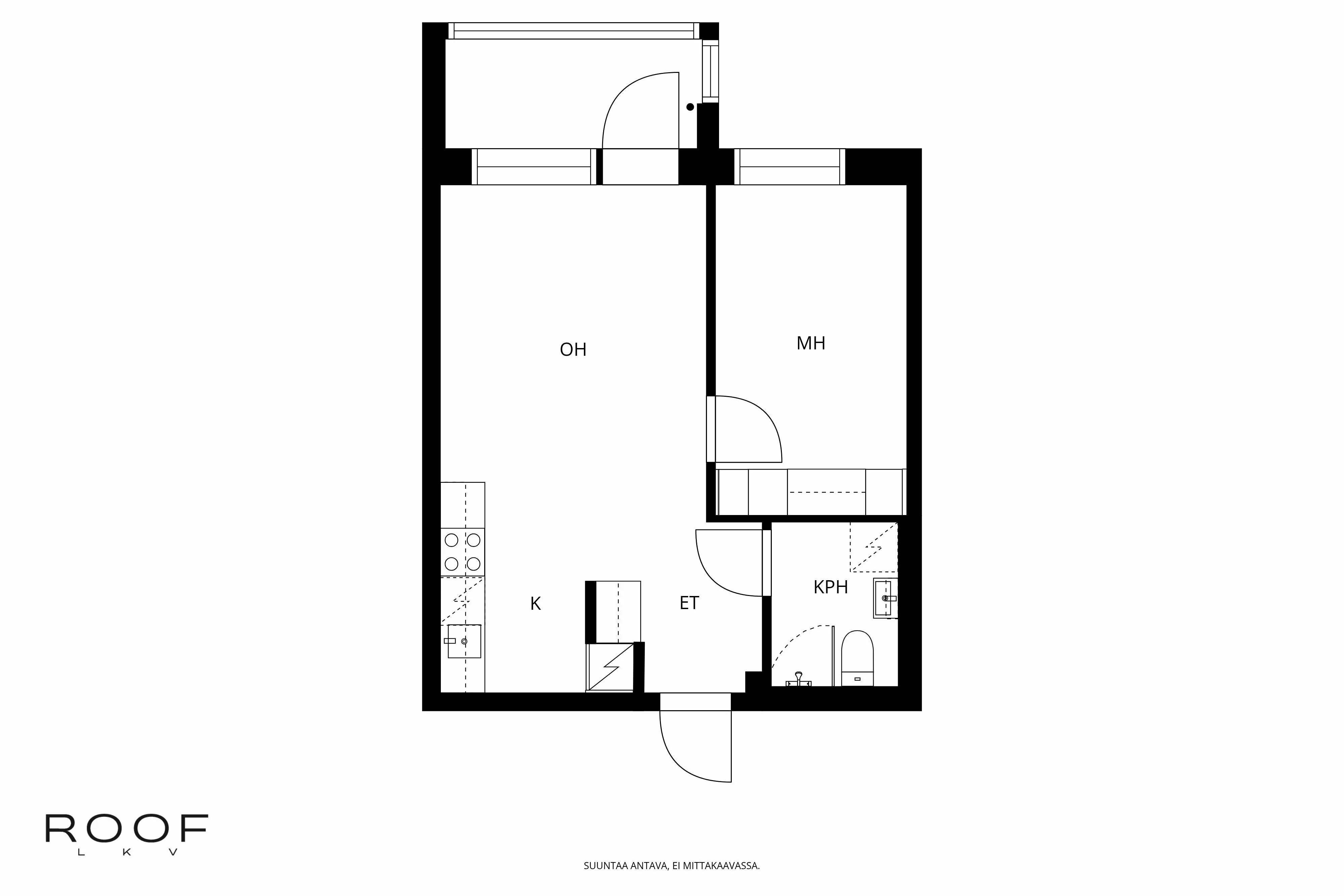 Makuuhuone, olohuone, keittiö, kylpyhuone, eteinen, parveke.