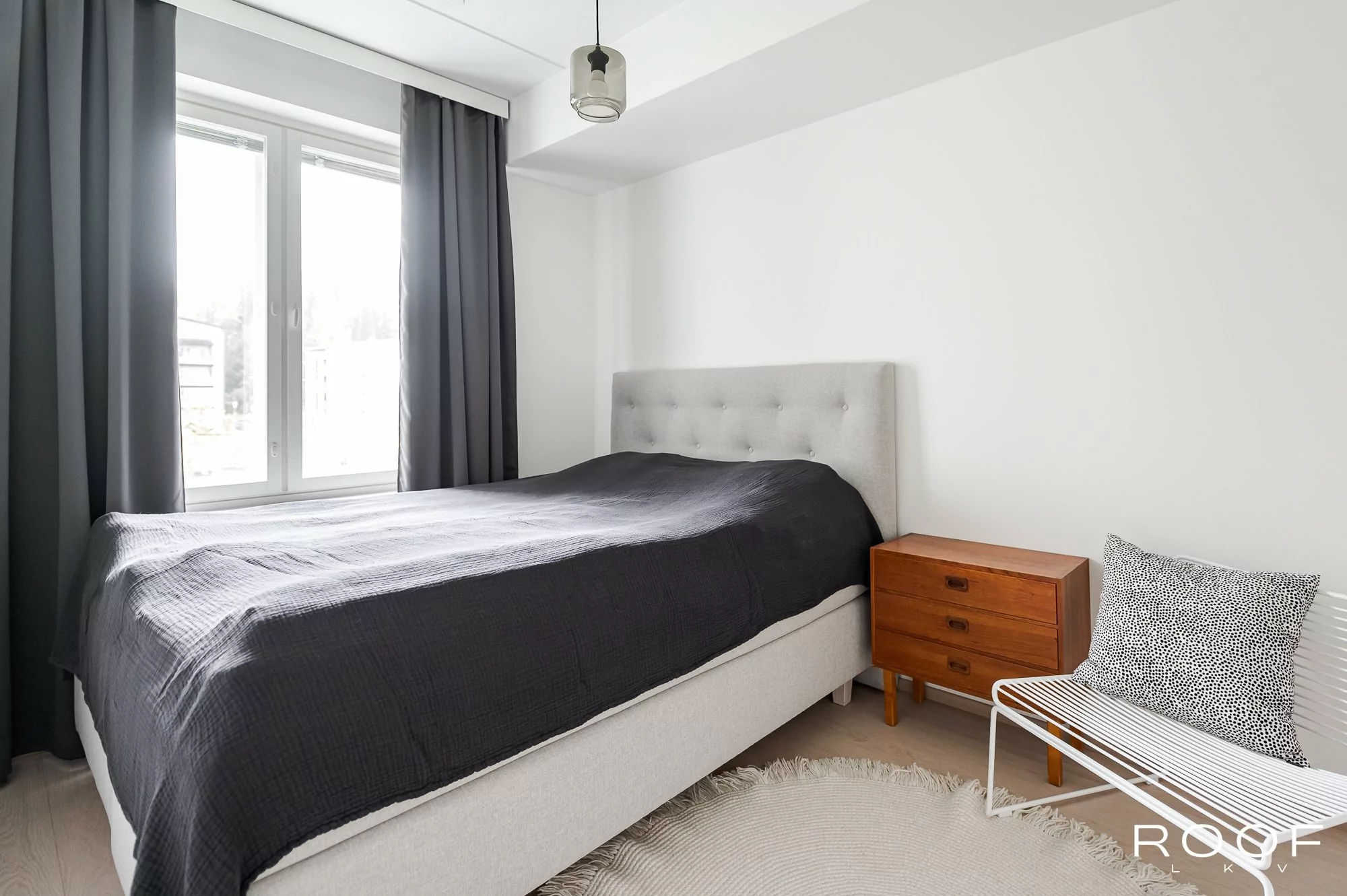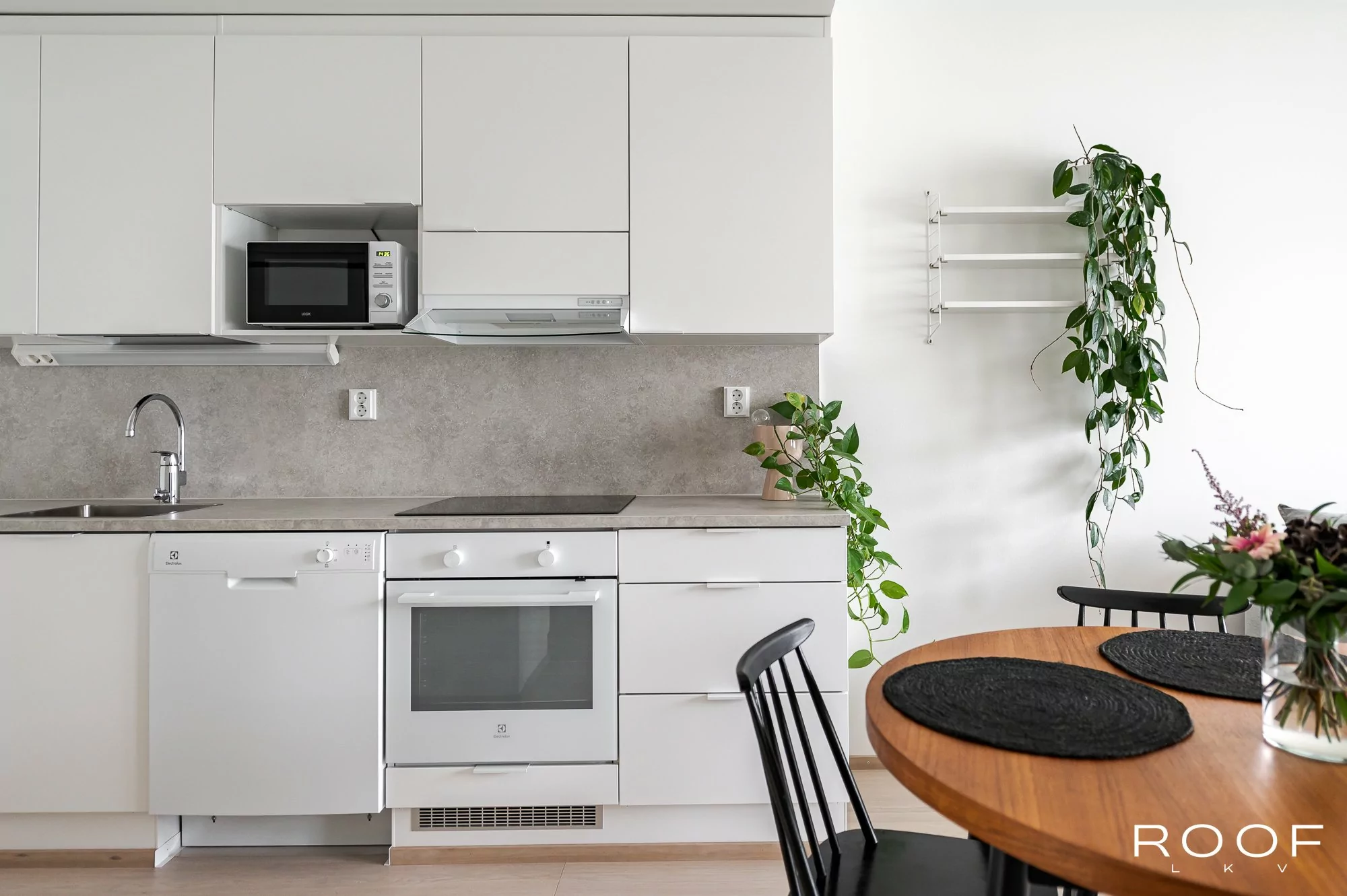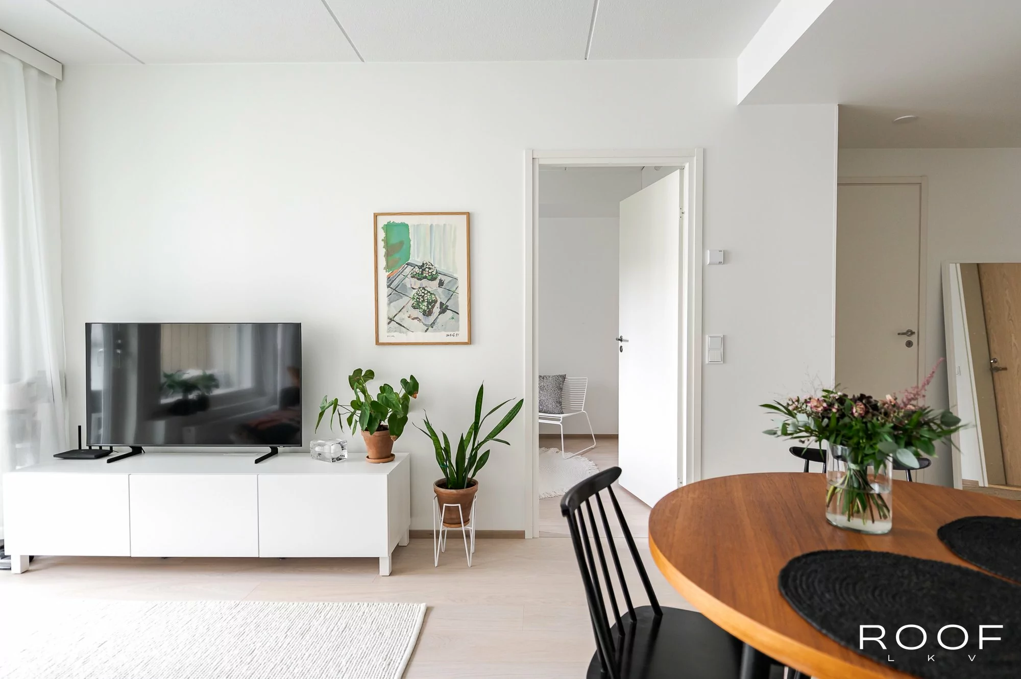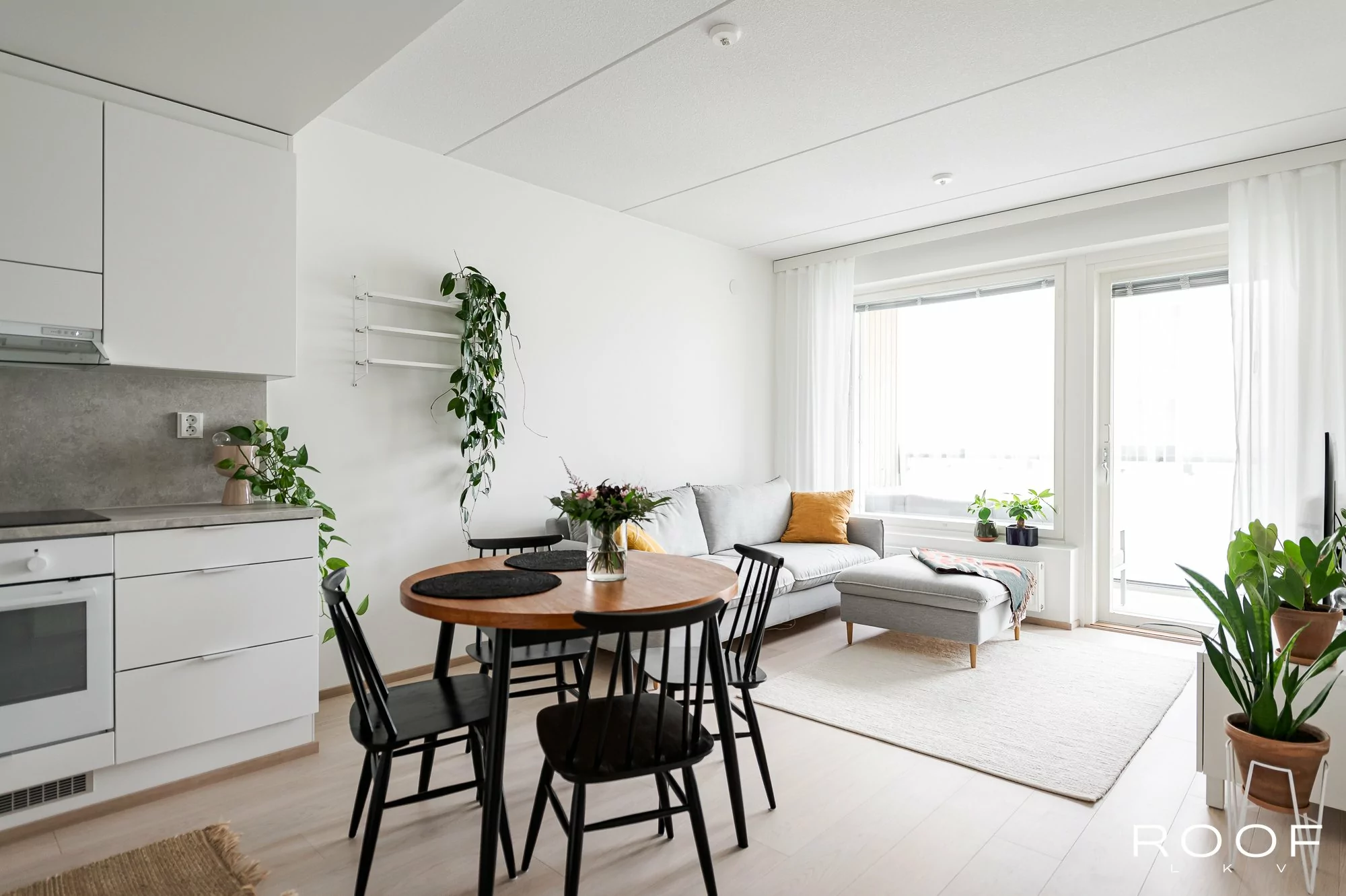 Makuuhuone, olohuone, keittiö, kylpyhuone, eteinen, parveke.