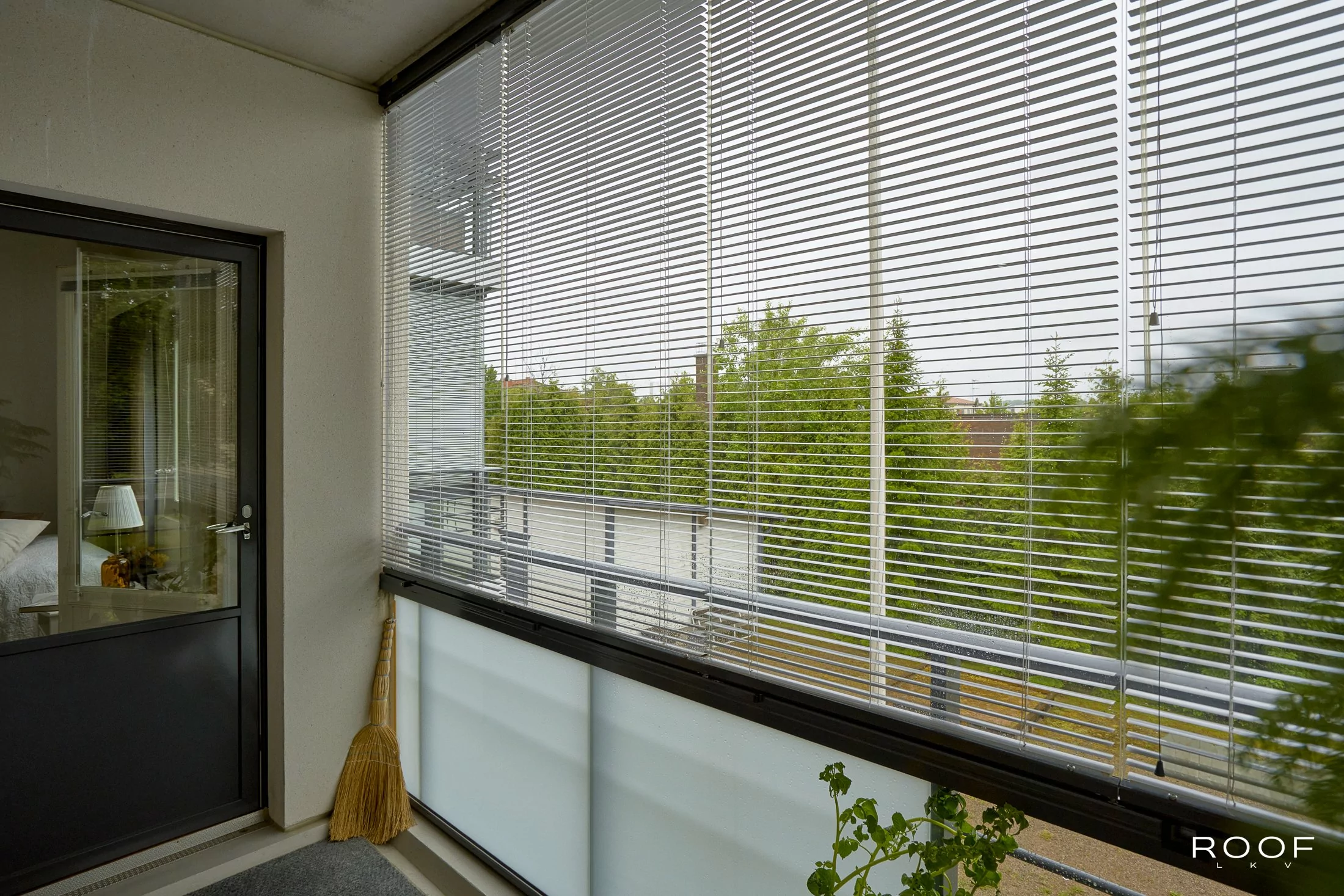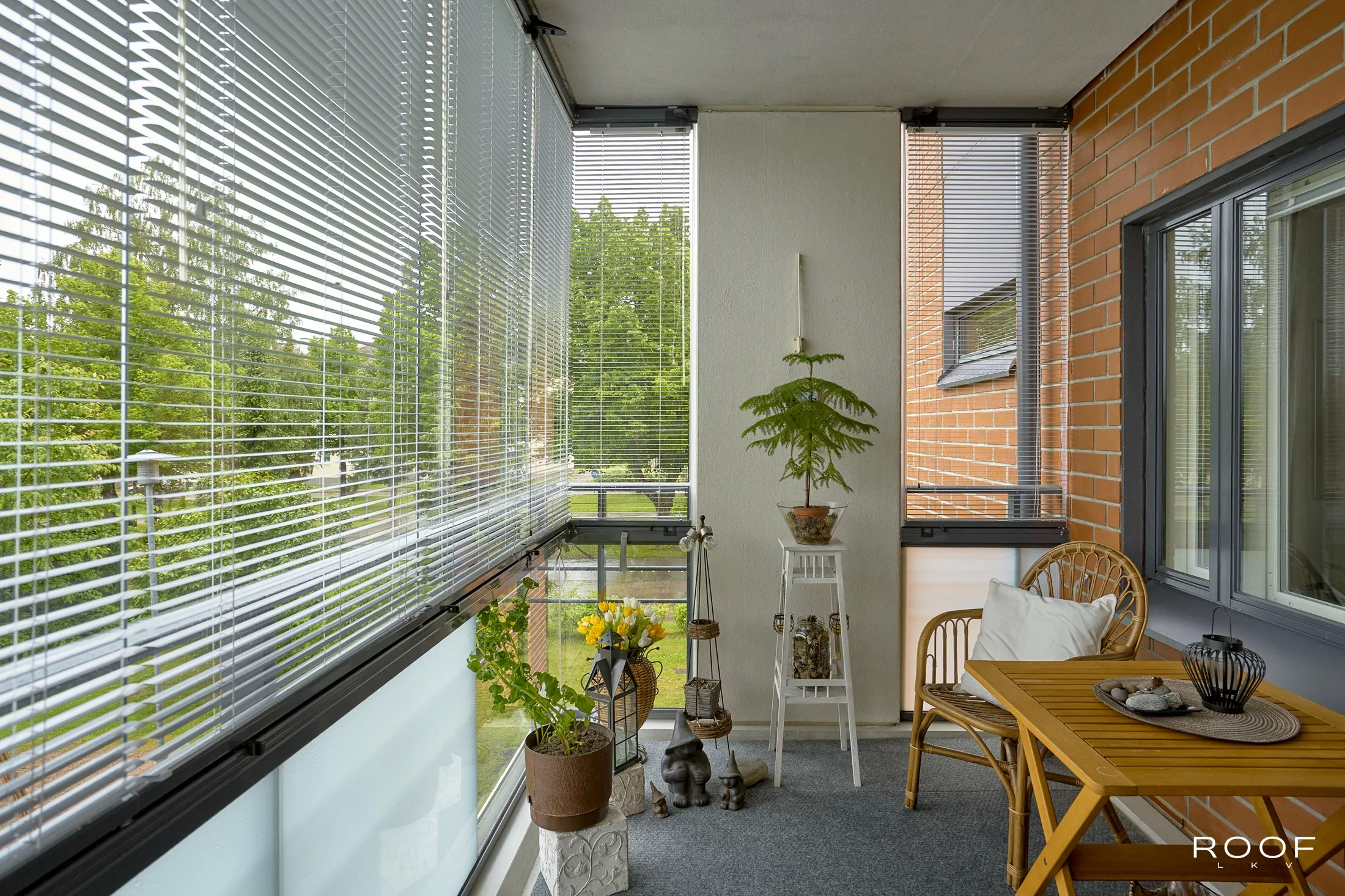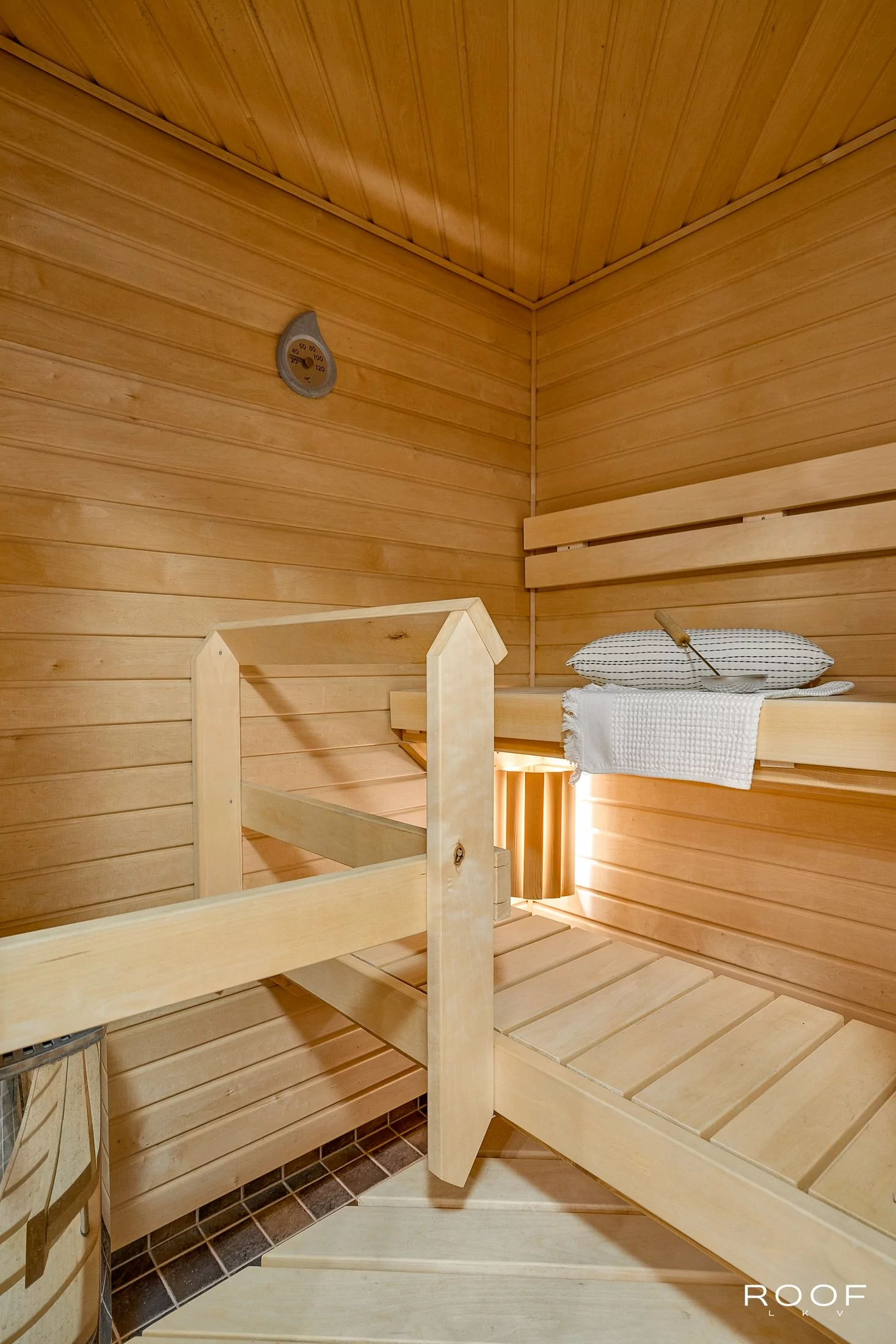 Tilava kylpyhuone on toimiva ja varustettu kaikella tarpeellisella. Oma sauna tuo arkeen rentouttavan lisän, ja lasitettu parveke toimii viihtyisänä lisähuoneena pitkälle syksyyn. Makuuhuoneessa on kaapistot säilytystilaa varten.