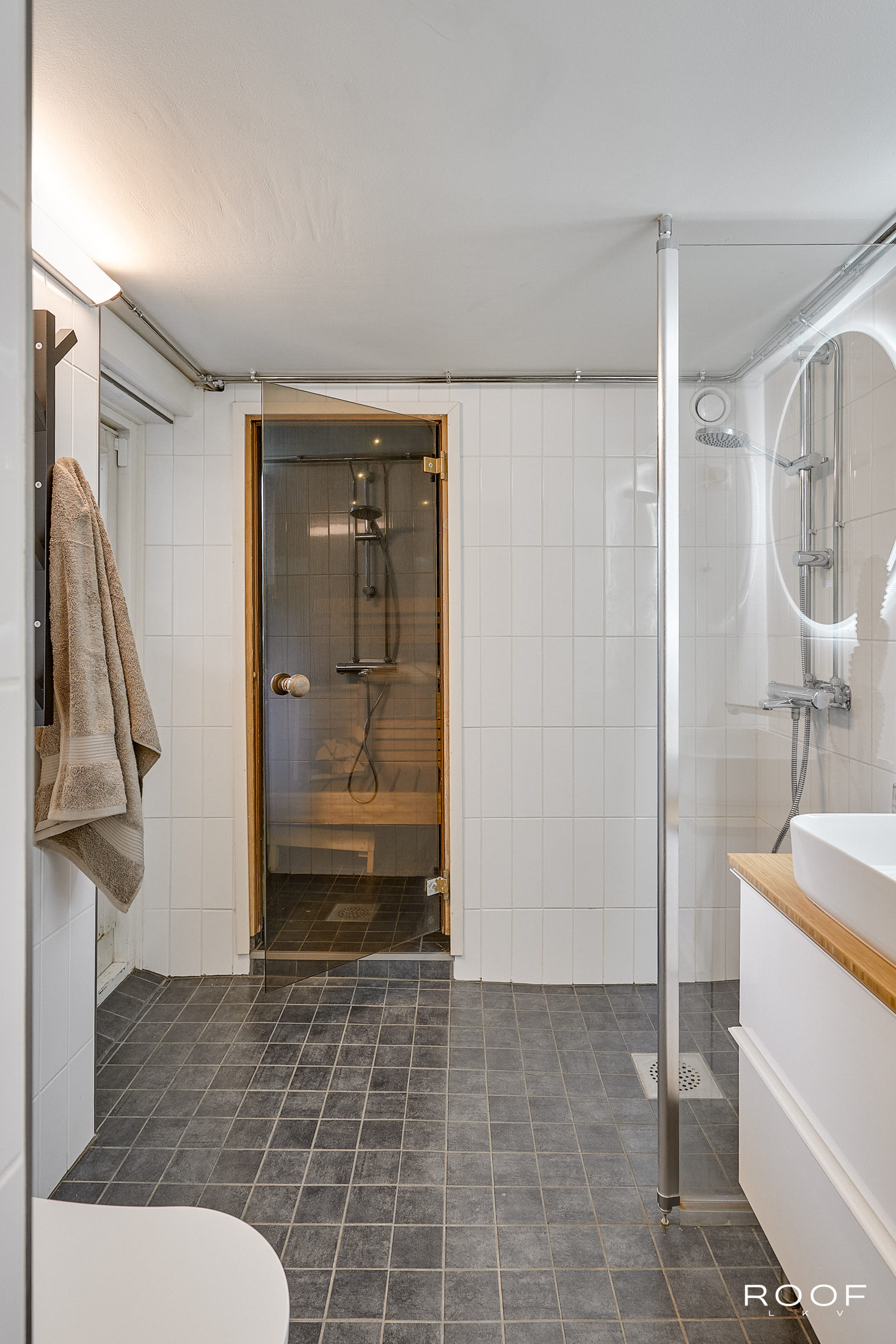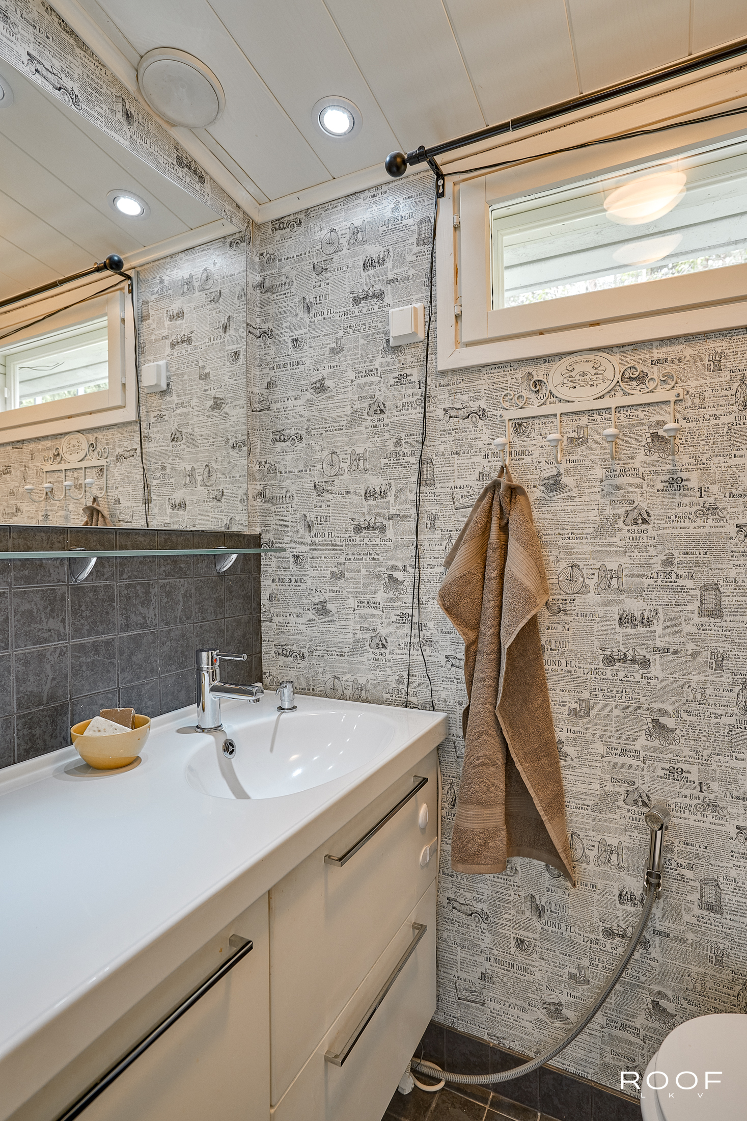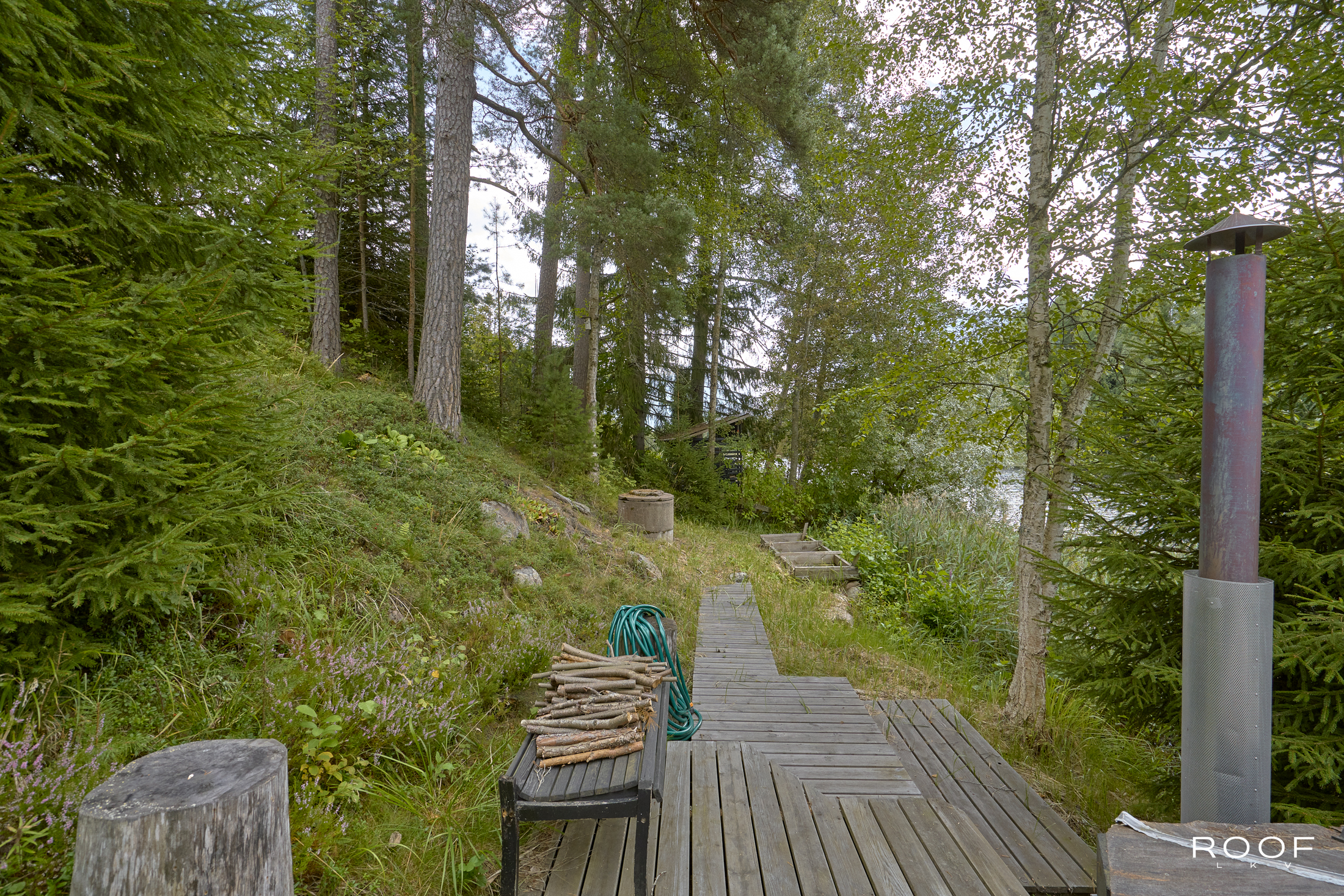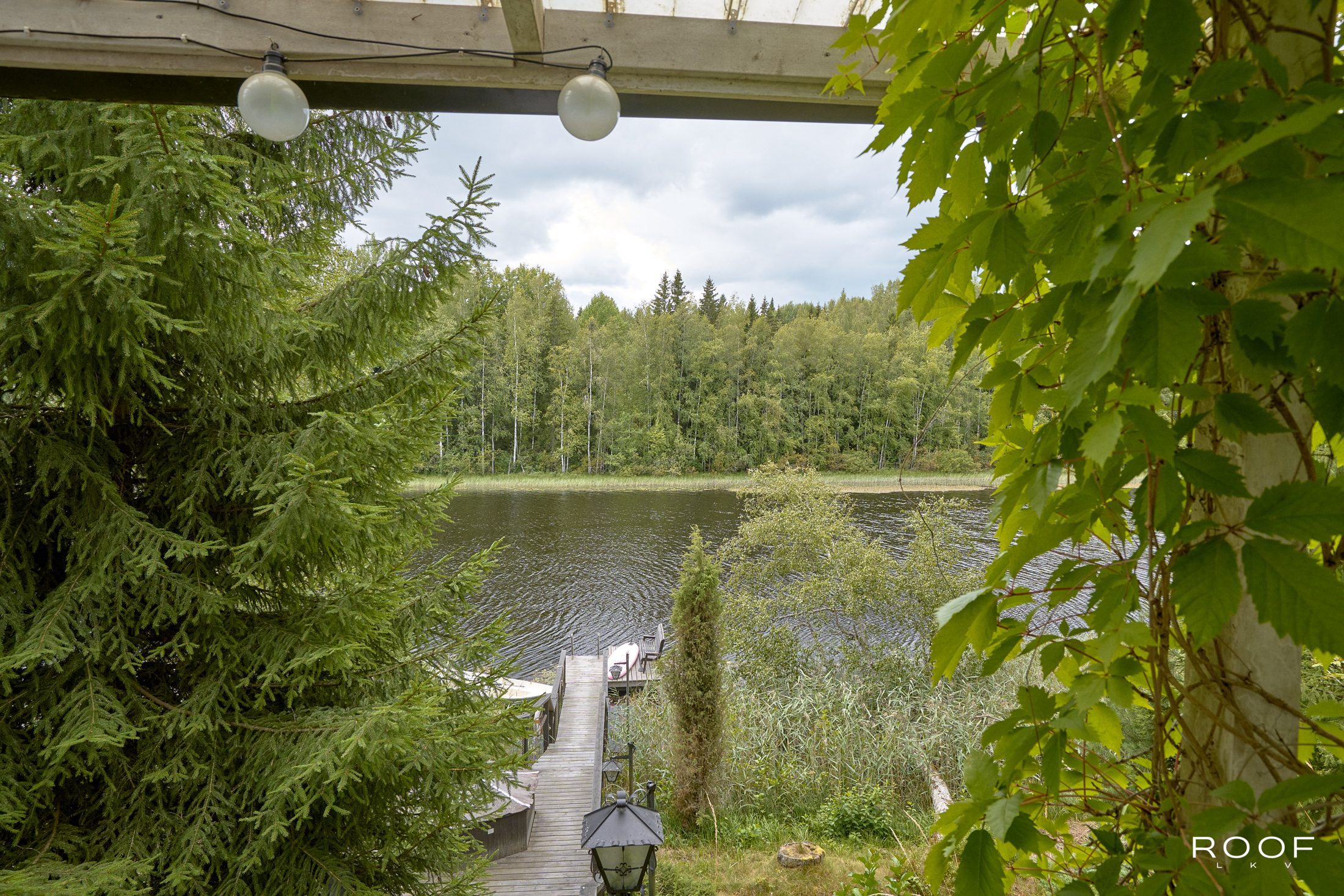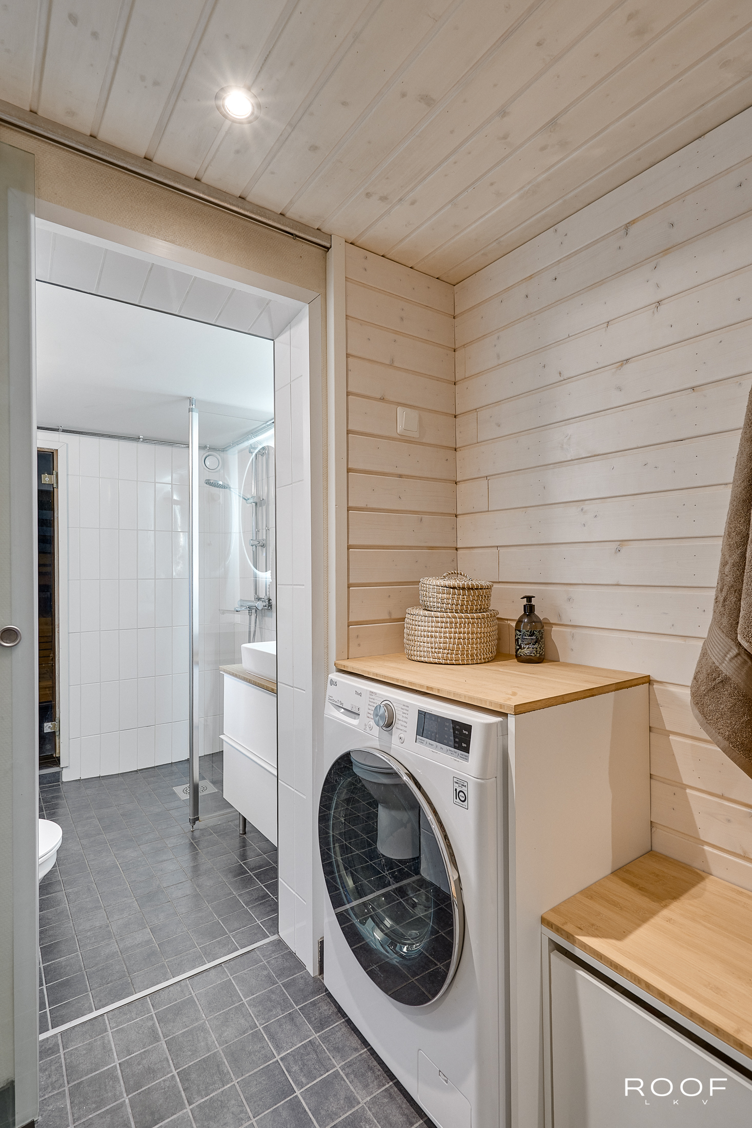 Vuonna 2022 uusitut kodinhoito-, sauna- ja pesutilat sijaitsevat alakerrassa, josta on myös käynti terassille. Molemmista kerroksista pääsee ulos, ja vain muutama askel puusaunan pehmeistä löylyistä vie virkistävään uintiin omassa rannassa. Laiturin yhteydessä odottaa palju – täydellinen paikka rentoutua luonnon helmassa.
