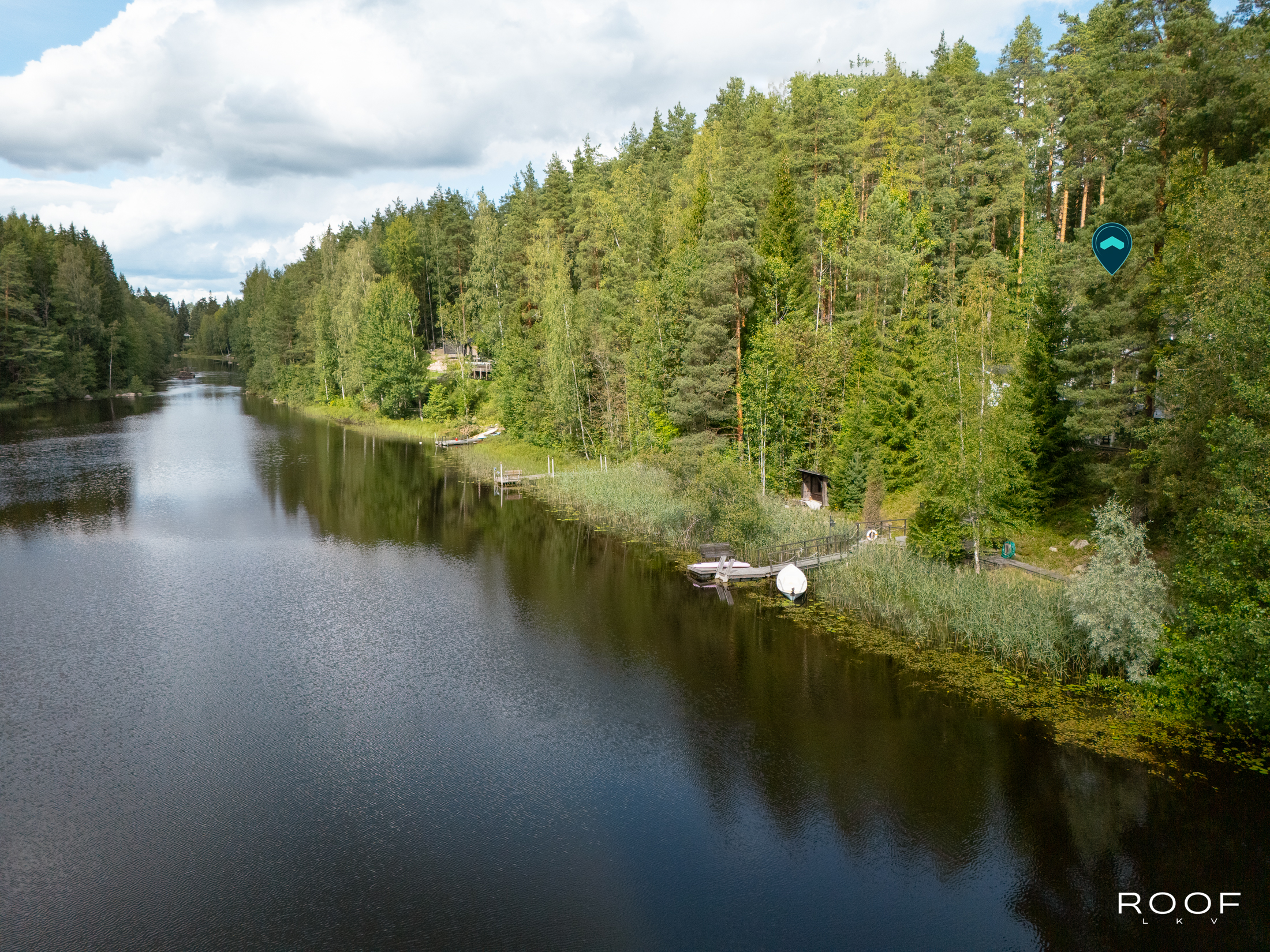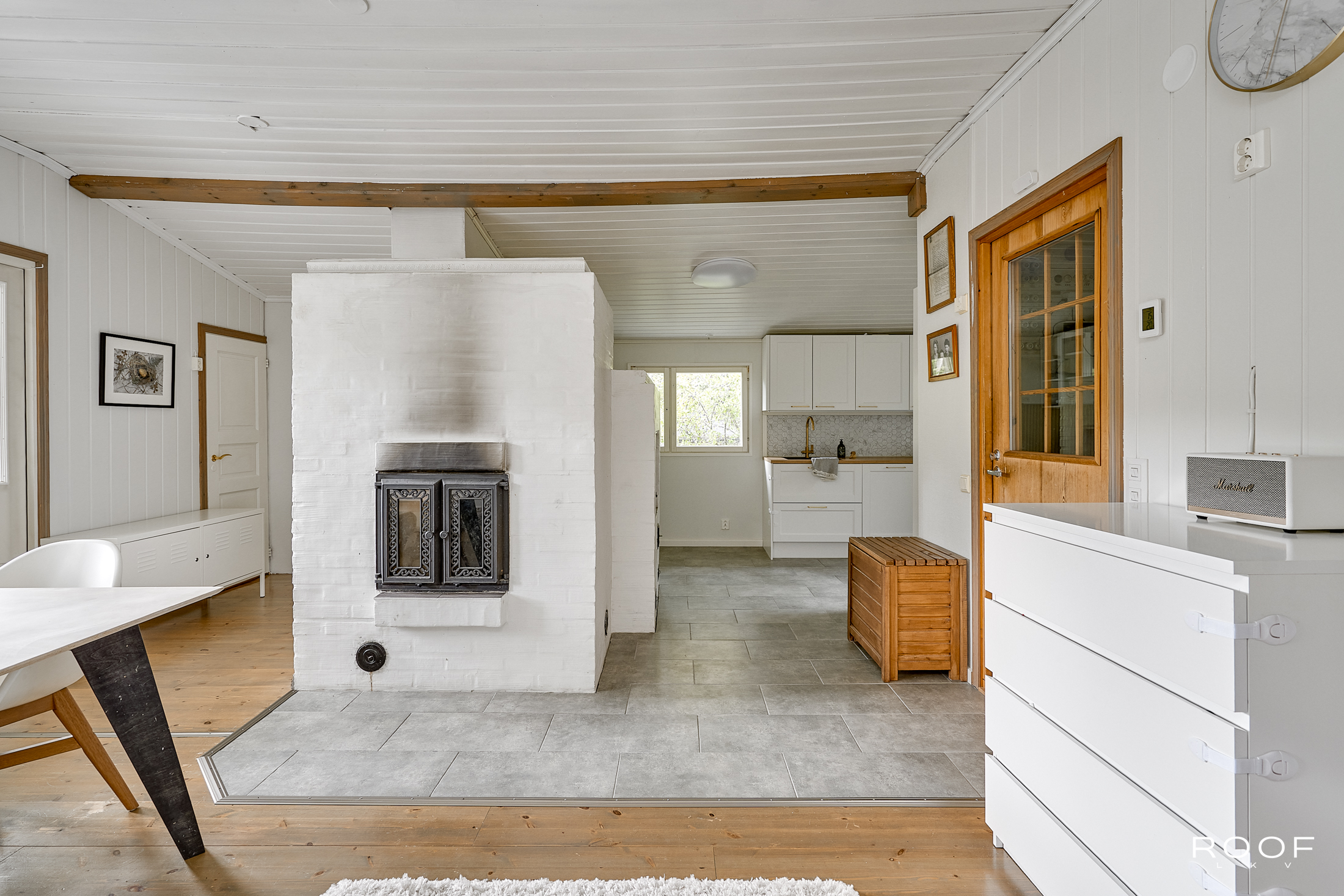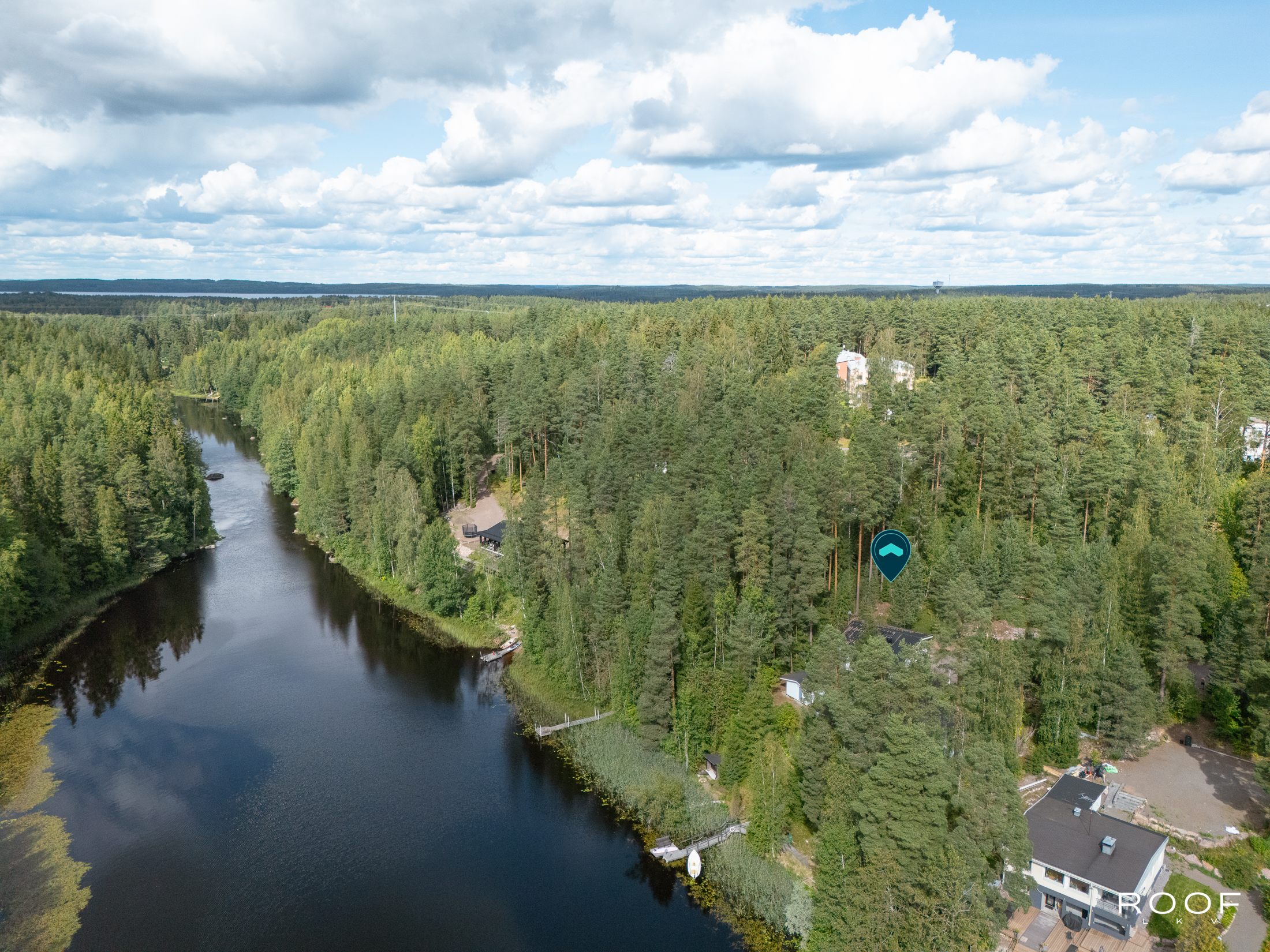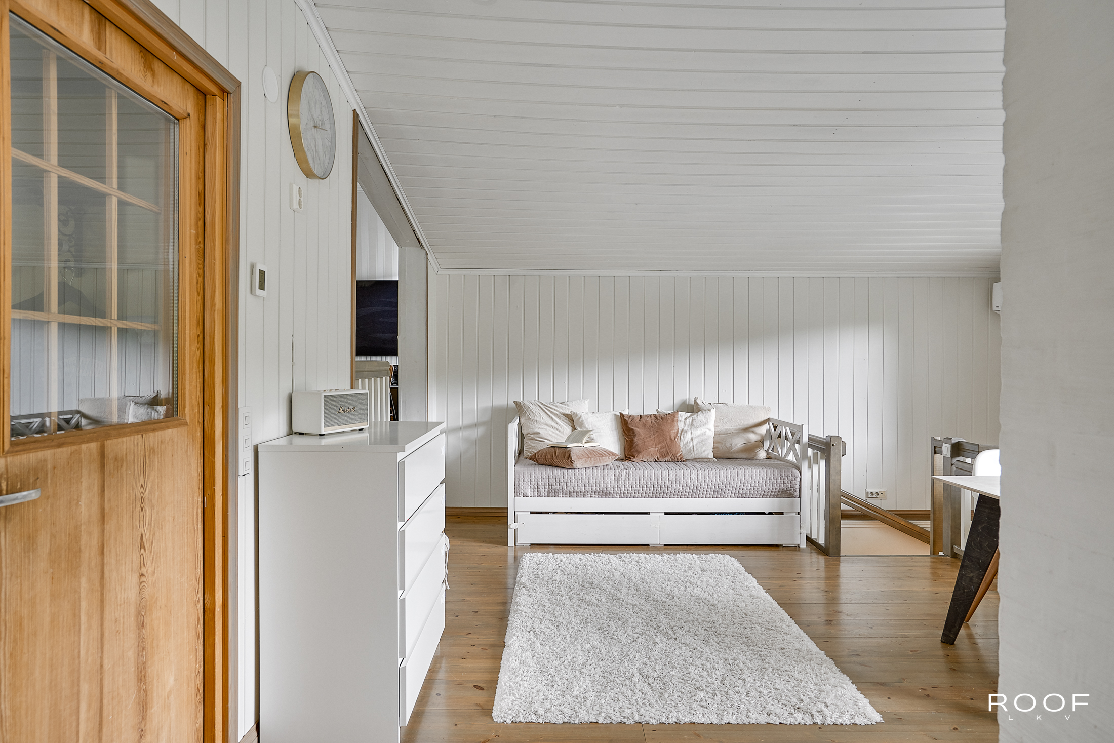 Yläkerran tilat jakautuvat kahteen tasoon: ylätasolla sijaitsevat kaksi makuuhuonetta ja aulatila, alatasolla avautuu valoisa olohuone ja tyylikäs keittiö, jossa kodikkuutta ja lämpöä luo takka leivinuunilla. Olohuoneesta ja yläkerran terassilta avautuu lumoava näkymä joelle – maisema, joka kutsuu pysähtymään ja nauttimaan luonnon kauneudesta.