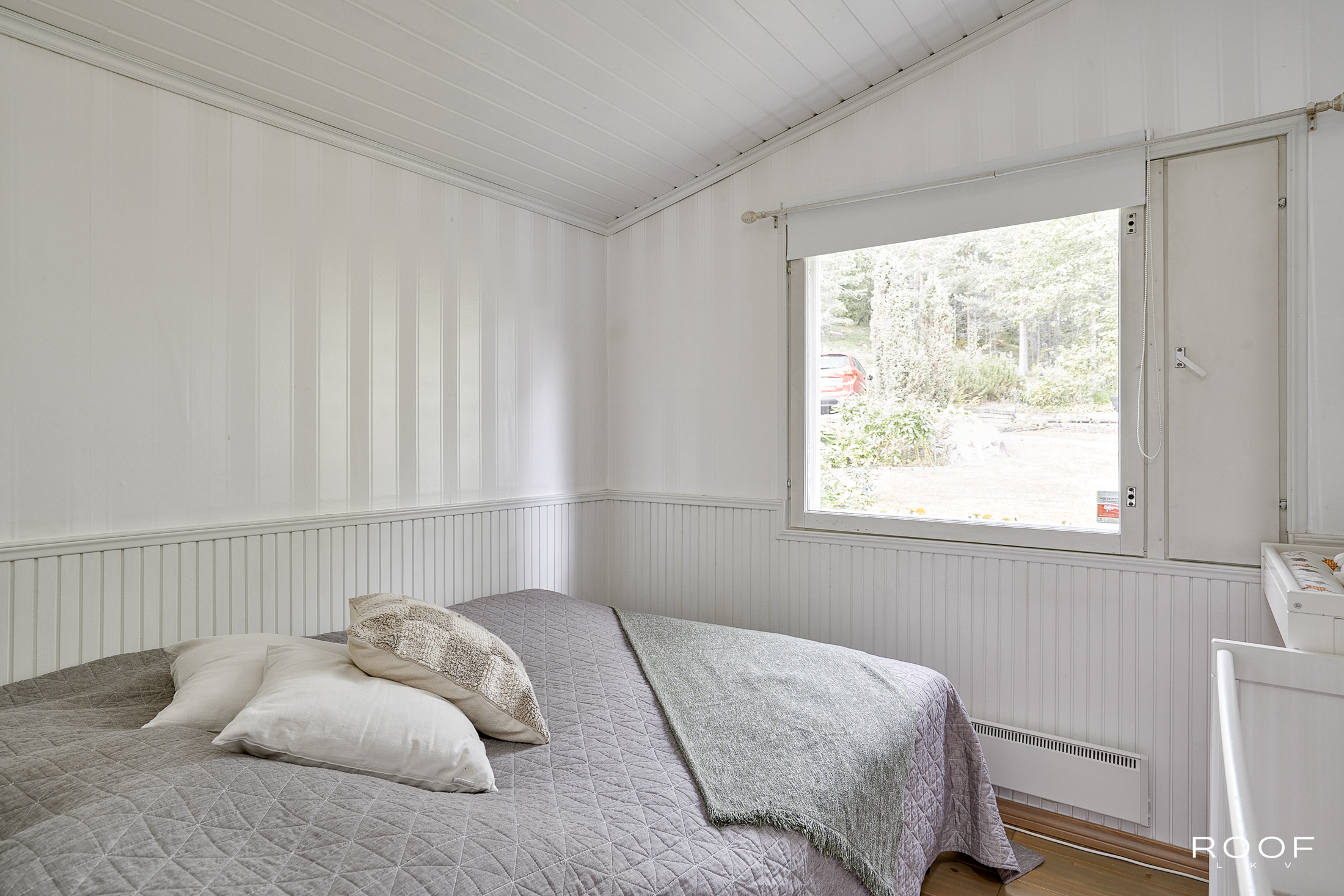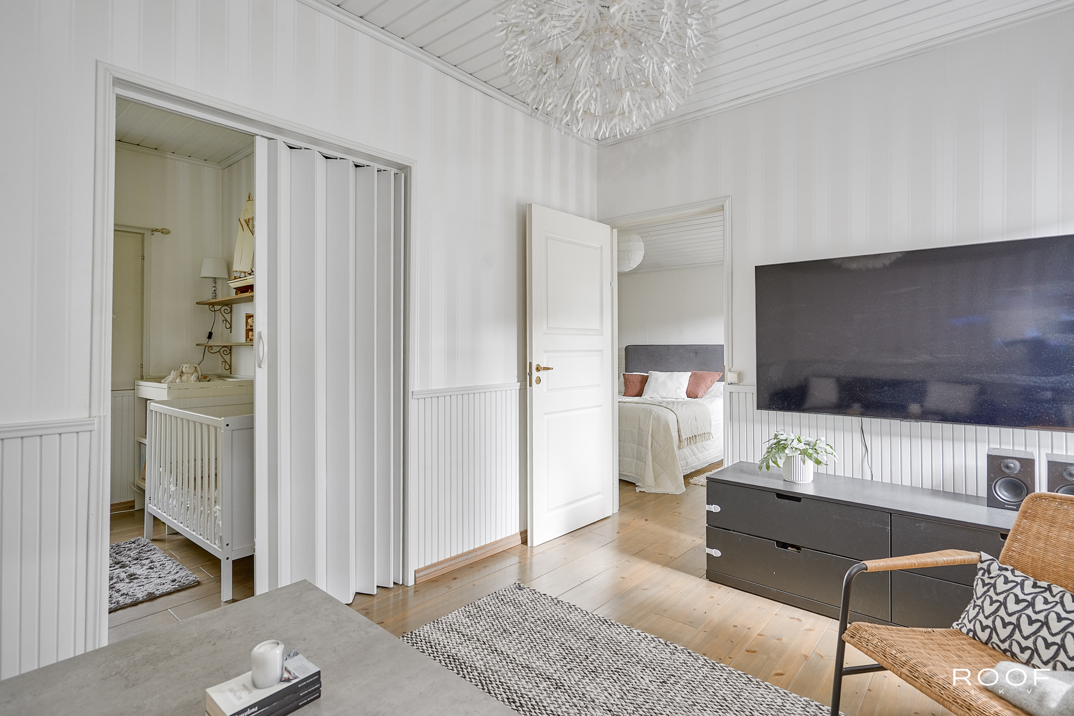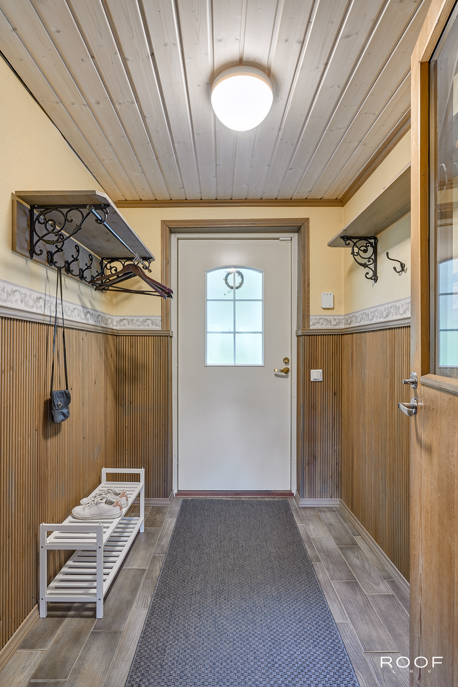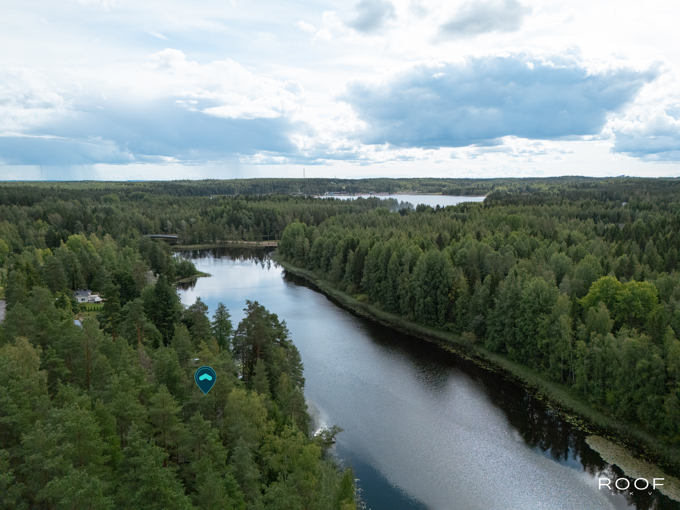 Yläkerran tilat jakautuvat kahteen tasoon: ylätasolla sijaitsevat kaksi makuuhuonetta ja aulatila, alatasolla avautuu valoisa olohuone ja tyylikäs keittiö, jossa kodikkuutta ja lämpöä luo takka leivinuunilla. Olohuoneesta ja yläkerran terassilta avautuu lumoava näkymä joelle – maisema, joka kutsuu pysähtymään ja nauttimaan luonnon kauneudesta.