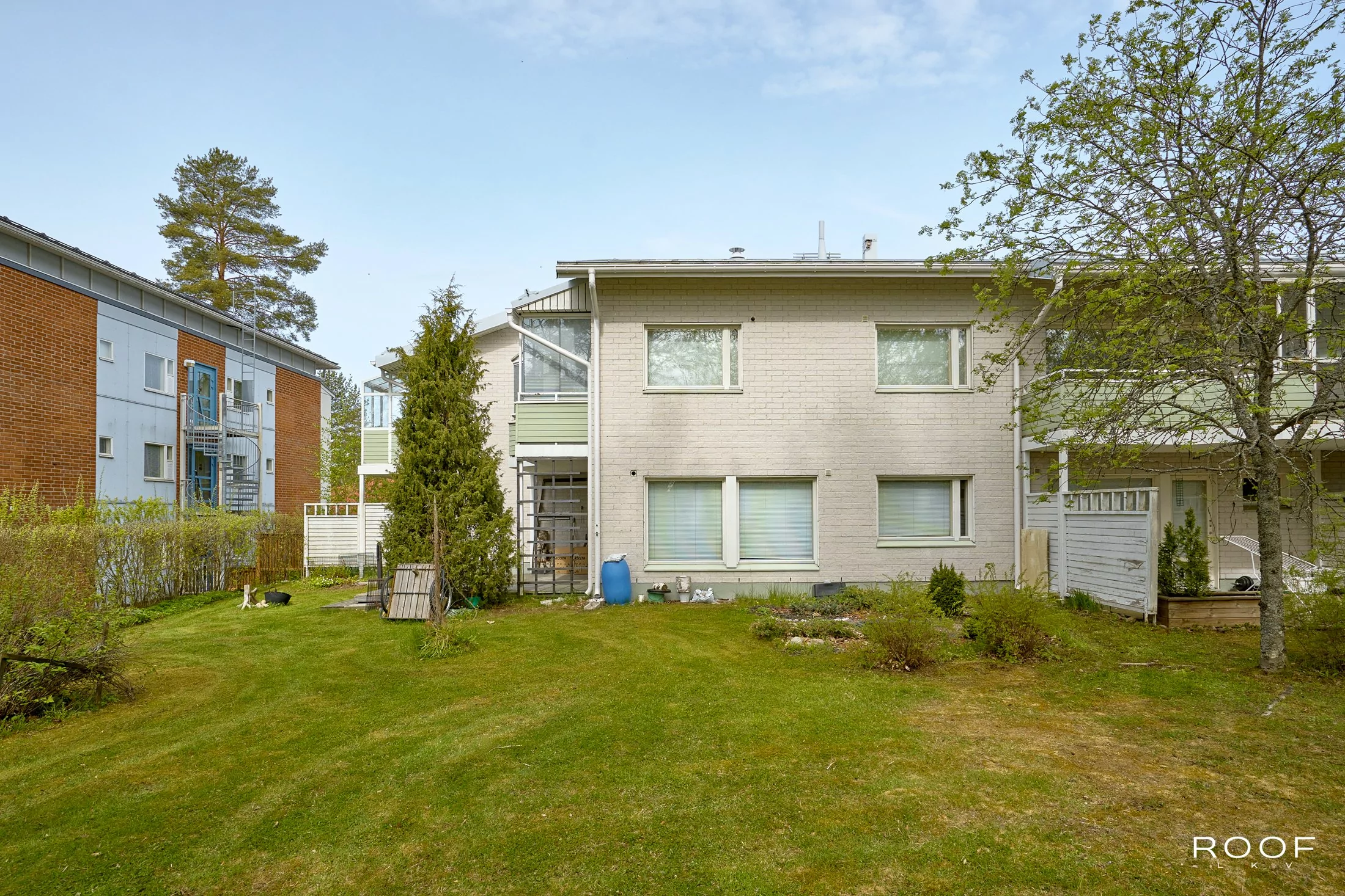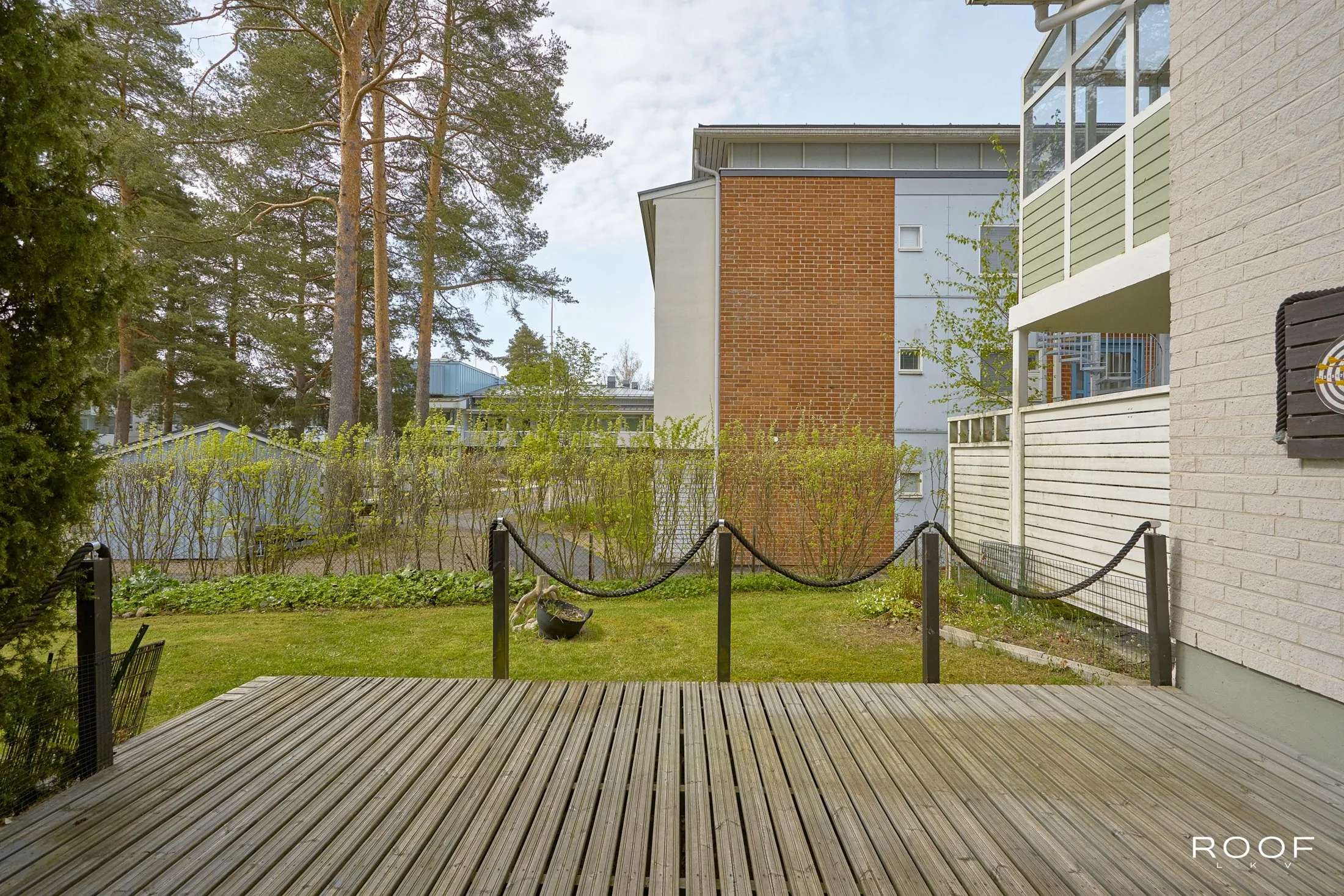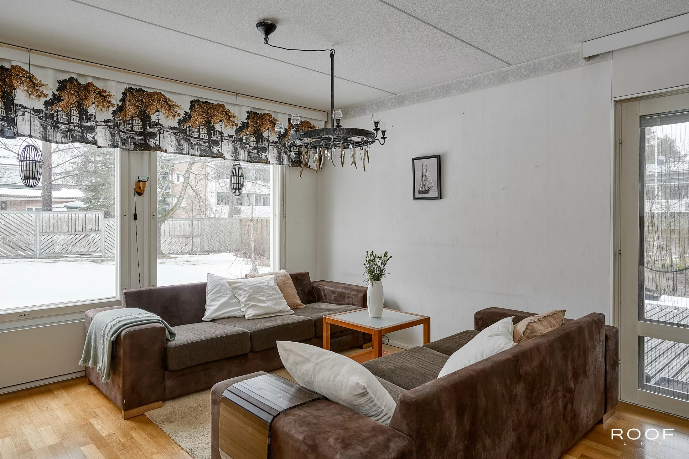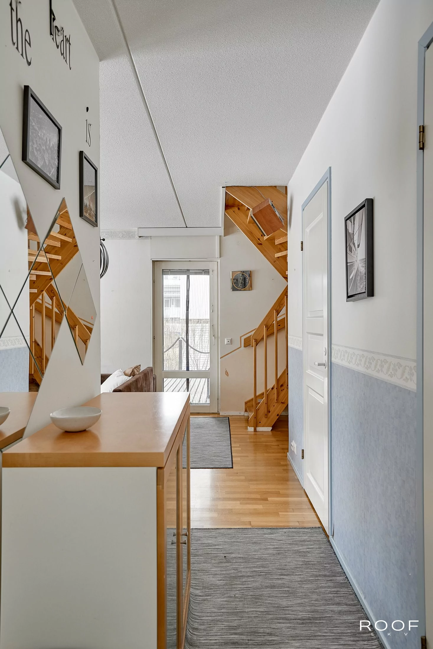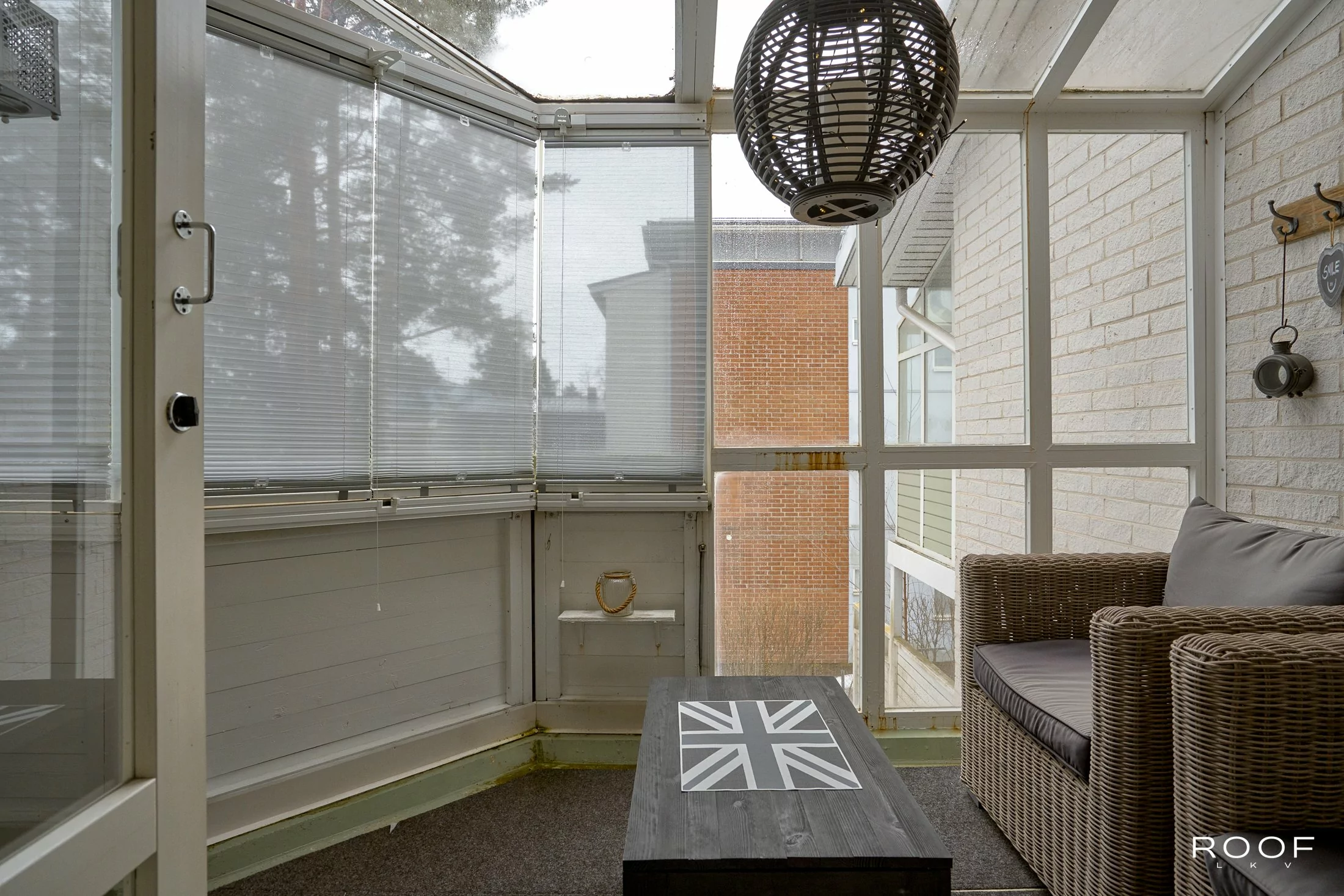 Alakerrassa on vaalea keittiö ja valoisa olohuone, josta on käynti terassille ja suurelle, suojaisalle pihalle. Lisäksi alakerrassa on erillinen wc ja pieni tila kodinhoidolle. Yläkerrasta löytyvät pesu- ja saunatilat, takkahuone sekä kaksi tilavaa makuuhuonetta. Yläkerrassa on myös iso lasitettu parveke, jossa voit vilvoitella saunan jälkeen.