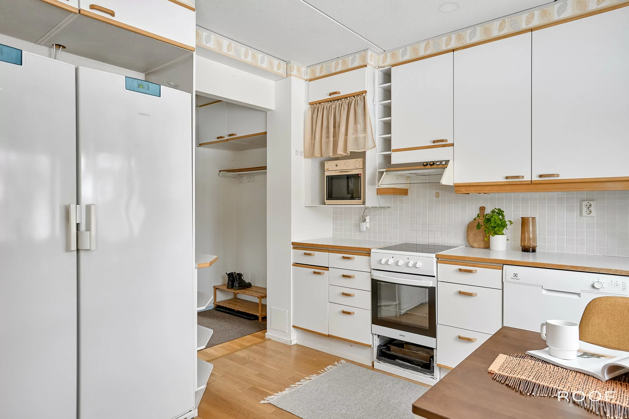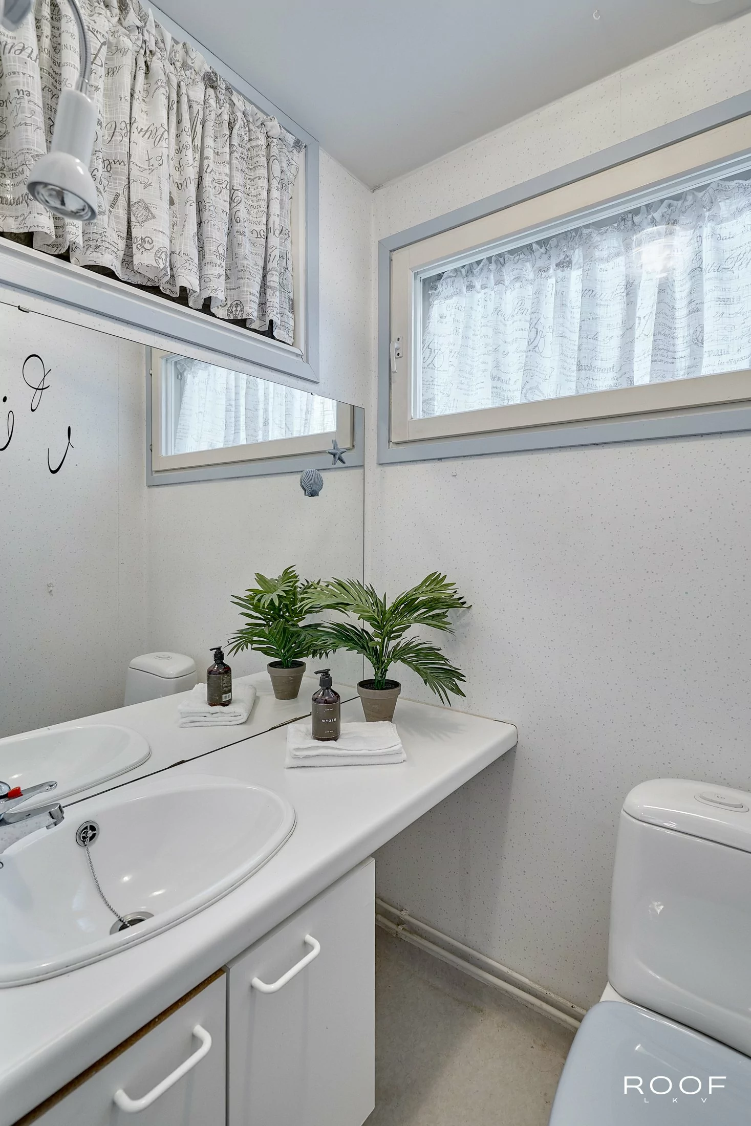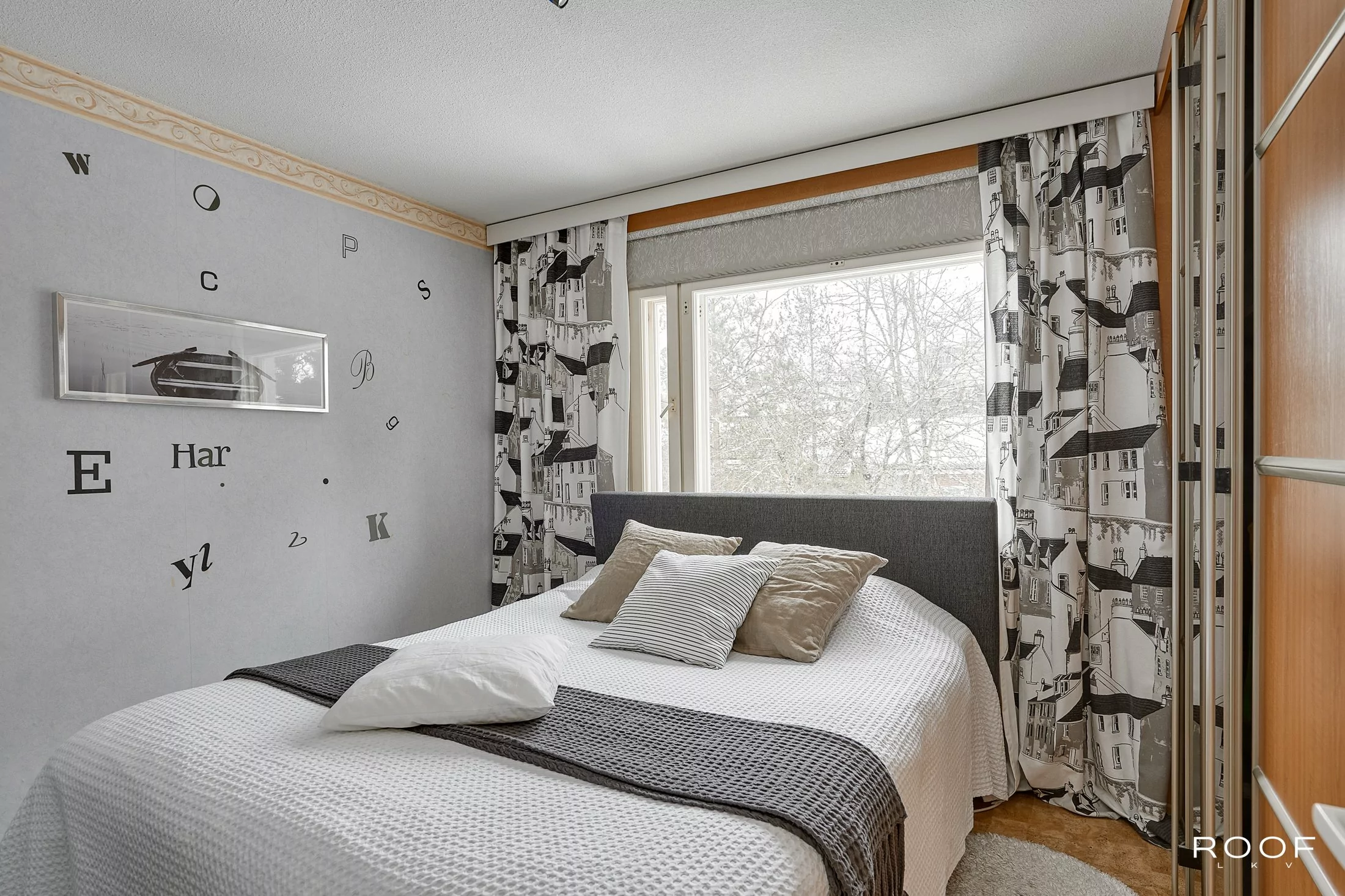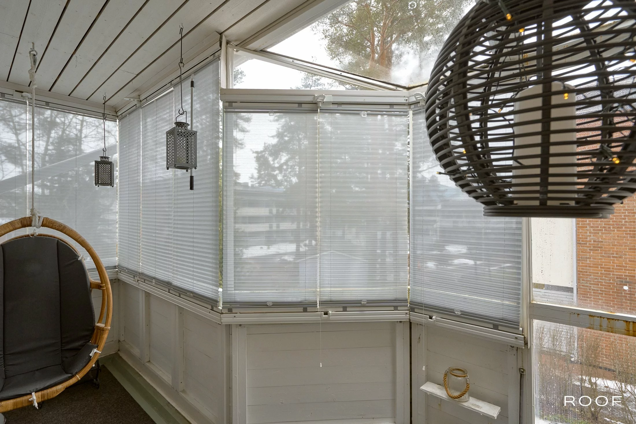 Alakerrassa on vaalea keittiö ja valoisa olohuone, josta on käynti terassille ja suurelle, suojaisalle pihalle. Lisäksi alakerrassa on erillinen wc ja pieni tila kodinhoidolle. Yläkerrasta löytyvät pesu- ja saunatilat, takkahuone sekä kaksi tilavaa makuuhuonetta. Yläkerrassa on myös iso lasitettu parveke, jossa voit vilvoitella saunan jälkeen.