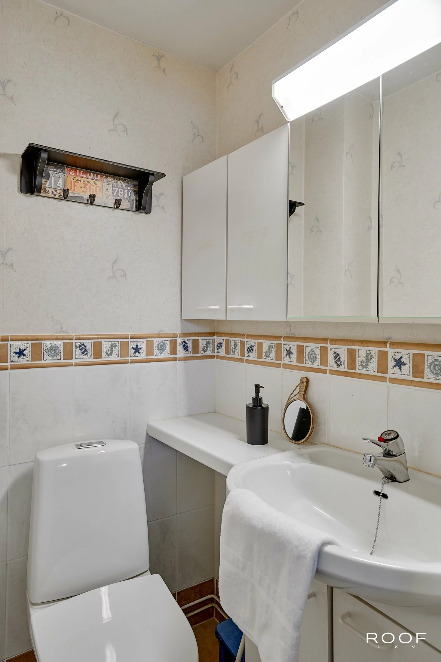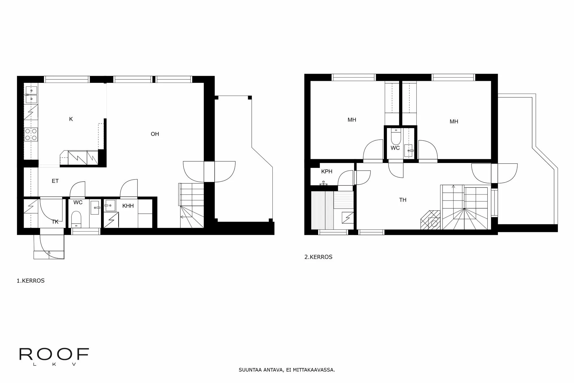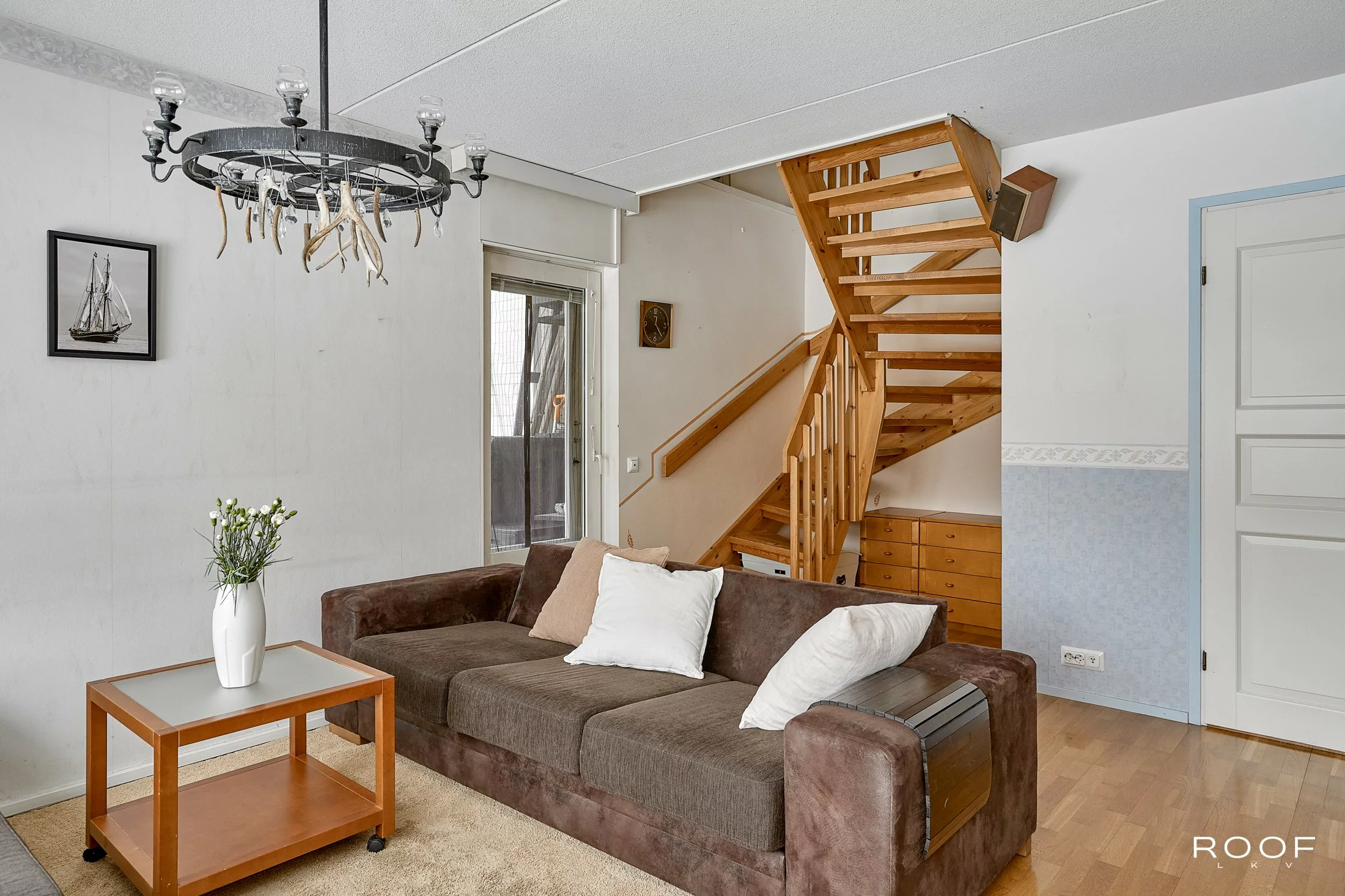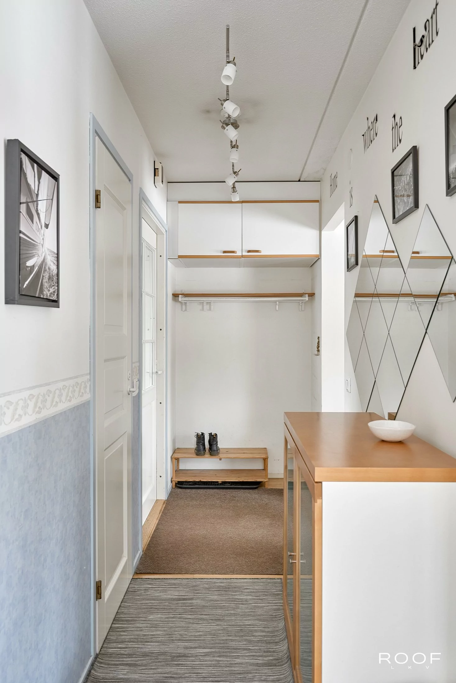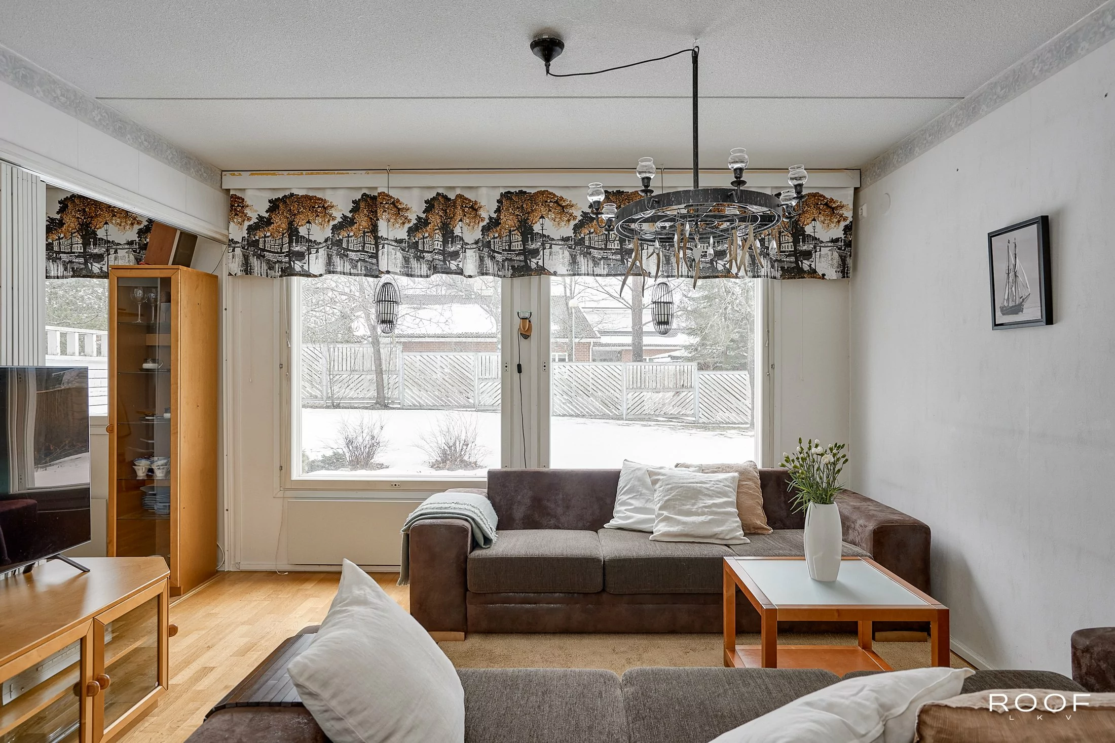 Alakerrassa on vaalea keittiö ja valoisa olohuone, josta on käynti terassille ja suurelle, suojaisalle pihalle. Lisäksi alakerrassa on erillinen wc ja pieni tila kodinhoidolle. Yläkerrasta löytyvät pesu- ja saunatilat, takkahuone sekä kaksi tilavaa makuuhuonetta. Yläkerrassa on myös iso lasitettu parveke, jossa voit vilvoitella saunan jälkeen.