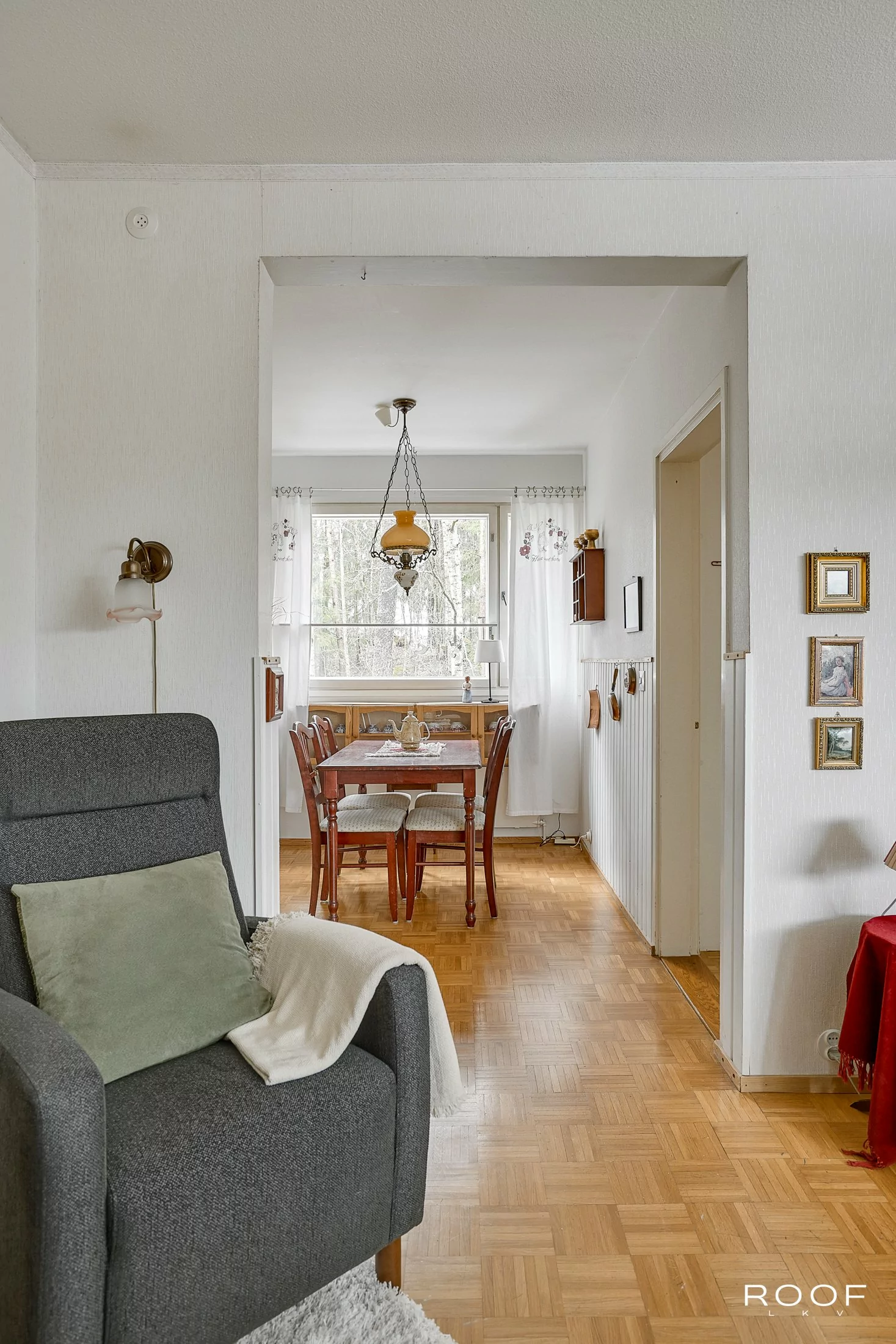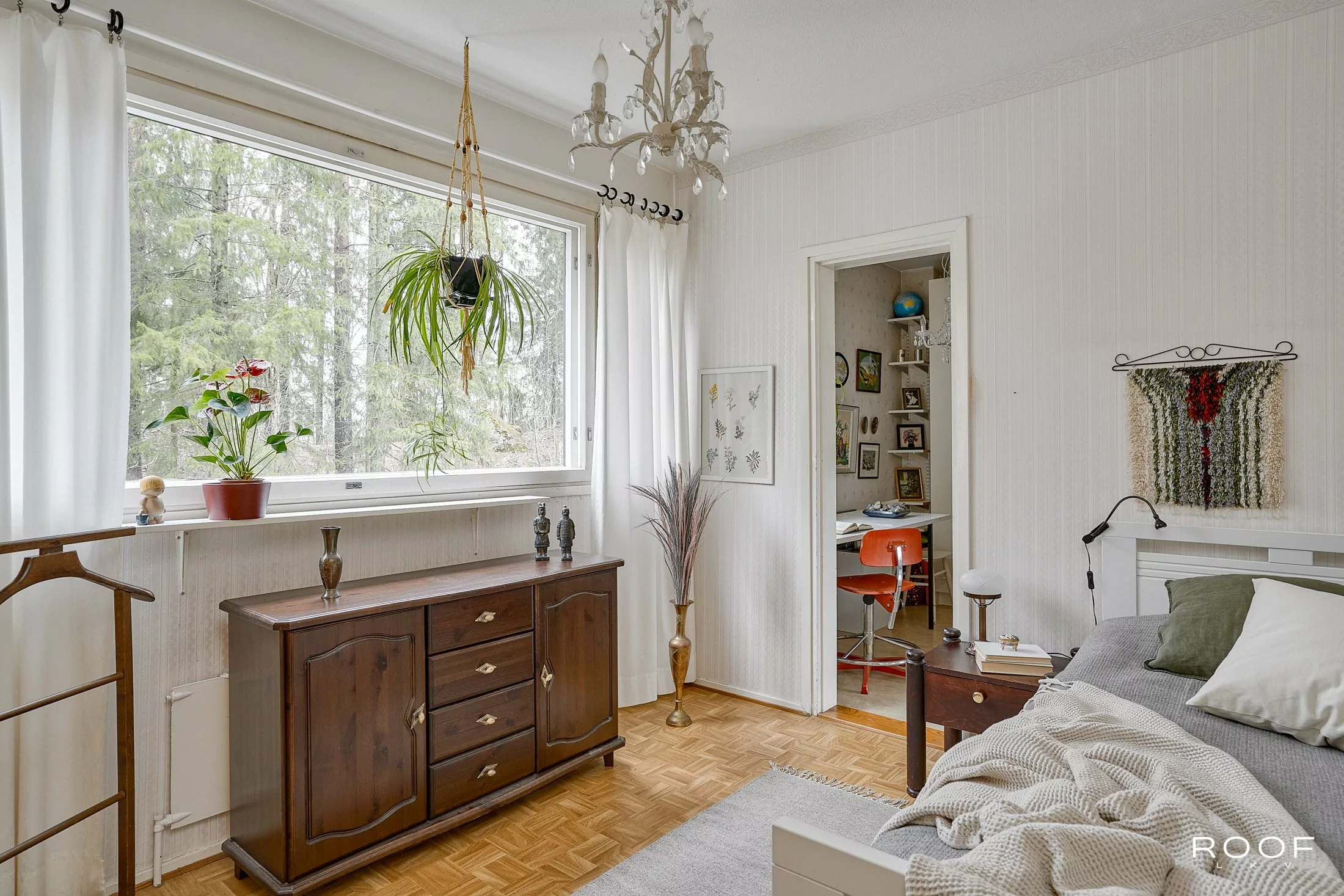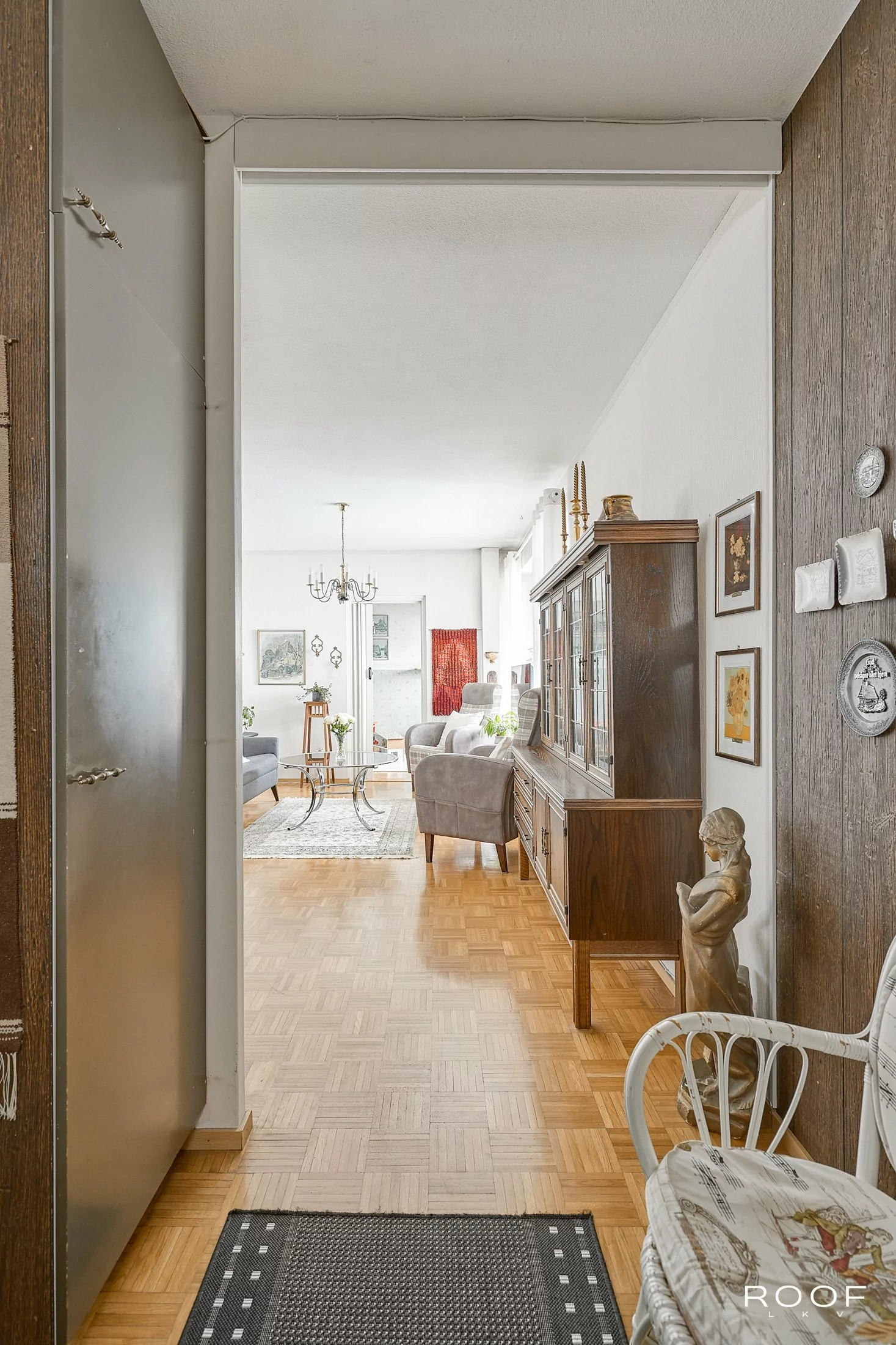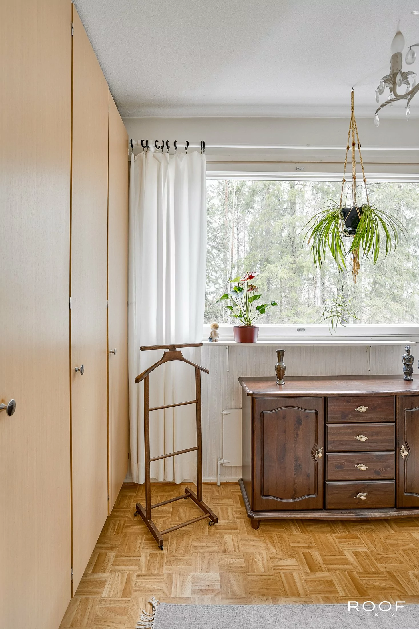 Talon neljännessä kerroksessa sijaitseva, läpi talon menevä huoneisto. Kaksi hyvän kokoista makuuhuonetta, joista on kulku huoneiden yhteiseen vaatehuoneeseen. Keittiön yhteydessä on erillinen ruokailutila ja kylpyhuoneessa on paikka pesukoneelle. Erillinen wc tuo toimivuutta arkeen.