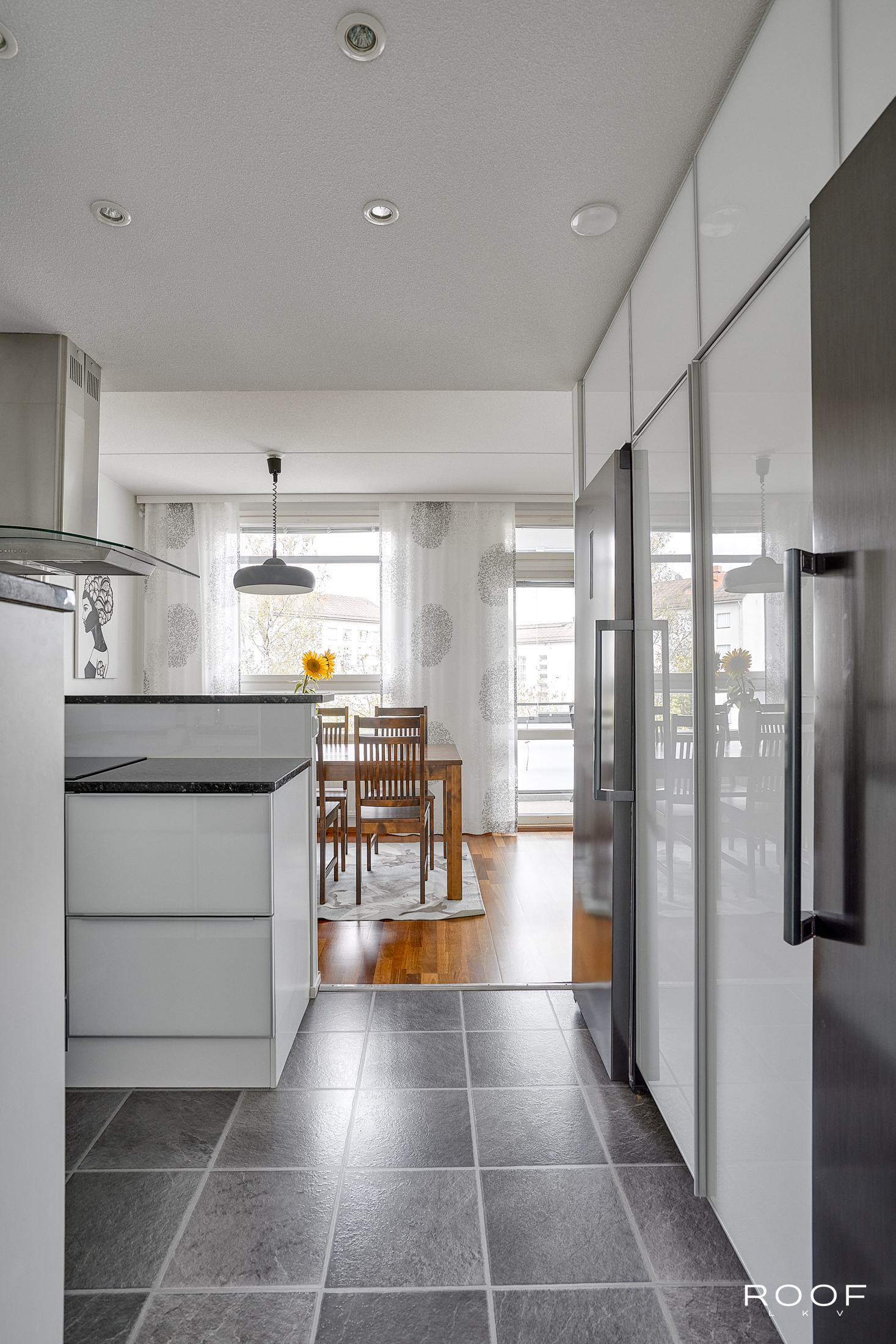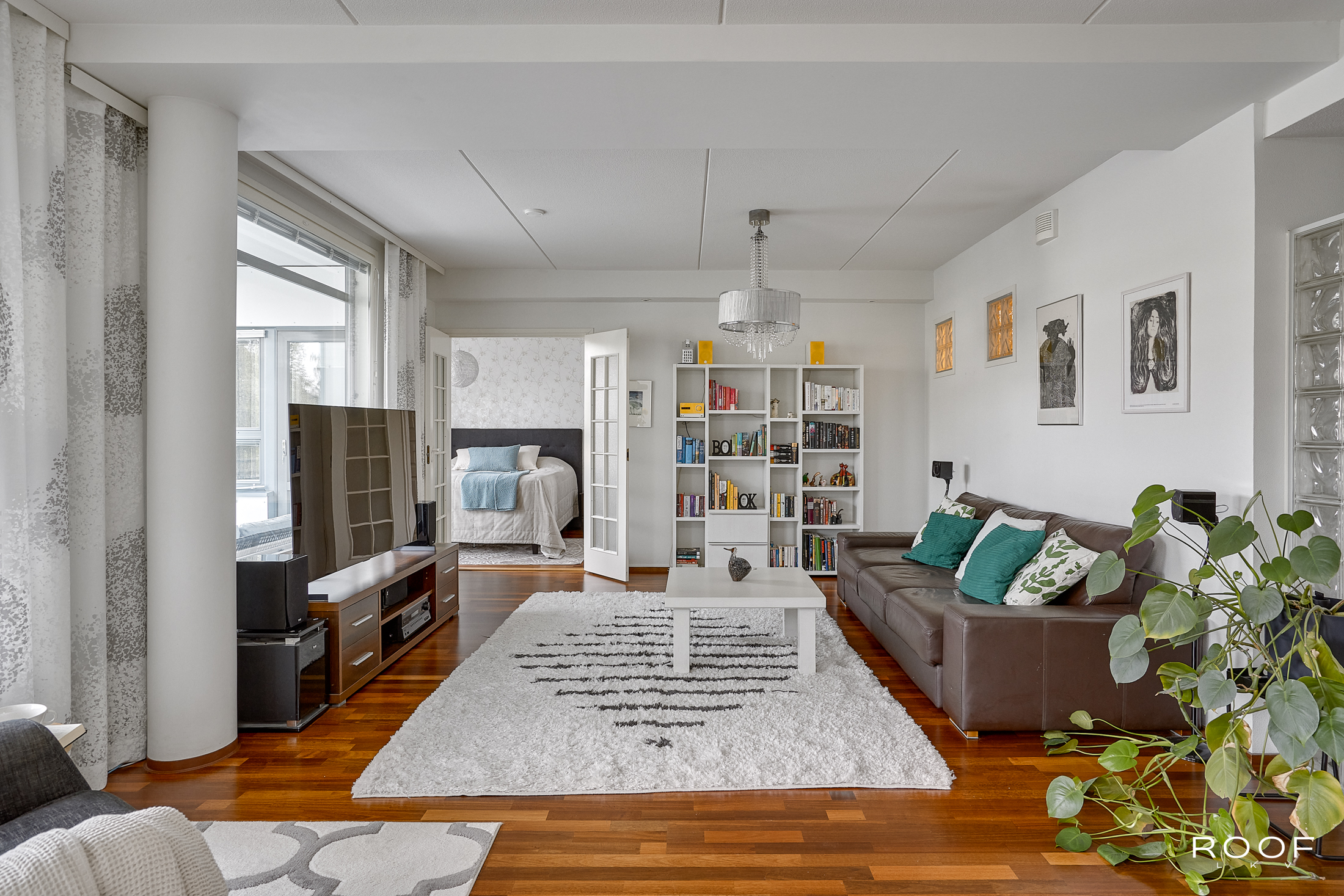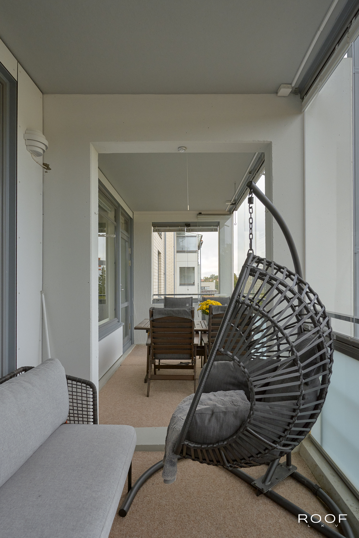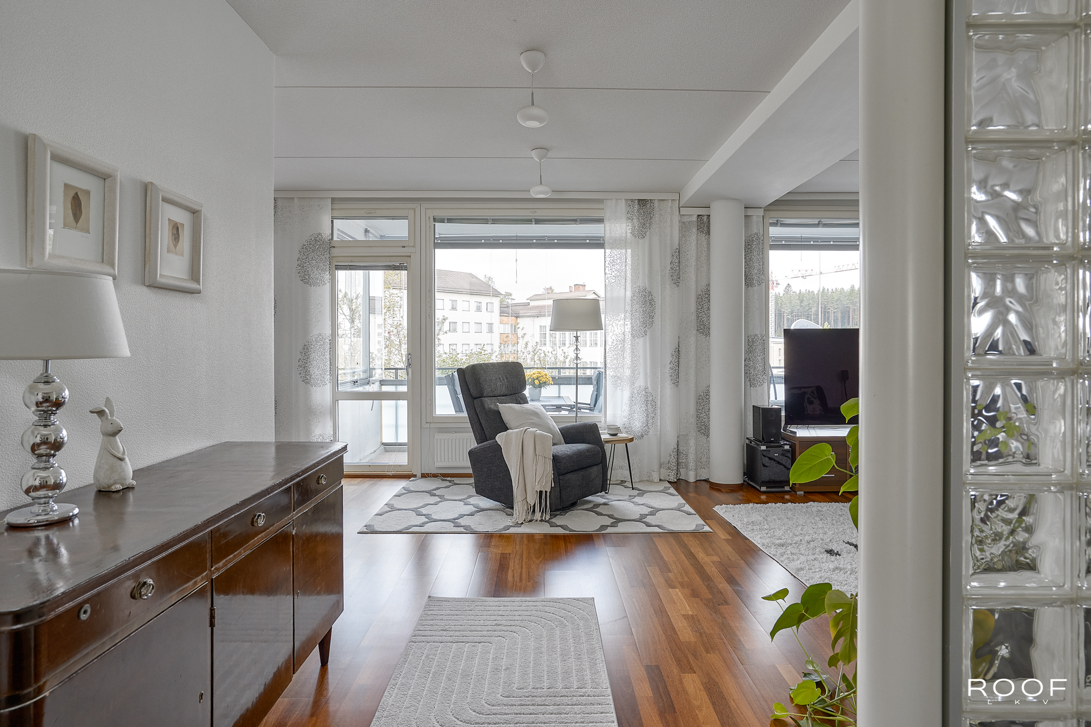 Neljännen kerroksen avara koti tarjoaa erinomaiset puitteet viihtyisään asumiseen. Asunnon sydän on suuri olohuone, joka yhdistyy ruokailutilan kautta tyylikkääseen keittiöön. Keittiössä laadukkaat kivitasot tuovat arkeen ripauksen ylellisyyttä. Kolme makuuhuonetta tarjoavat joustavuutta eri elämäntilanteisiin, ja päämakuuhuoneessa on oma wc. Käytännöllinen kodinhoitohuone helpottaa arjen sujuvuutta. Poikkeuksellisen suuri lasitettu parveke kutsuu rentoutumaan – sinne on käynti sekä olohuoneesta että päämakuuhuoneesta.