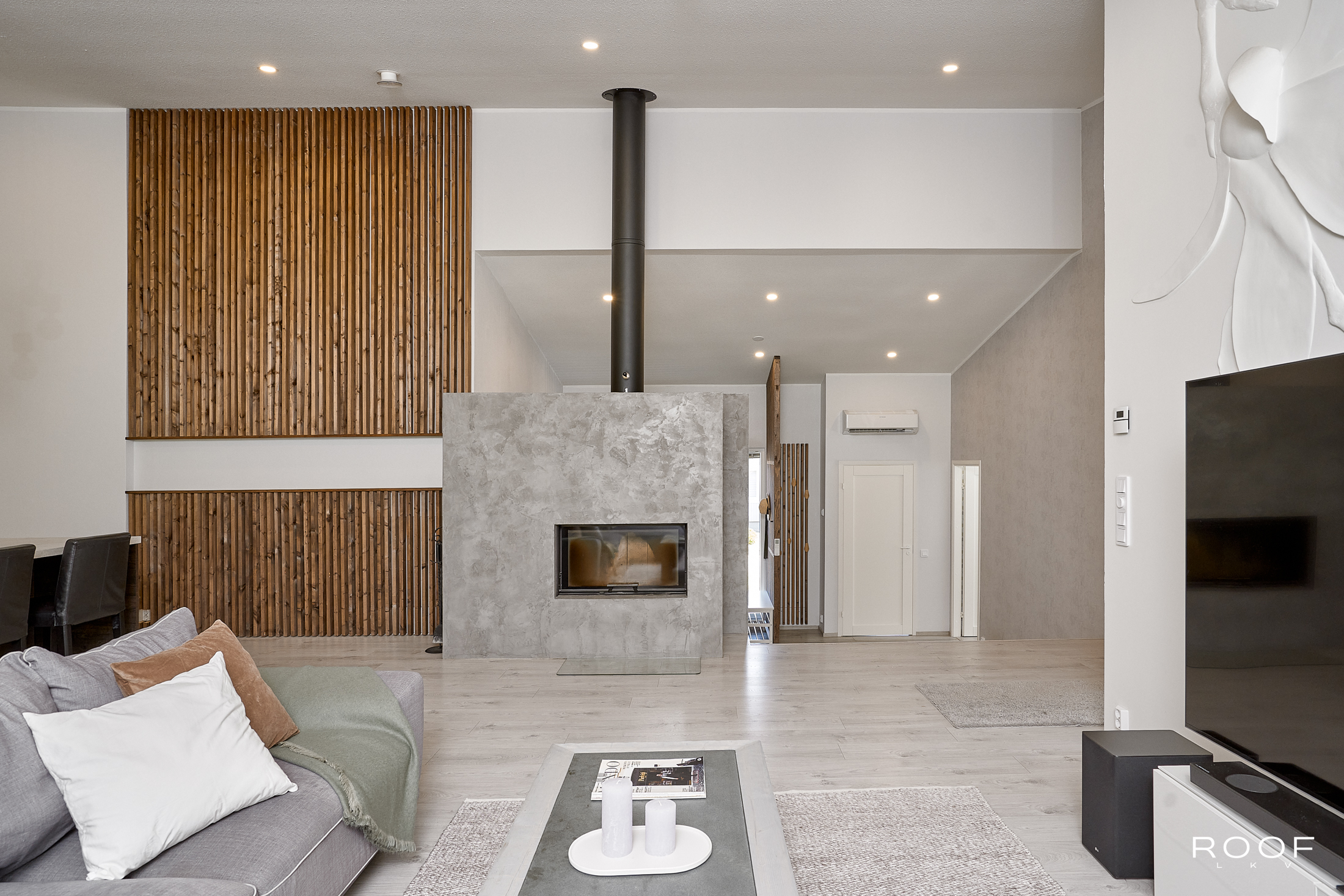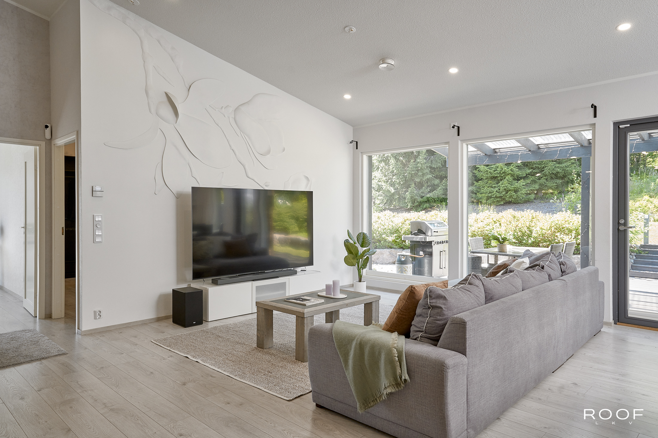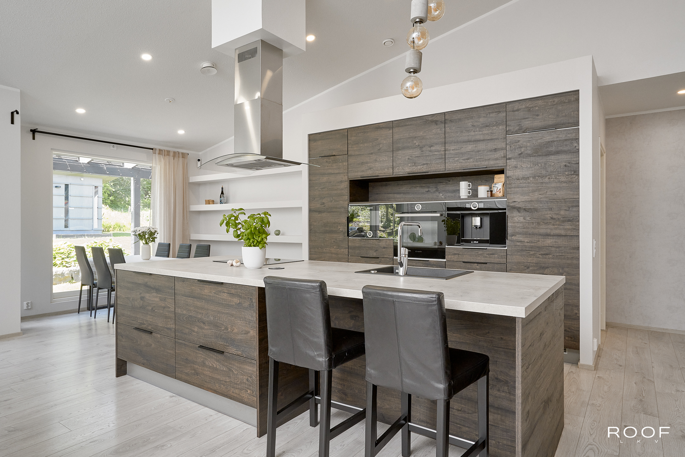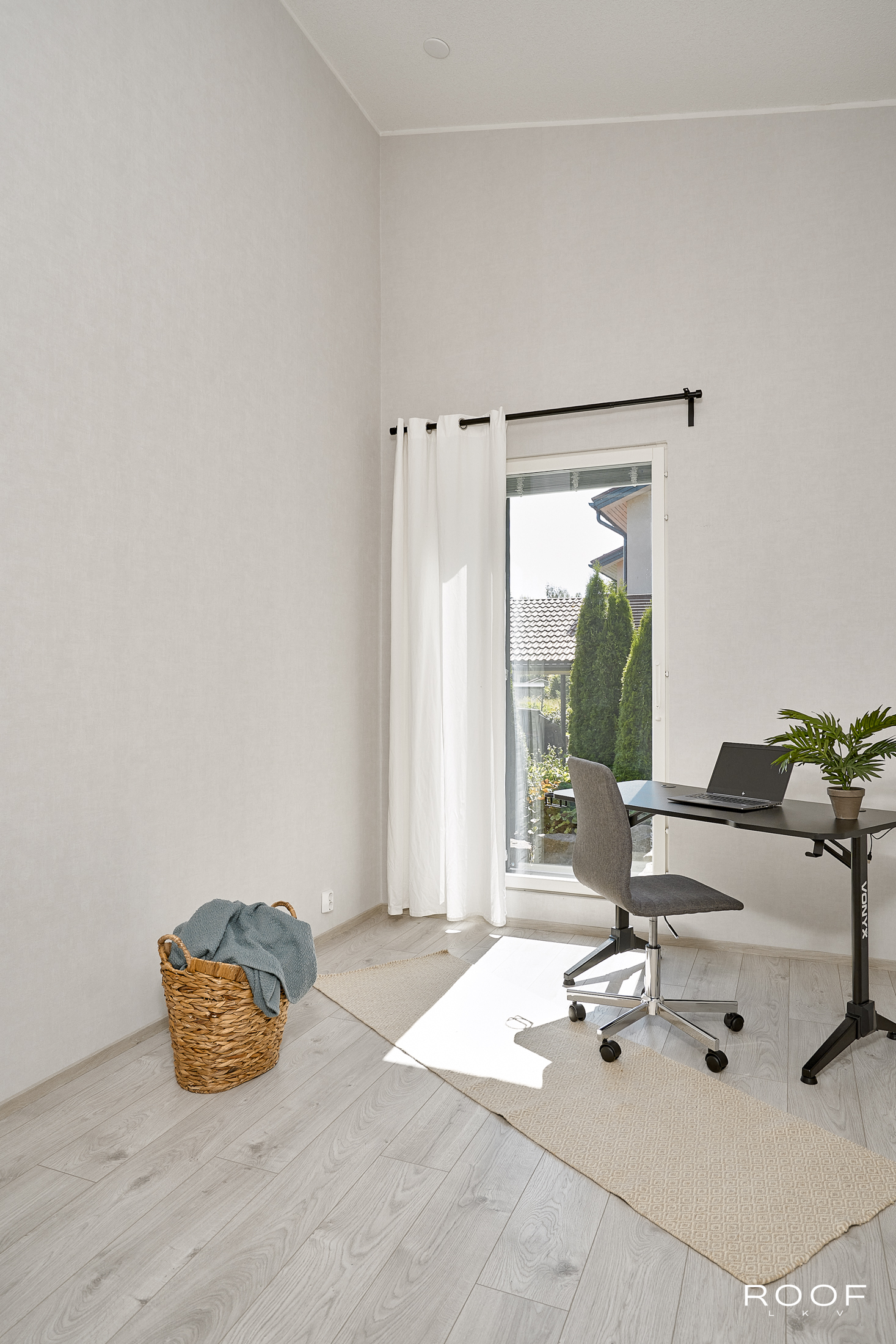 Avara olohuone ja keittiö muodostavat yhtenäisen, modernin kokonaisuuden. Suuret ikkunat tuovat runsaasti luonnonvaloa, ja tilasta avautuu näkymä suojaisalle pihalle. Keittiössä on laadukkaat kodinkoneet, tyylikkäät tummat kaapistot ja käytännöllinen saareke. Olohuoneen tyylikäs takka tuo lämpöä ja tunnelmaa. Päämakuuhuoneen yhteydessä on pukeutumistila, joka tarjoaa runsaasti säilytystilaa. Kaksi kylpyhuonetta ja toimiva kodinhoitohuone helpottavat arkea ja lisäävät asumismukavuutta.