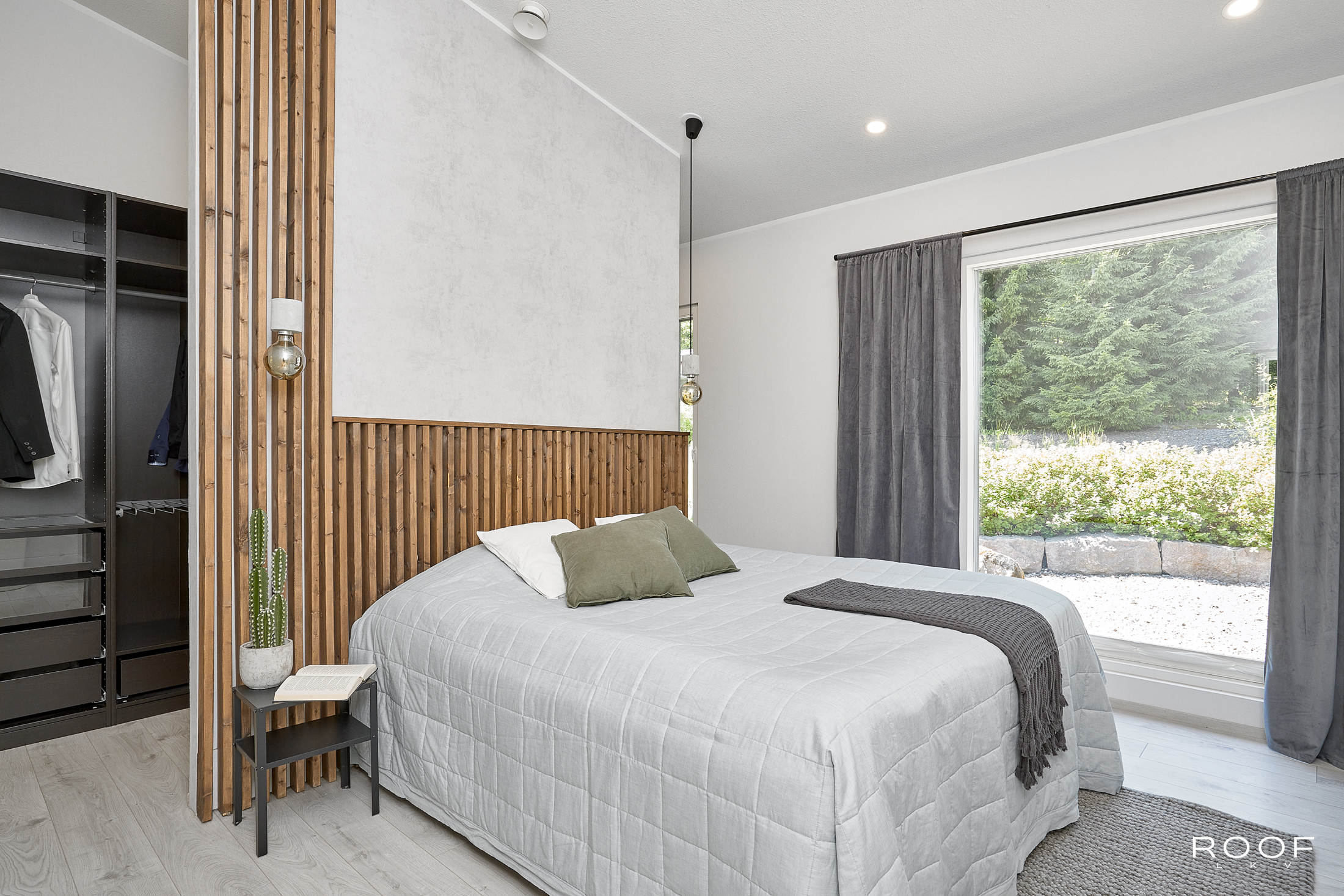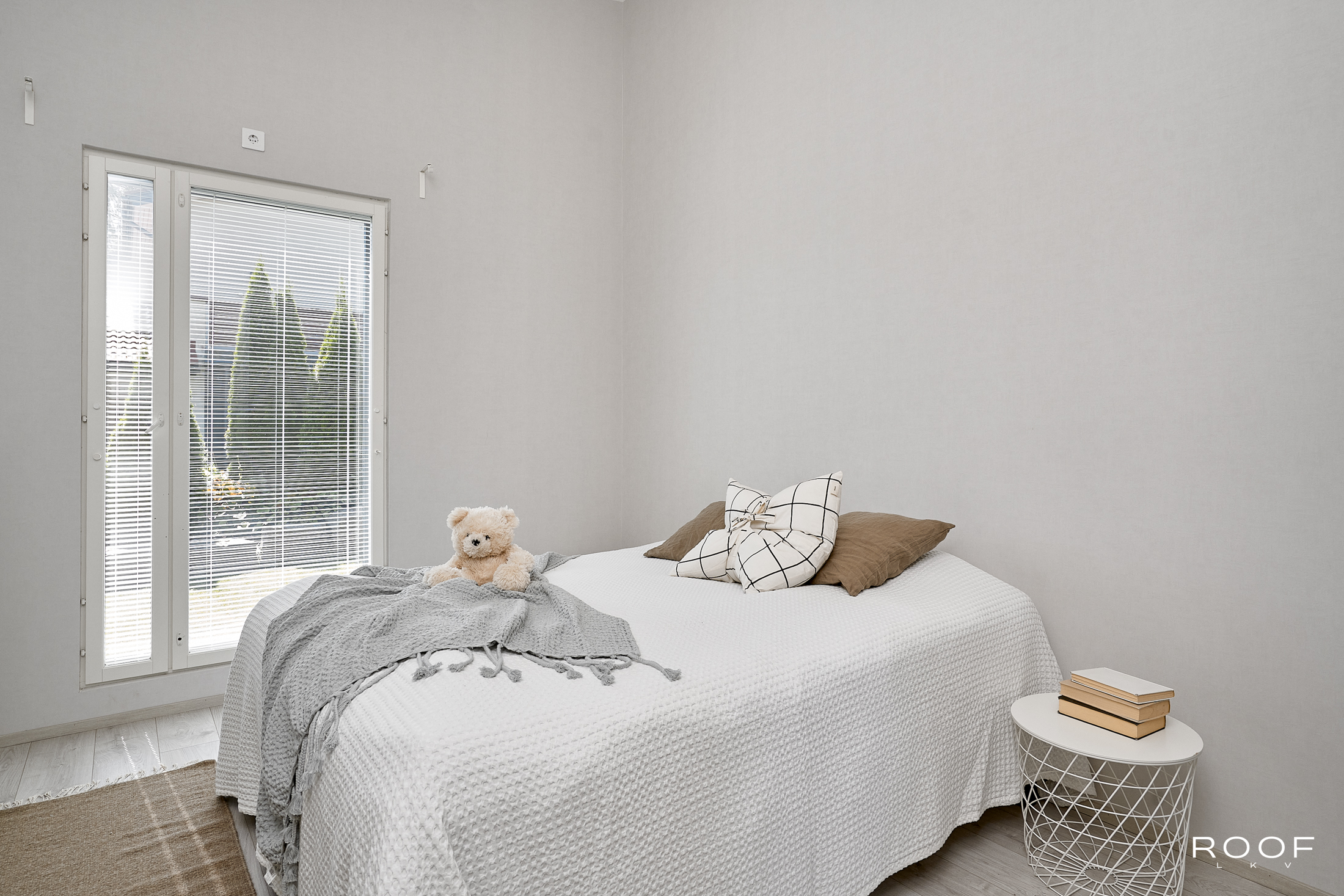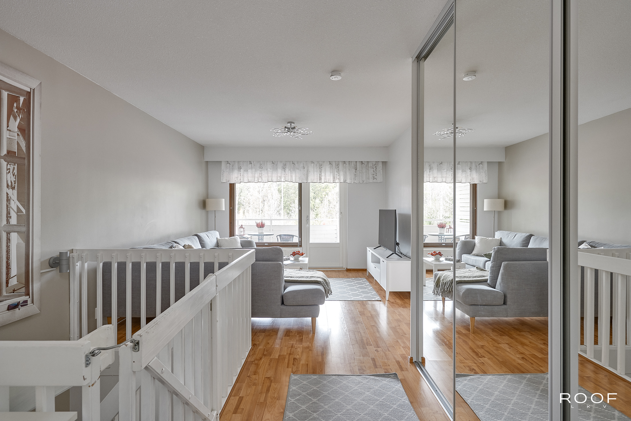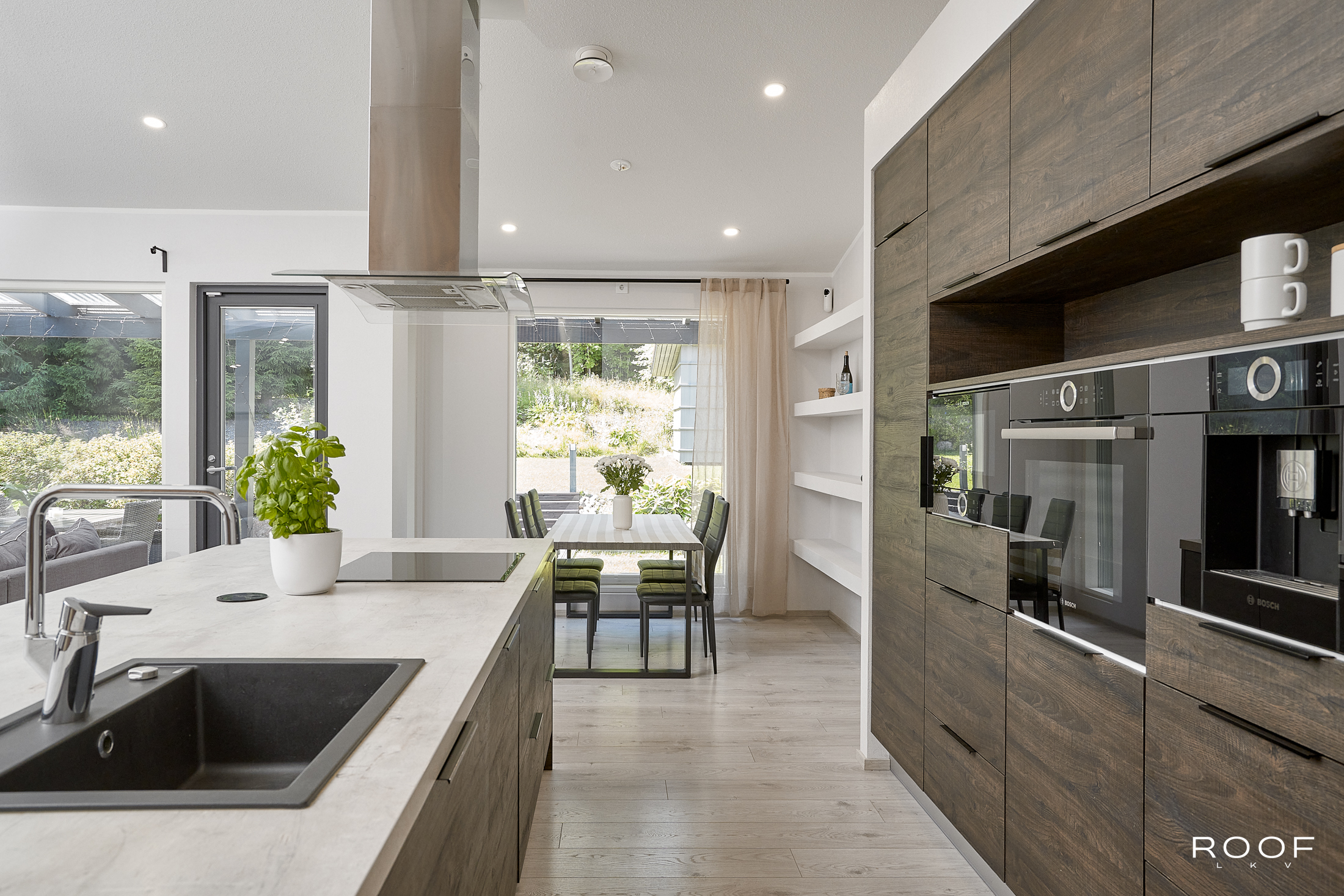 Avara olohuone ja keittiö muodostavat yhtenäisen, modernin kokonaisuuden. Suuret ikkunat tuovat runsaasti luonnonvaloa, ja tilasta avautuu näkymä suojaisalle pihalle. Keittiössä on laadukkaat kodinkoneet, tyylikkäät tummat kaapistot ja käytännöllinen saareke. Olohuoneen tyylikäs takka tuo lämpöä ja tunnelmaa. Päämakuuhuoneen yhteydessä on pukeutumistila, joka tarjoaa runsaasti säilytystilaa. Kaksi kylpyhuonetta ja toimiva kodinhoitohuone helpottavat arkea ja lisäävät asumismukavuutta.