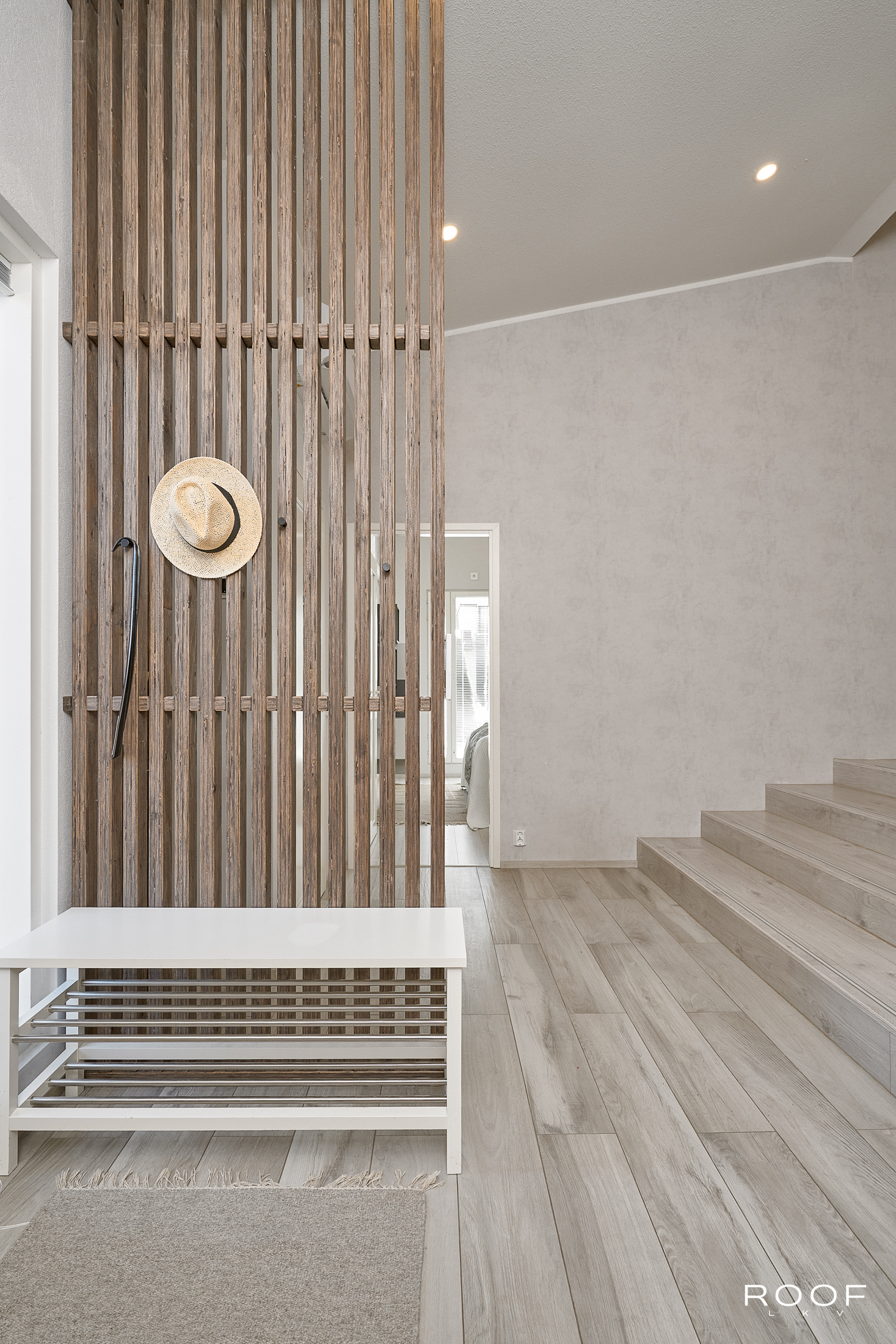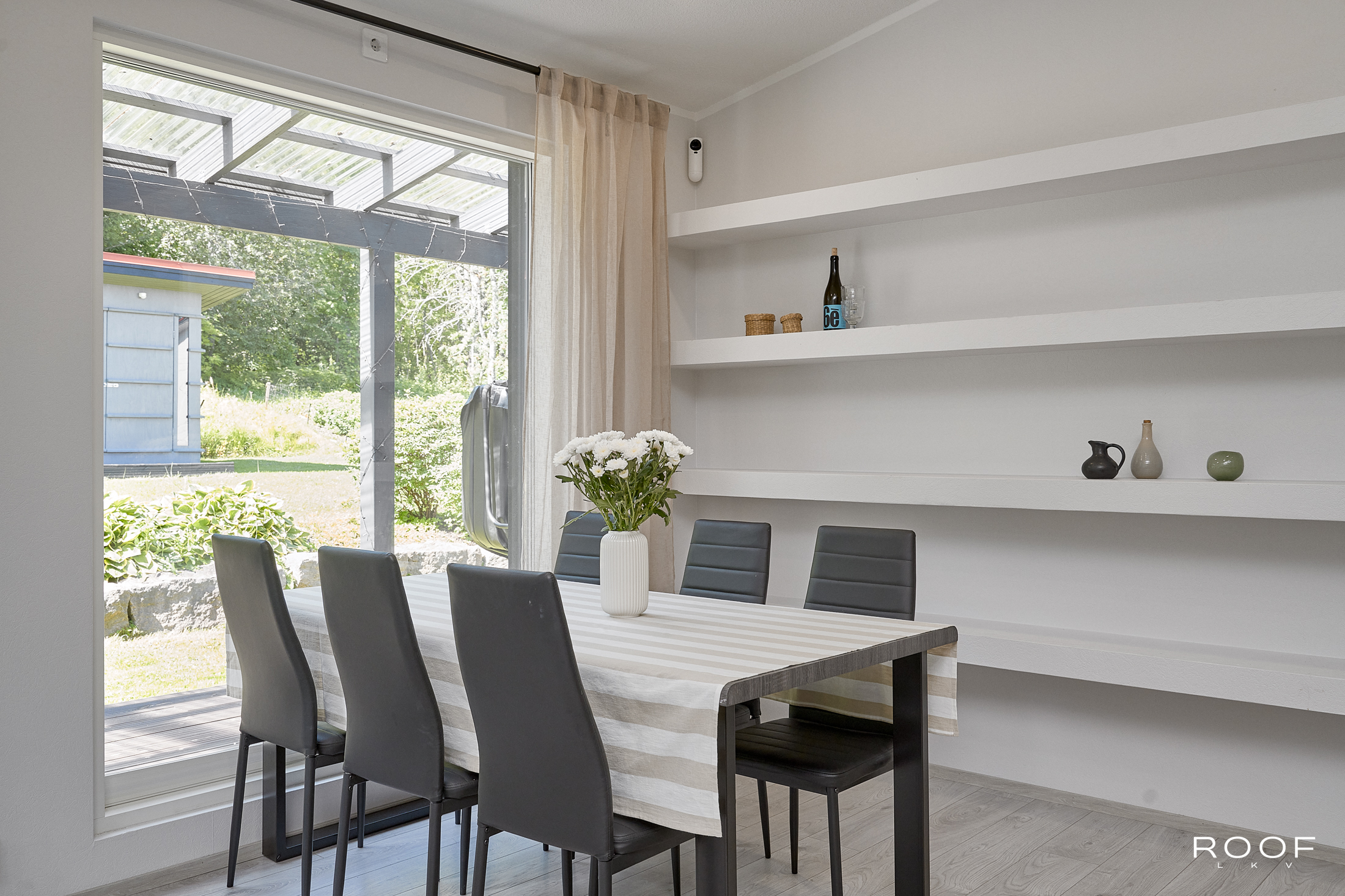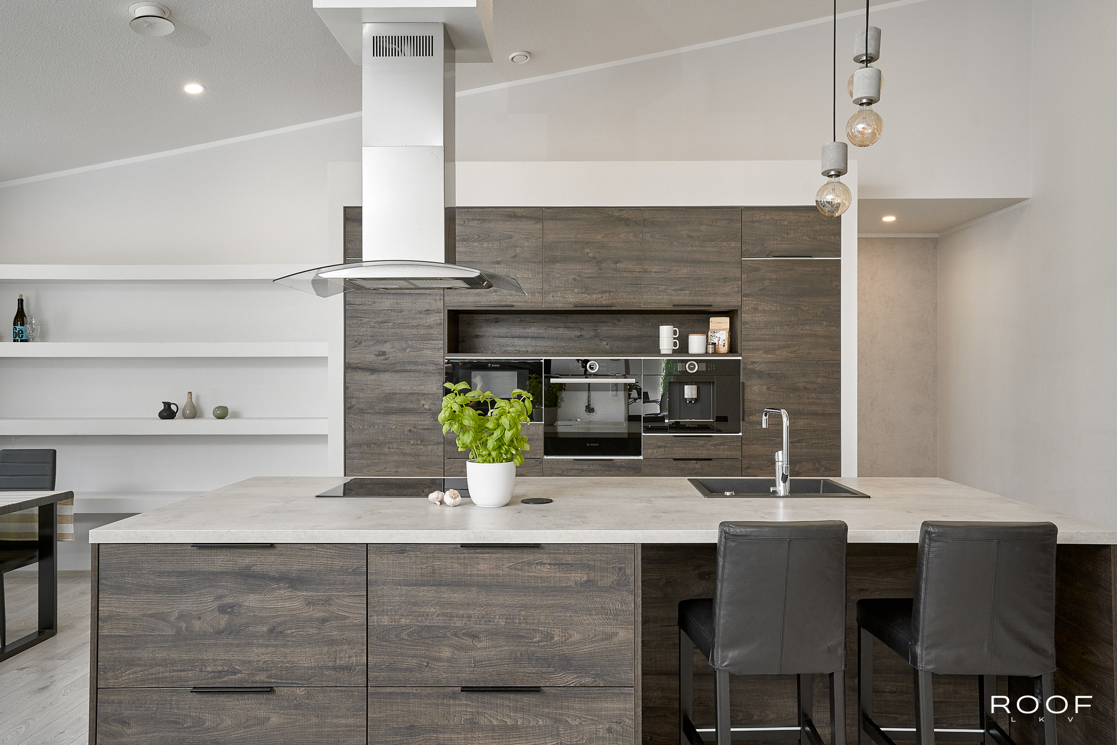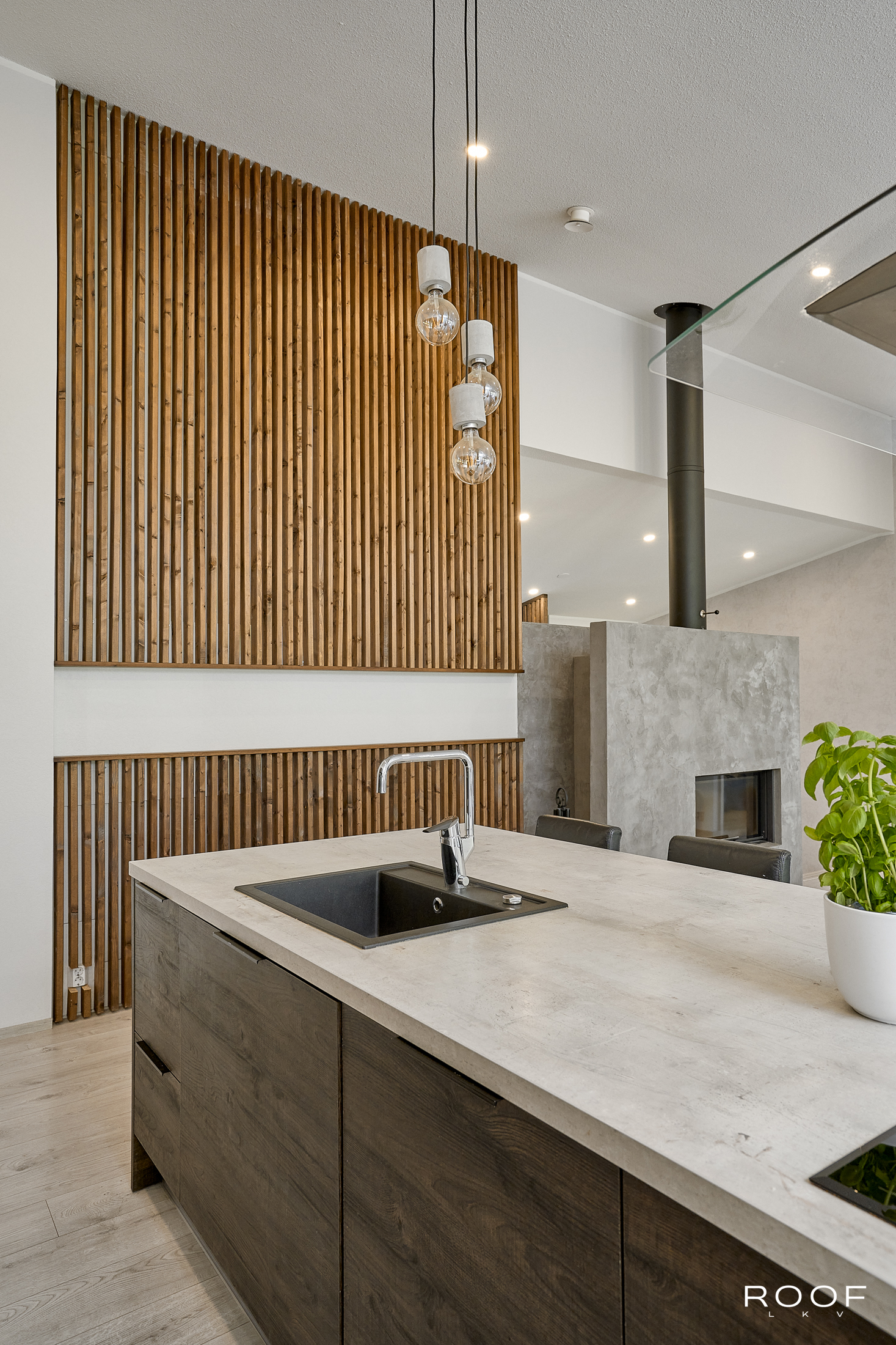 Avara olohuone ja keittiö muodostavat yhtenäisen, modernin kokonaisuuden. Suuret ikkunat tuovat runsaasti luonnonvaloa, ja tilasta avautuu näkymä suojaisalle pihalle. Keittiössä on laadukkaat kodinkoneet, tyylikkäät tummat kaapistot ja käytännöllinen saareke. Olohuoneen tyylikäs takka tuo lämpöä ja tunnelmaa. Päämakuuhuoneen yhteydessä on pukeutumistila, joka tarjoaa runsaasti säilytystilaa. Kaksi kylpyhuonetta ja toimiva kodinhoitohuone helpottavat arkea ja lisäävät asumismukavuutta.