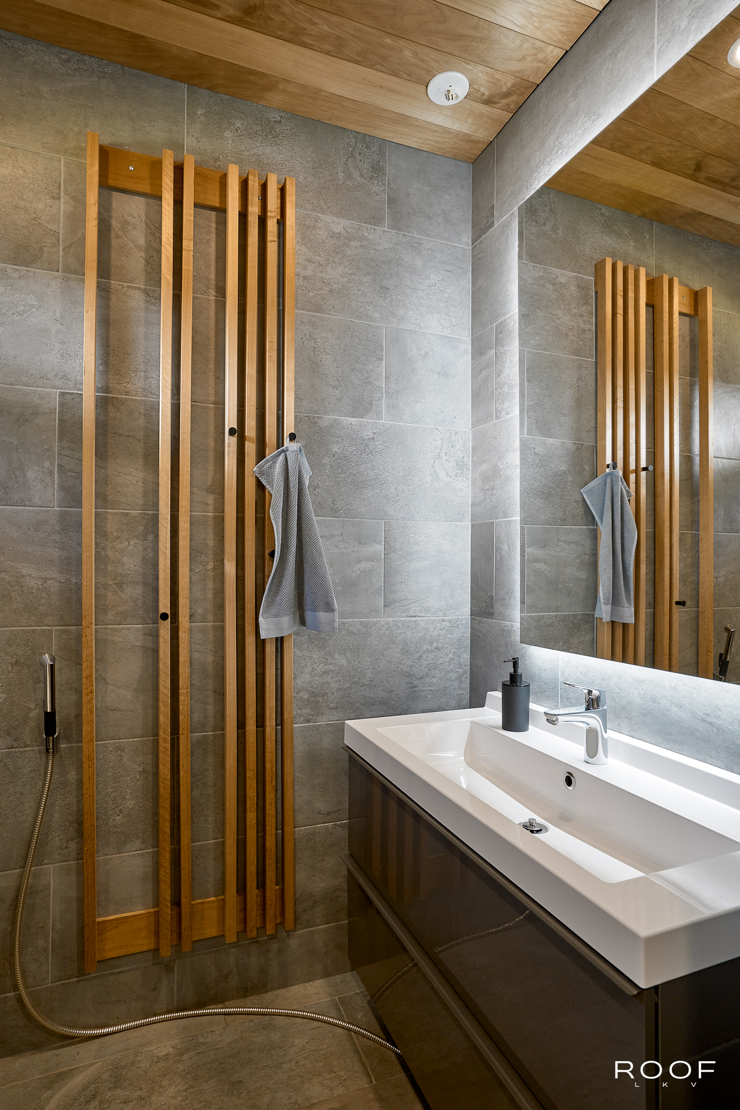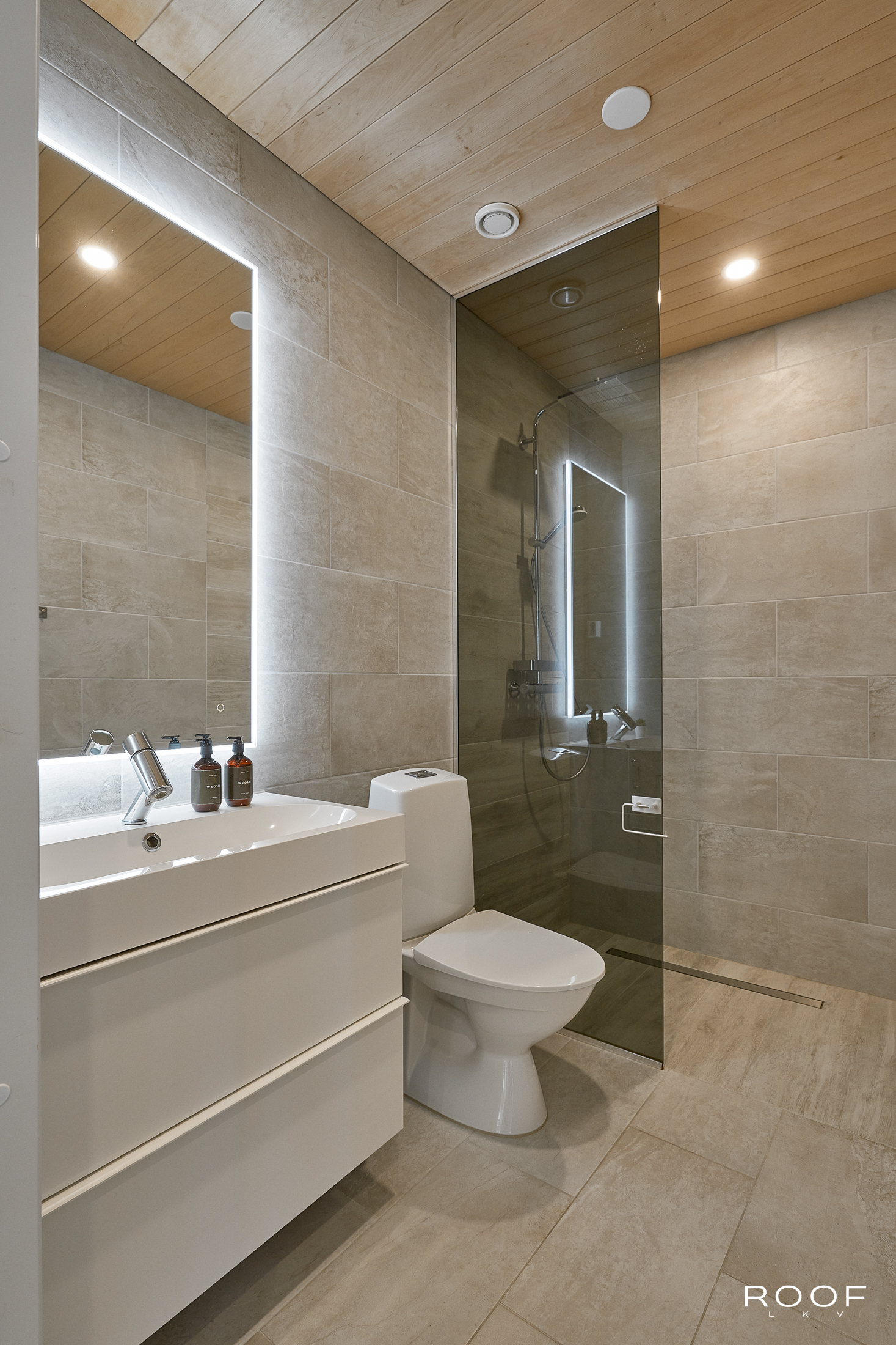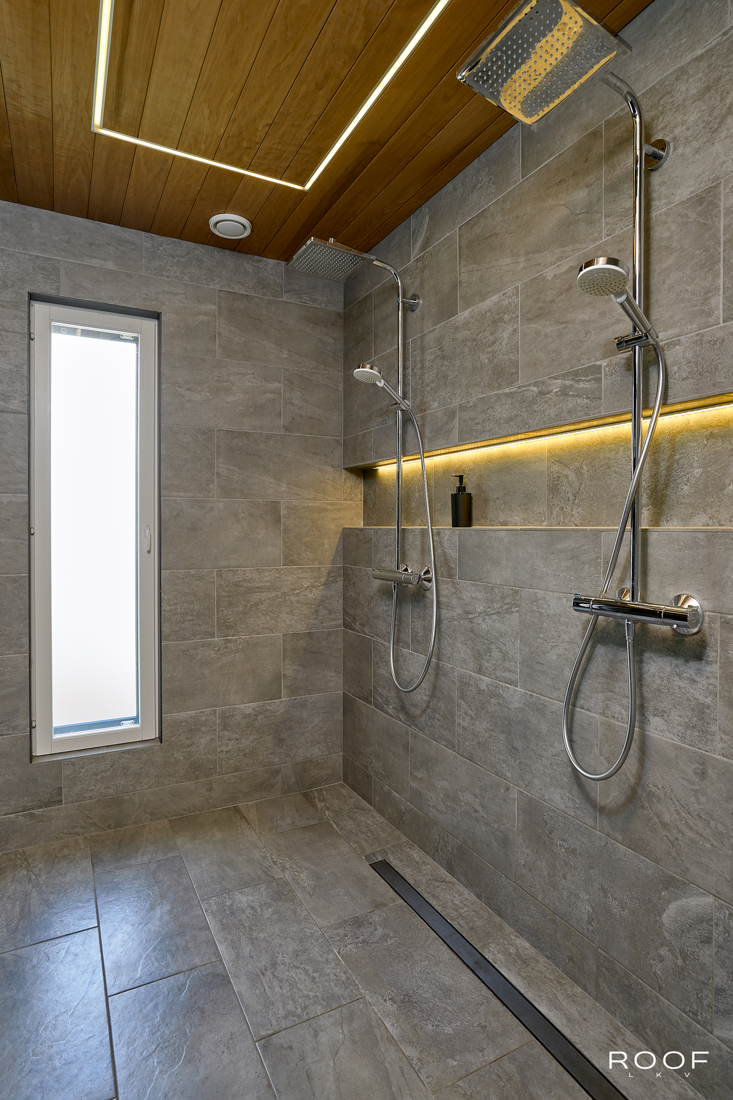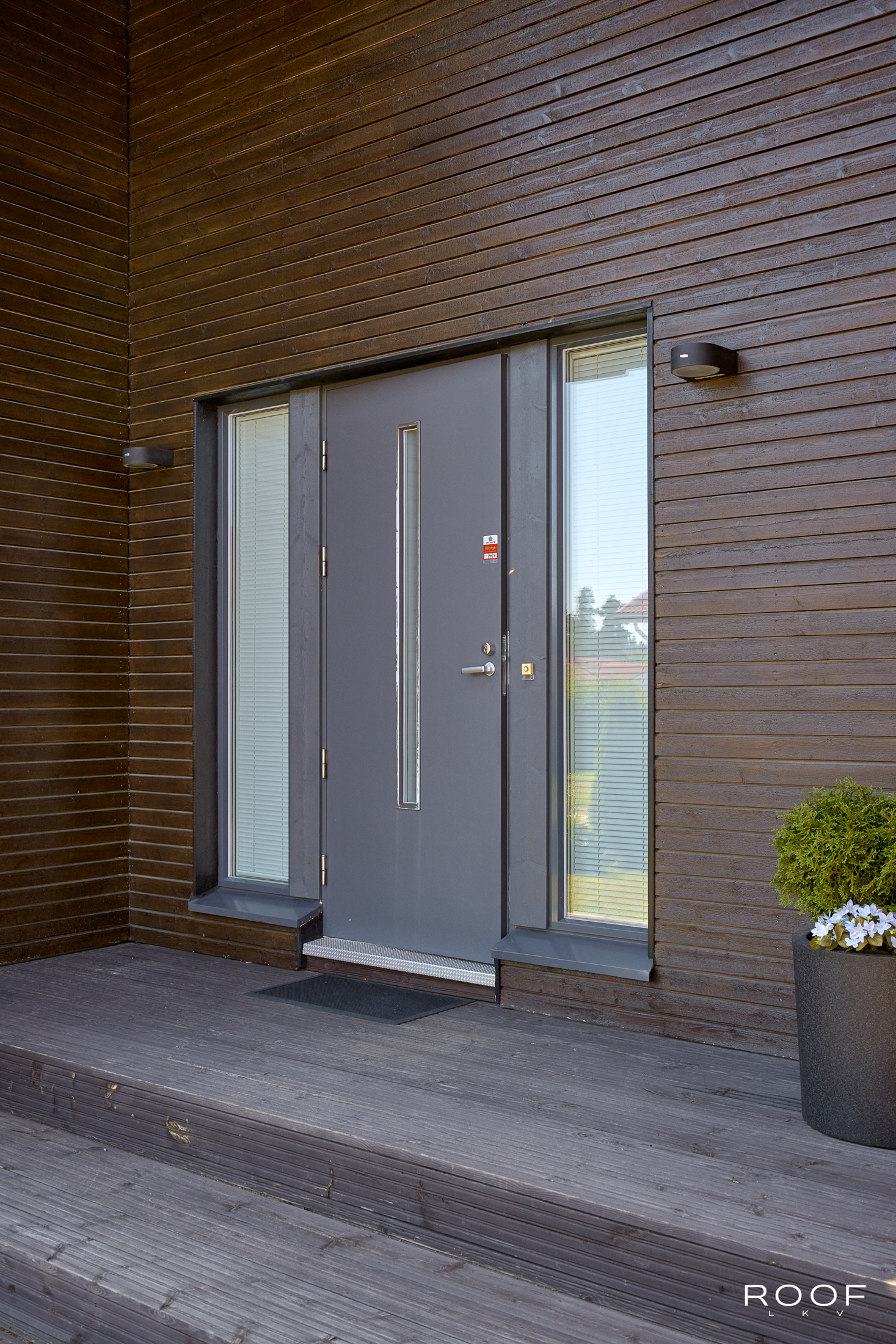 Avara olohuone ja keittiö muodostavat yhtenäisen, modernin kokonaisuuden. Suuret ikkunat tuovat runsaasti luonnonvaloa, ja tilasta avautuu näkymä suojaisalle pihalle. Keittiössä on laadukkaat kodinkoneet, tyylikkäät tummat kaapistot ja käytännöllinen saareke. Olohuoneen tyylikäs takka tuo lämpöä ja tunnelmaa. Päämakuuhuoneen yhteydessä on pukeutumistila, joka tarjoaa runsaasti säilytystilaa. Kaksi kylpyhuonetta ja toimiva kodinhoitohuone helpottavat arkea ja lisäävät asumismukavuutta.