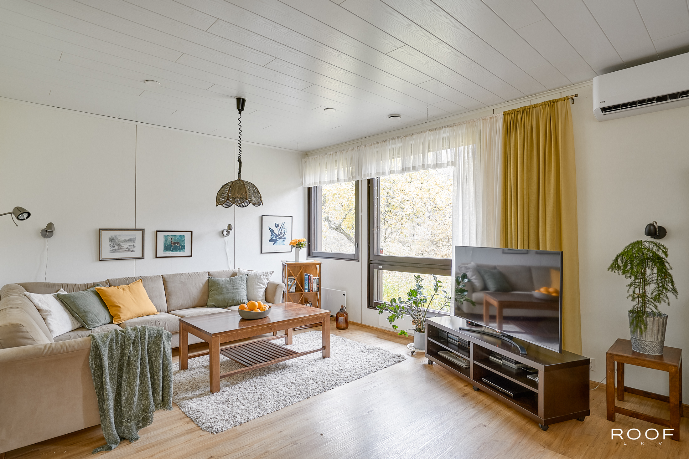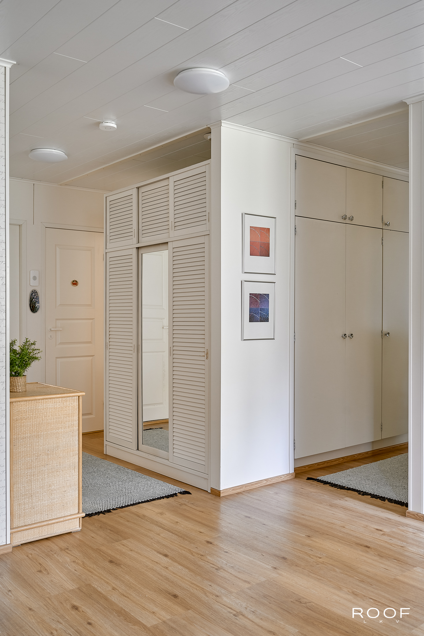 uusittu olohuoneen, eteisen ja kolmen huoneen sisäkatot