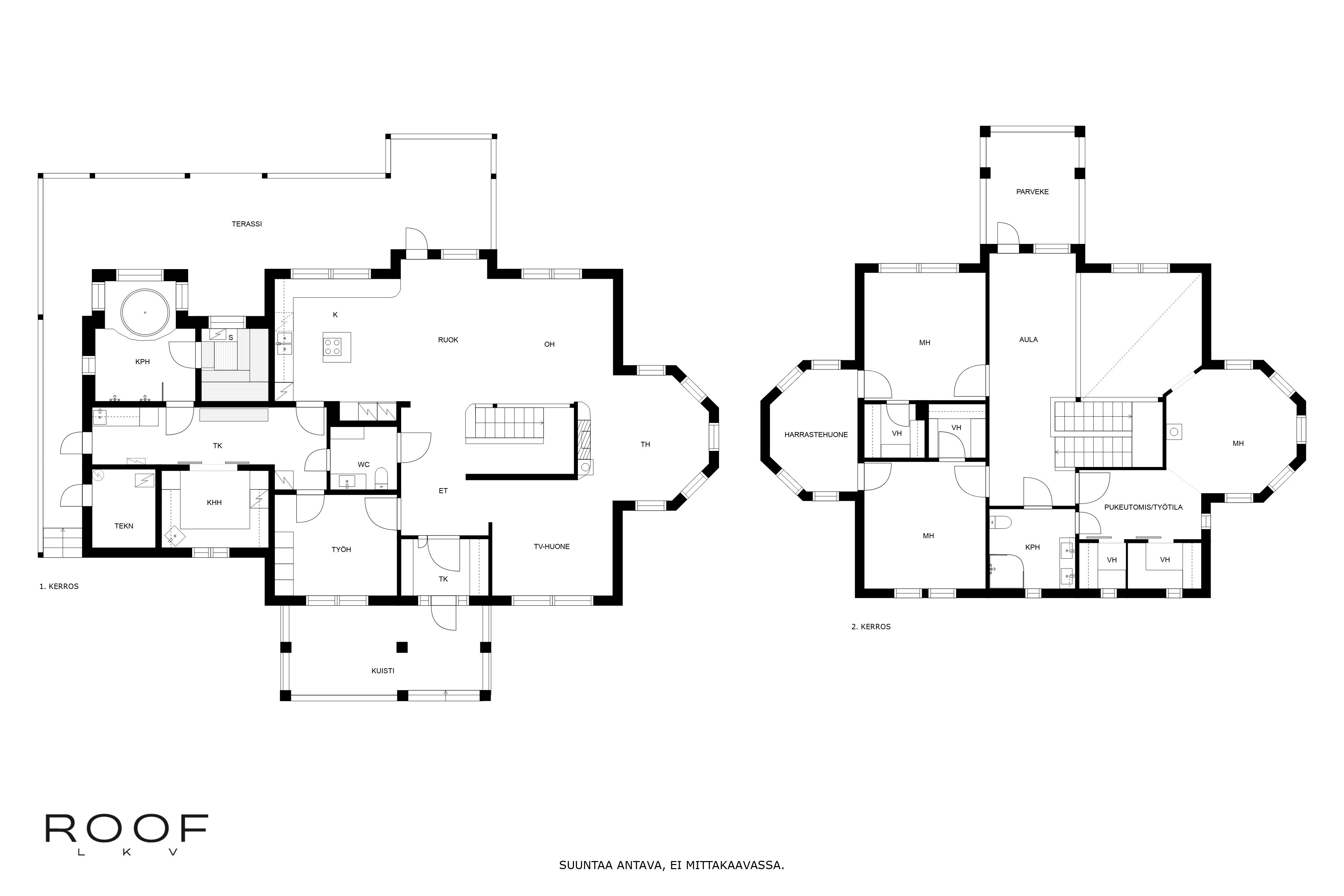 omakotitalo, mh*4, k, rt, oh*2, tkh, harrasteh, kph, s, khh, wc*2