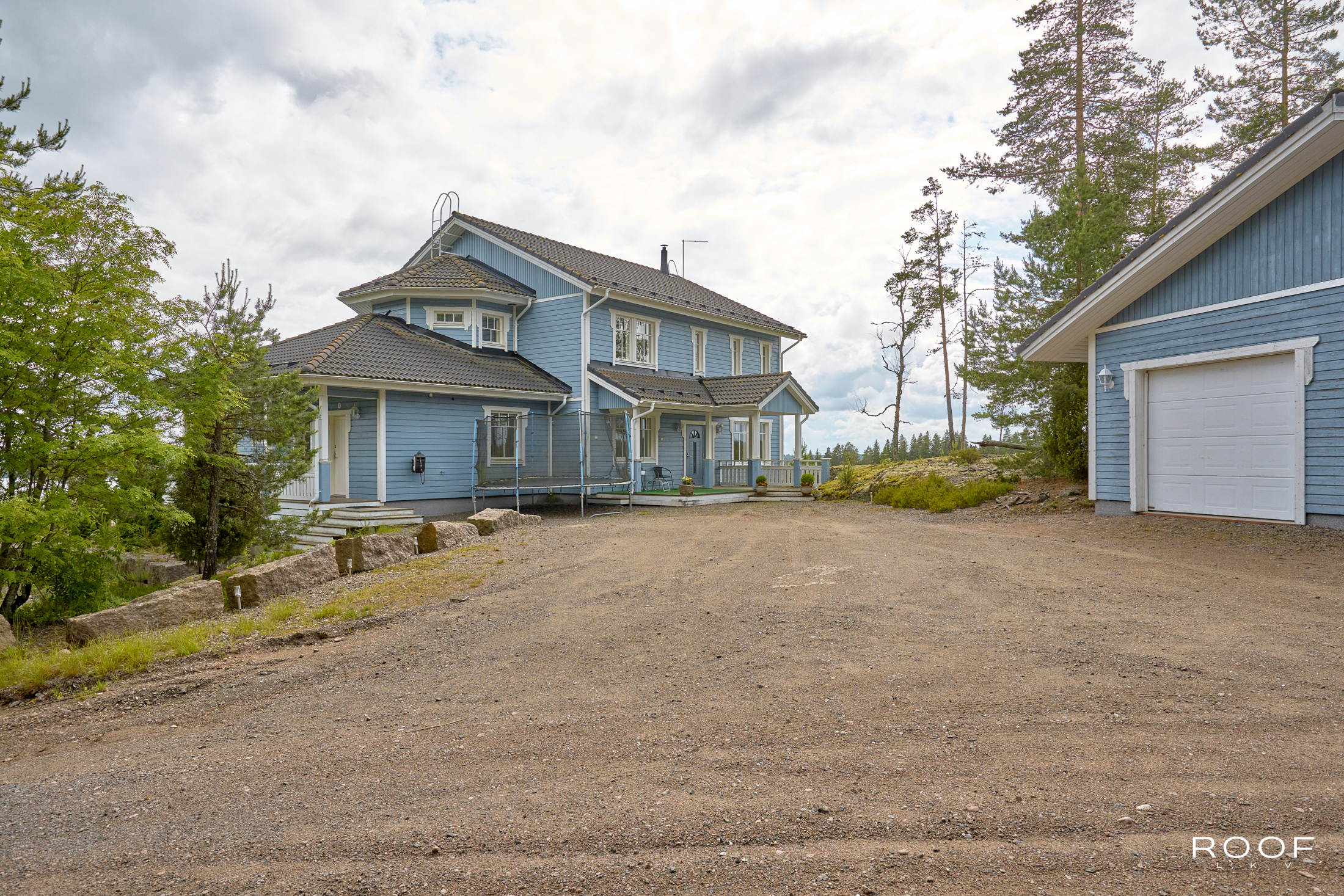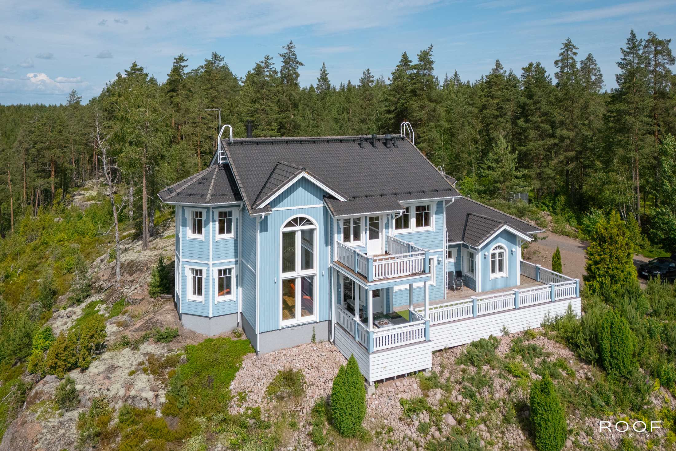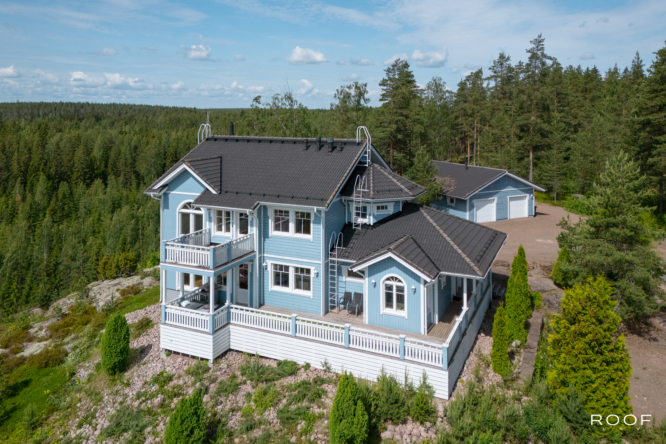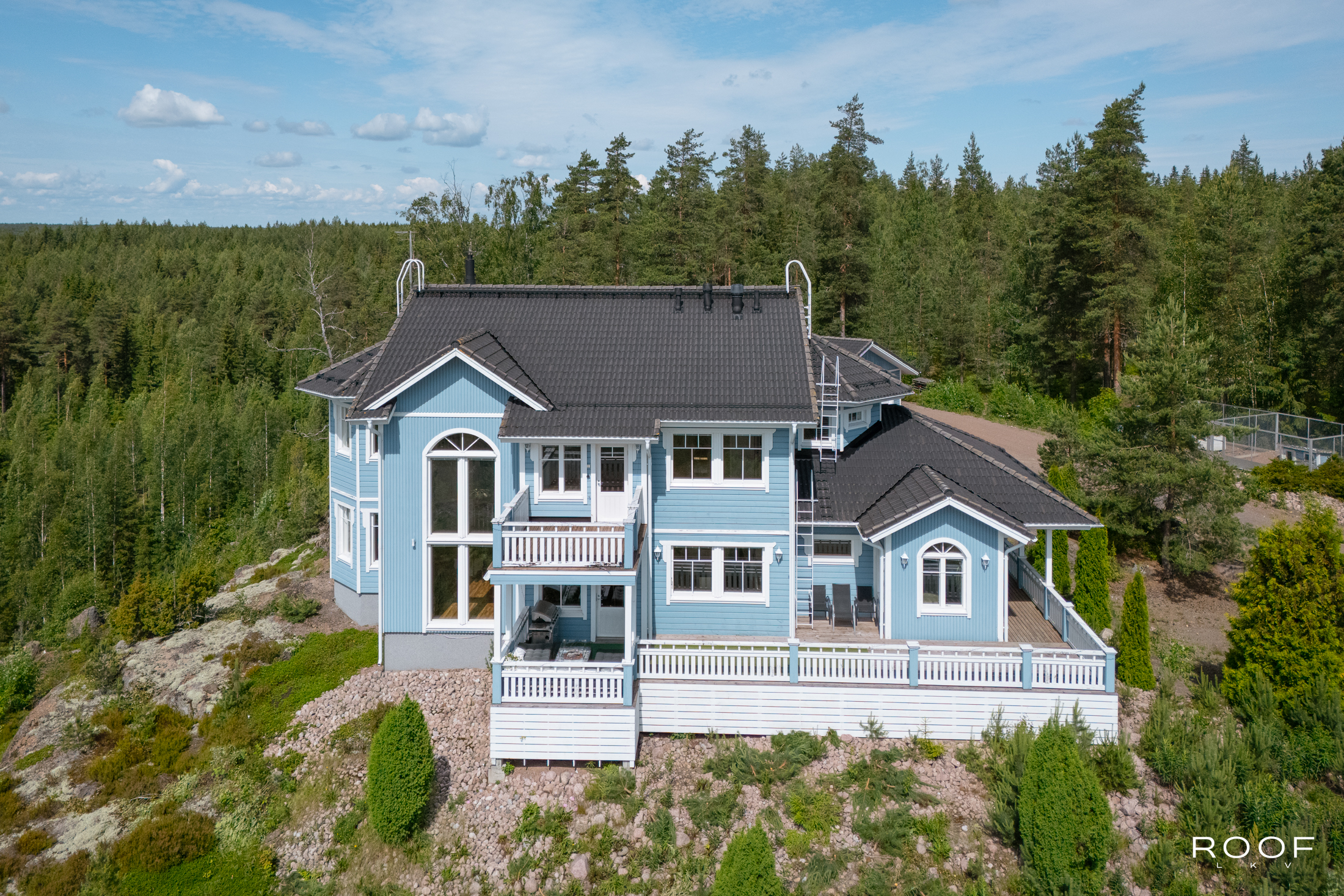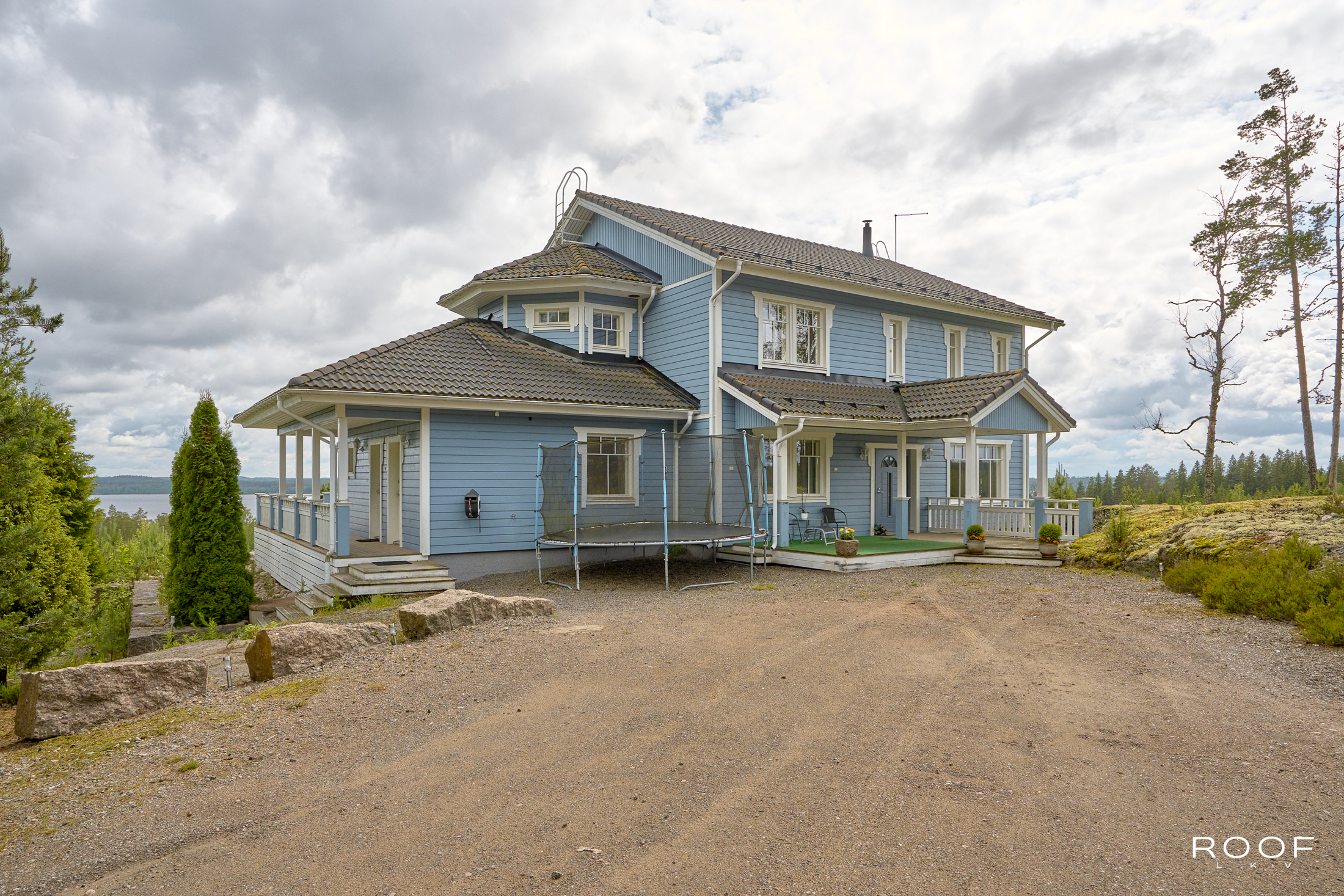 Ainutlaatuinen kokonaisuus korkealla, 50 metriä korkean kallion laella Herrala Talojen arkkitehdin suunnittelema linnamainen omakotitalo, josta avautuvat henkeäsalpaavat näkymät yli Valkealan järvien.