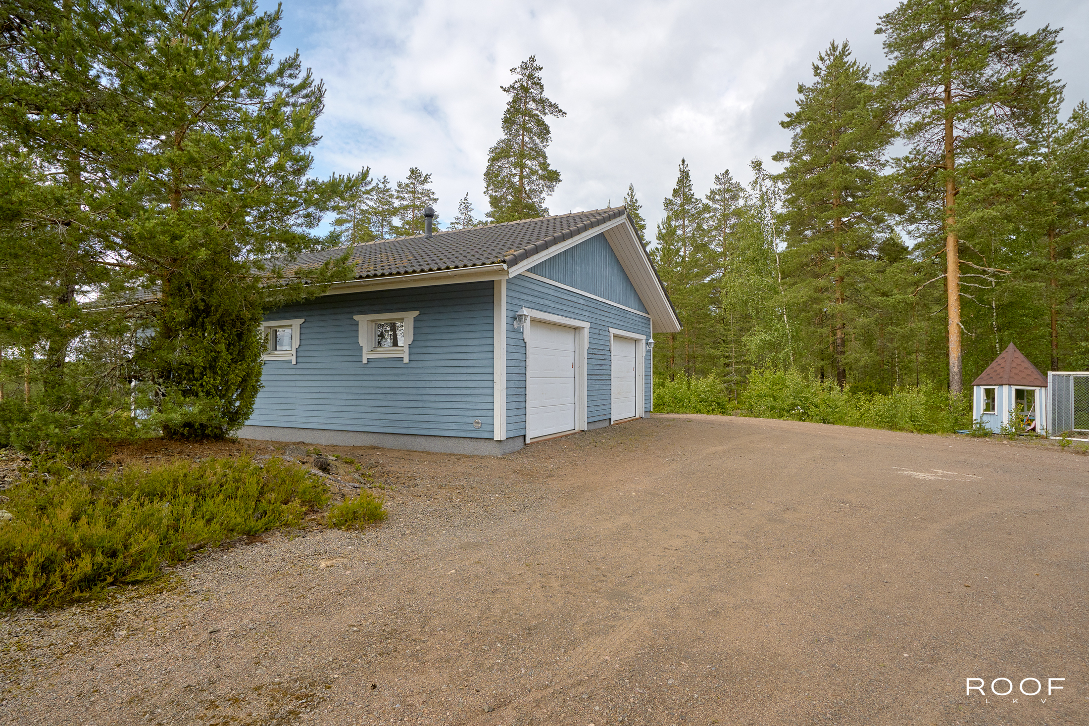 Pihapiiriin kuuluu erillinen rakennus, jossa on kaksi autotallia ja lämmin varasto. Helppohoitoinen piha sulautuu saumattomasti ympäröivään maisemaan – täällä ei tarvitse ruohonleikkuria!