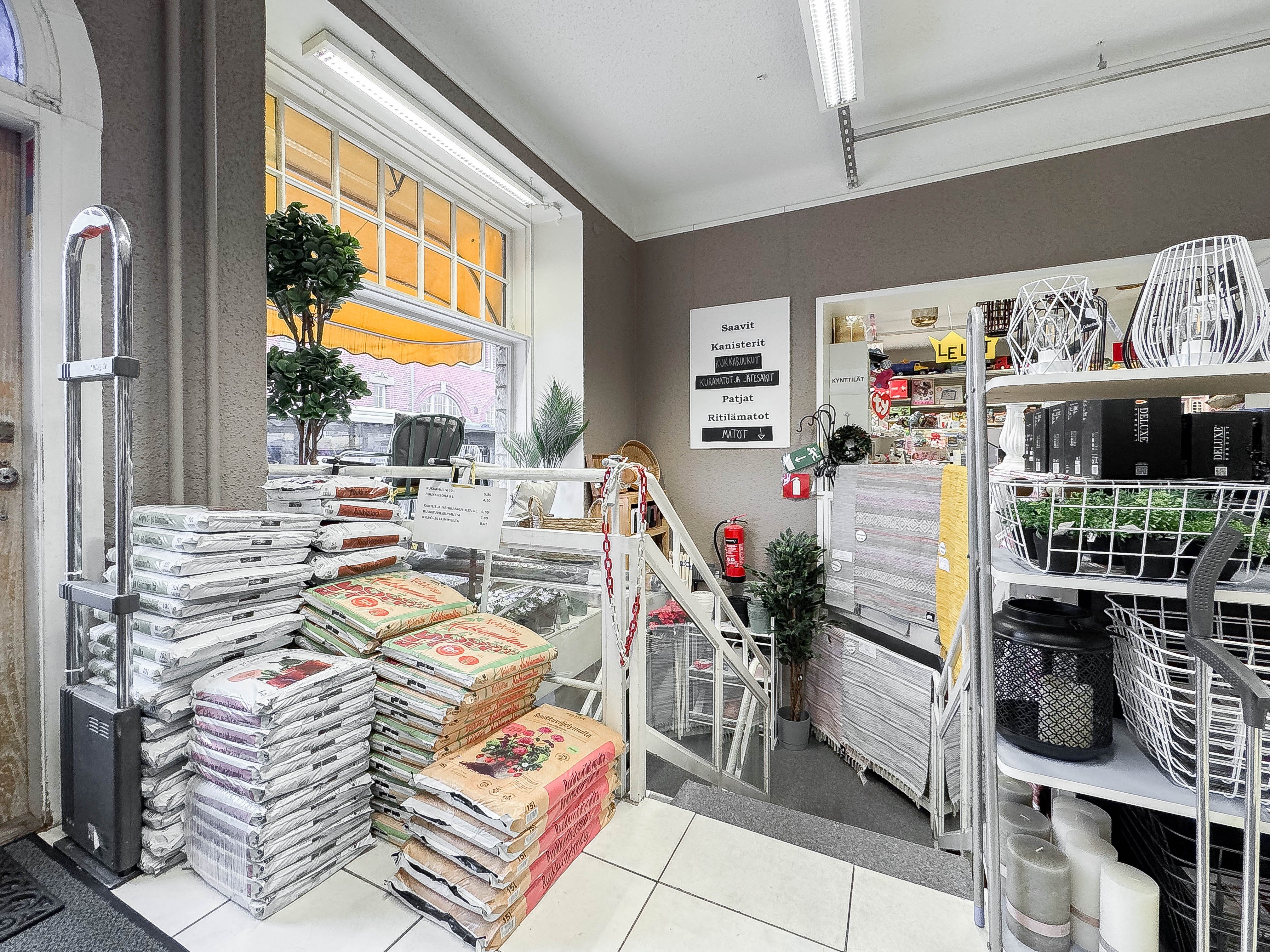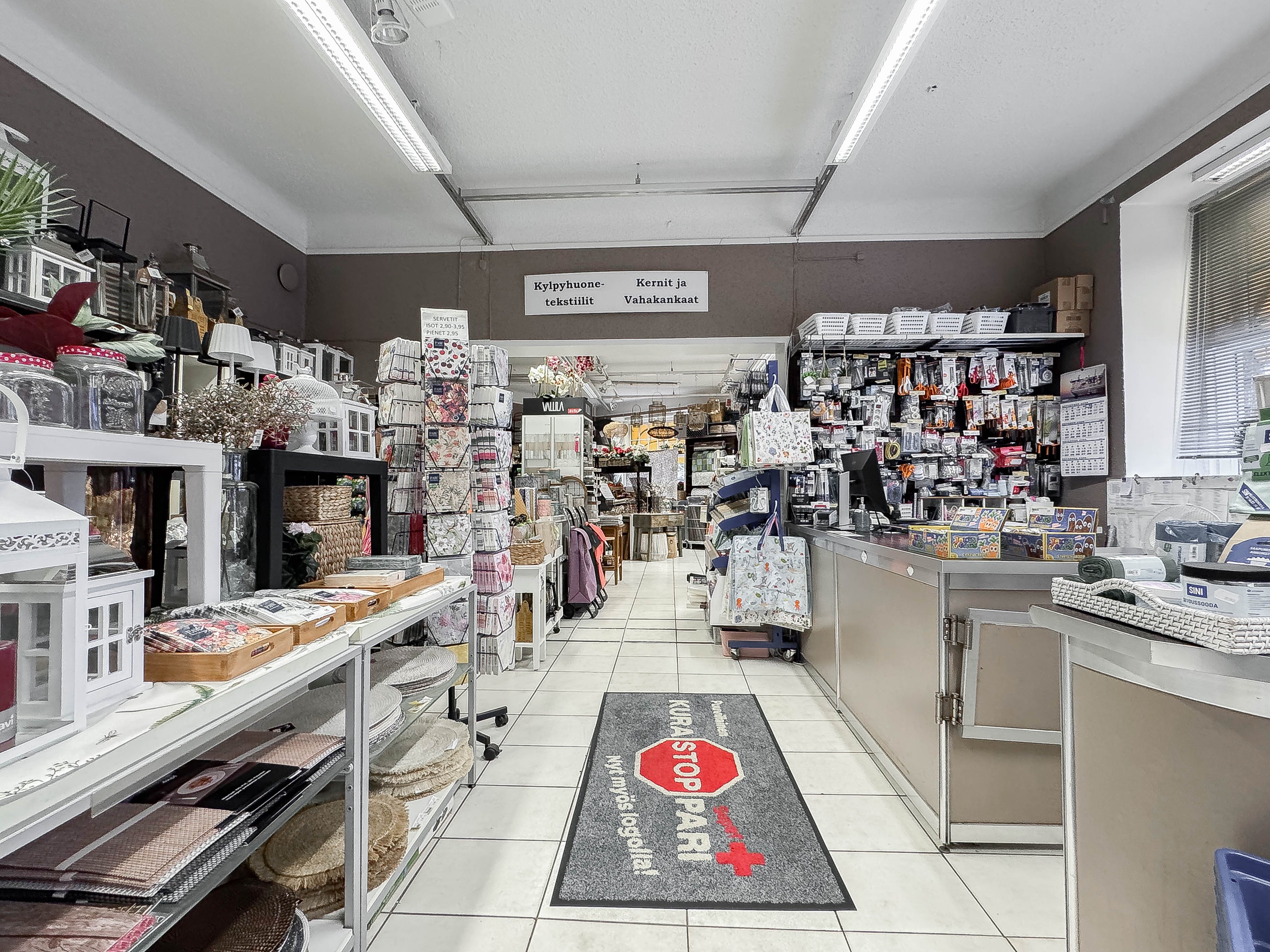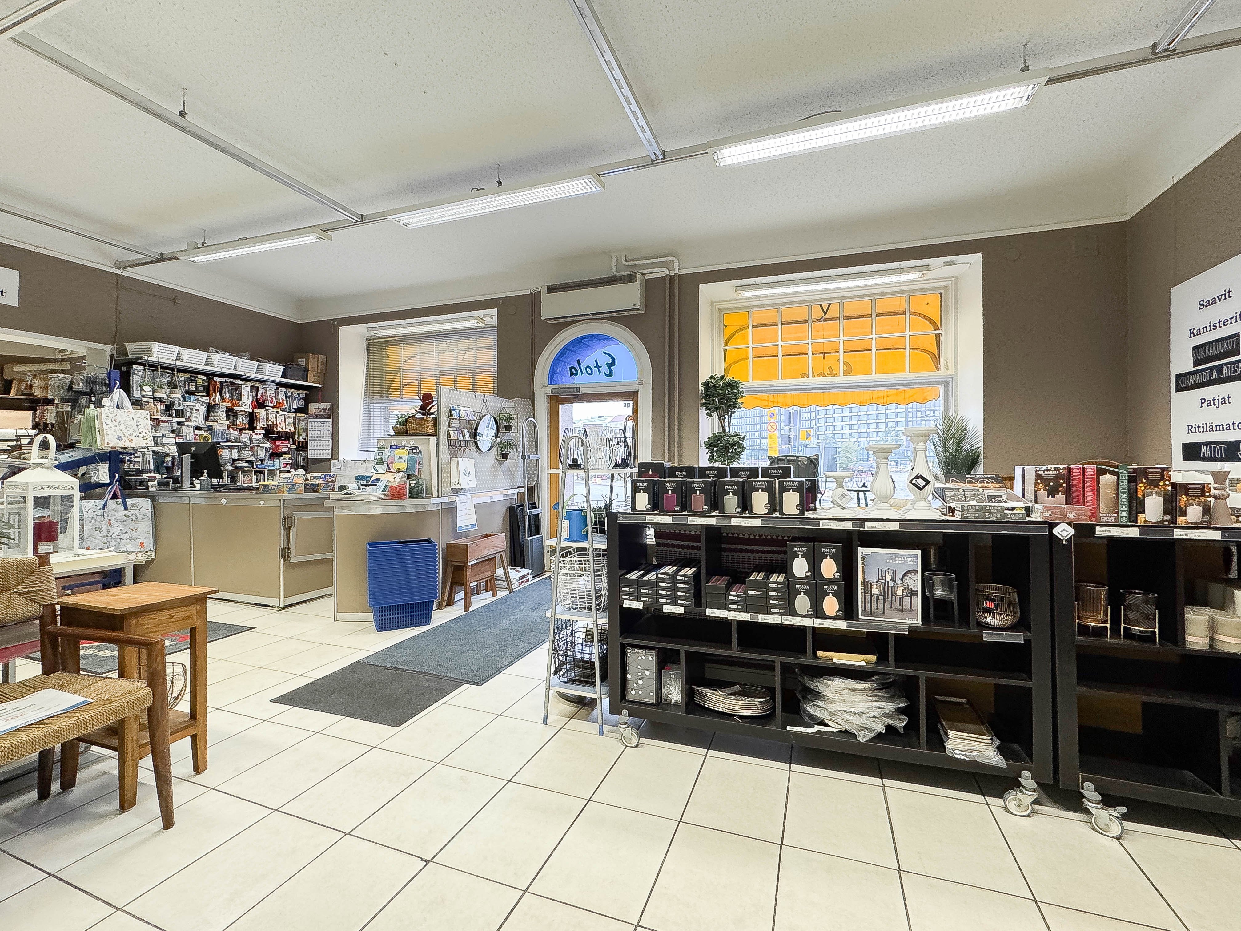 Tämä tila tarjoaa keskeisen ja näkyvän sijainnin. Toimitila pitää avaran pohjaratkaisun, joka tarjoaa mahdollisuuksia erilaisille sisustusratkaisuille. Sisääntulokerron on 215m2 ja se pitää sisällään yhtenäistä tilaa sekä pienen taukotilana toimineen tilan wc:n kera. Kellarikerroksessa on 141m2 varasto/kellaritilaa, joka muuntautuu hyvin eri tarkoituksiin, on ollut viime vuokralaisella osittain myymälätilana ja osittain varastotilana. Kellarikerroksessa lisäksi pieni erillinen huone, joka ollut toimistohuoneena.
