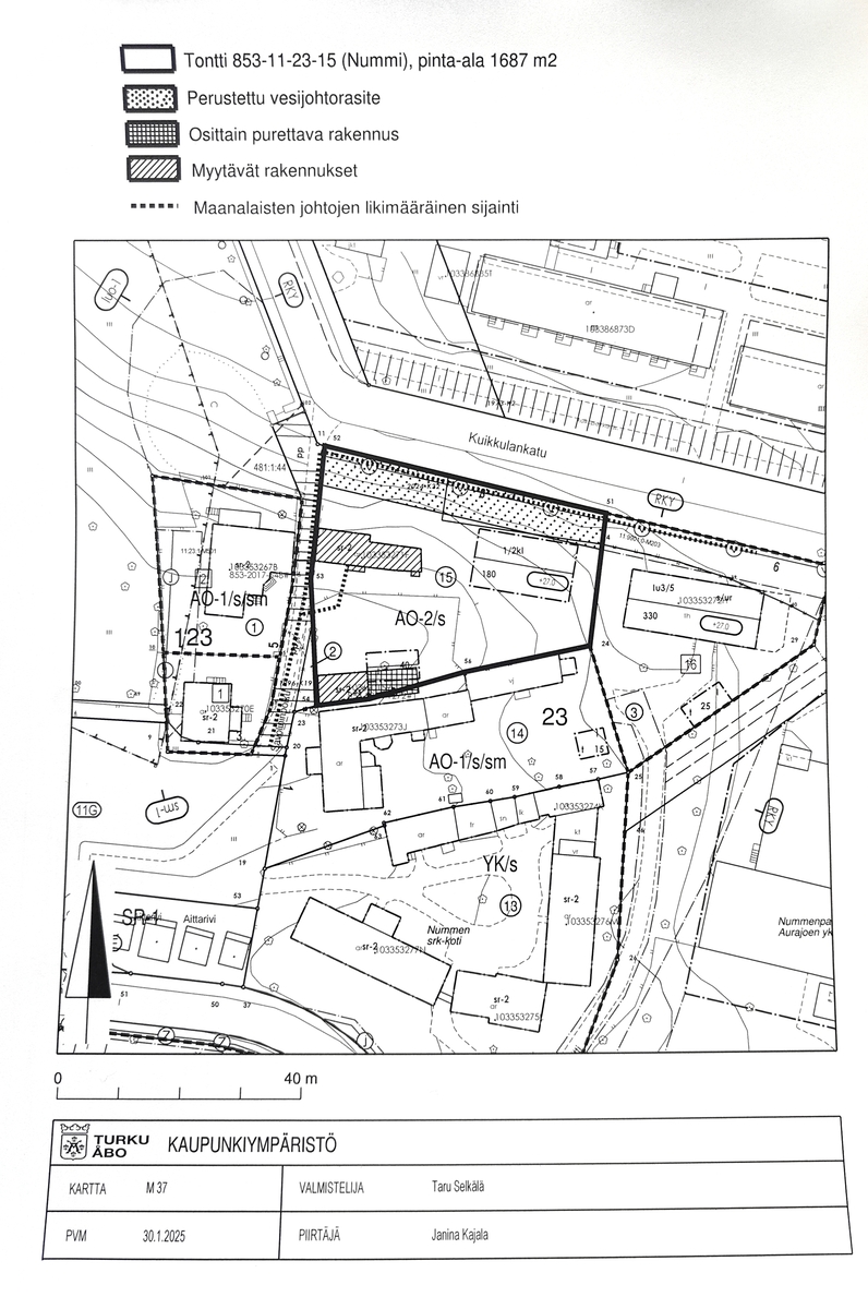 Turun kaupungin Nummen (11.) kaupunginosan korttelin 23. tontti 15, kiinteistötunnus 853-11-23-15, rakennuksineen ja laitteineen. Tontin 853-11-23-15 pinta-ala on 1687 m2. Kaupan kohteen osoite on Kuikkulankatu 8, 20540 Turku ja kohde on osoitettu kartalla M 37 / 30.1.2025.