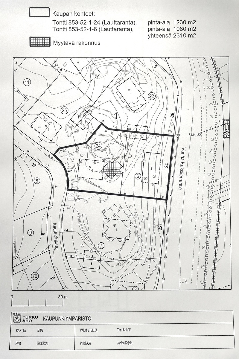 Turun kaupungin Lauttarannan (52.) kaupunginosan korttelin 1. tontti 24, kiinteistötunnus 853-52-1-24, rakennuksineen ja laitteineen sekä tontti 6, kiinteistötunnus 853-52-1-6. Tontin 853-52-1-24 pinta-ala on 1230 m2 ja tontin 853-52-1-6 pinta-ala on 1080 m². Kaupan kohteena on tontin 24 osalta koko kiinteistö rakennuksineen ja laitteineen ja tontin 6 osalta koko kiinteistö.