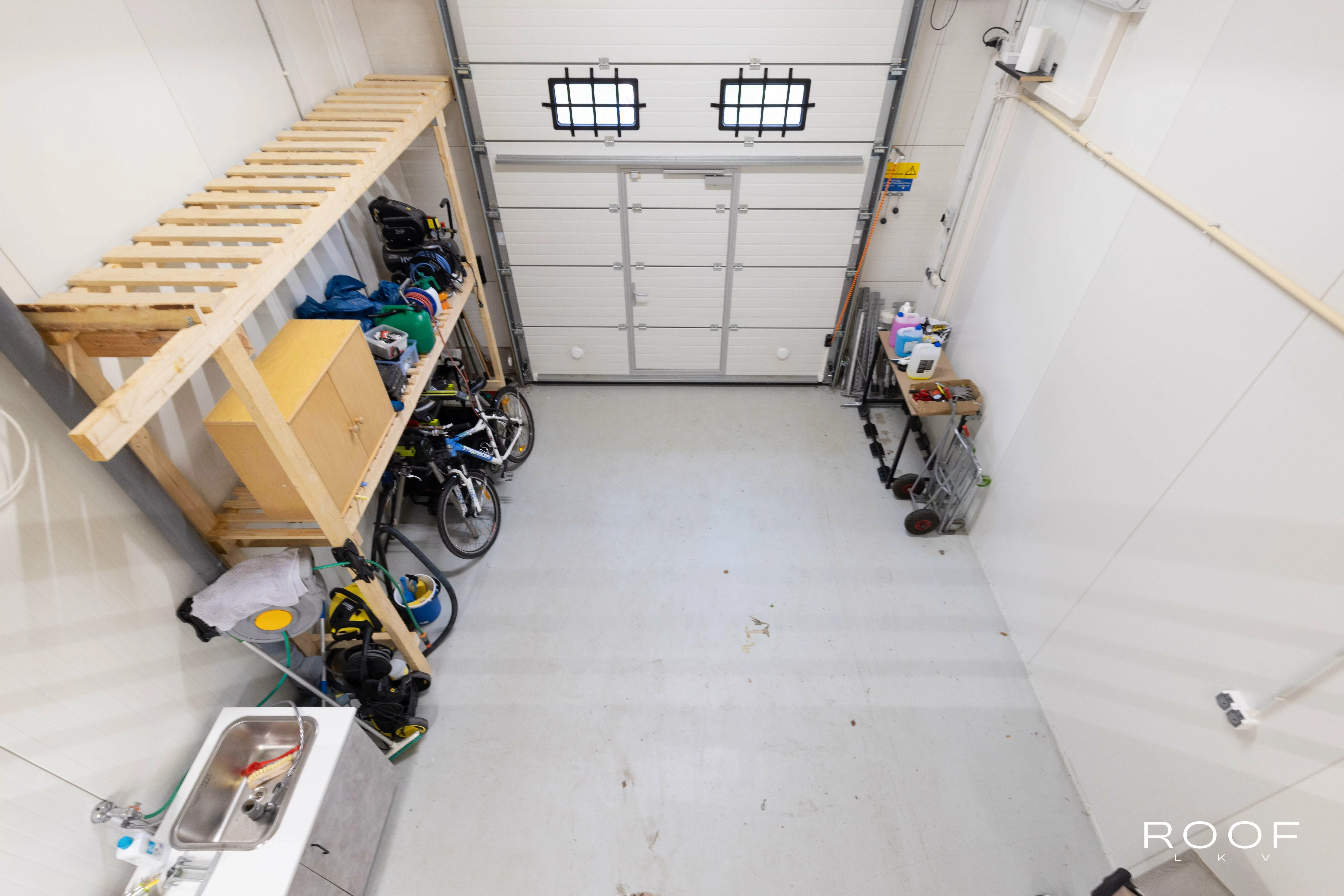 KARIS CENTRUM Garage, förråd eller mancave i en 2021 byggd hall. 41,2 m² + loft. Wc med varmvattenberedare, lyftdörr med elmotor, golvvärme, luftvärmepump och kraftströmsuttag. Dörröppning ca 3,3 meter hög och 3 meter bred.